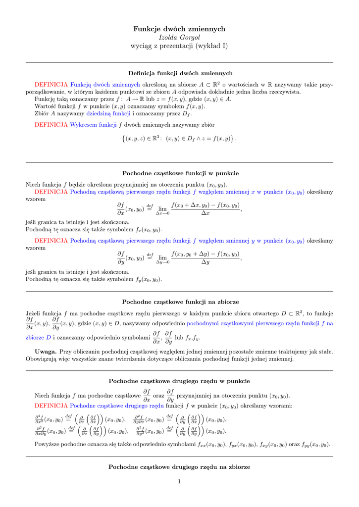 Funkcje dwóch zmiennych Izolda Gorgol wyciąg z prezentacji