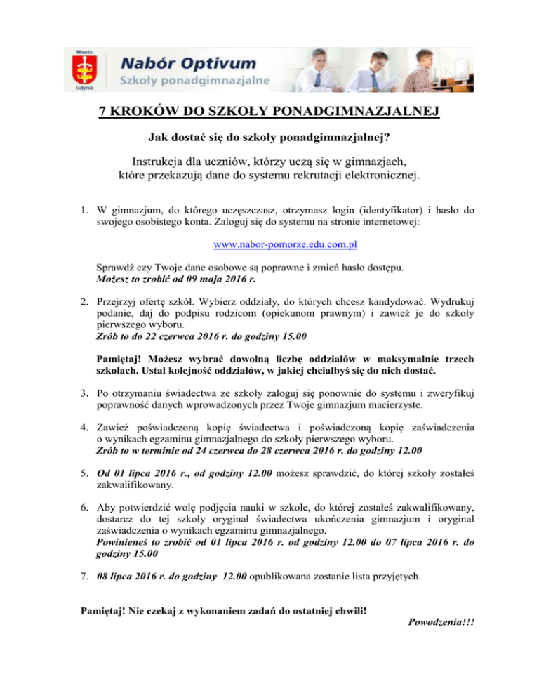 7 KROKÓW DO SZKOŁY PONADGIMNAZJALNEJ Jak dostać się do szkoły ponadgimnazjalnej? Instrukcja dla uczniów, którzy uczą się w gimnazjach, które przekazują dane do systemu rekrutacji elektronicznej. 1. W gimnazjum, do którego uczęszczasz, otrzymasz login (identyfikator) i hasło do swojego osobistego konta. Zaloguj się do systemu na stronie internetowej: www.nabor-pomorze.edu.com.pl Sprawdź czy Twoje dane osobowe są poprawne i zmień hasło dostępu. Możesz to zrobić od 09 maja 2016 r. 2. Przejrzyj ofertę szkół. Wybierz oddziały, do których chcesz kandydować. Wydrukuj podanie, daj do podpisu rodzicom (opiekunom prawnym) i zawieź je do szkoły pierwszego wyboru. Zrób to do 22 czerwca 2016 r. do godziny 15.00 Pamiętaj! Możesz wybrać dowolną liczbę oddziałów w maksymalnie trzech szkołach. Ustal kolejność oddziałów, w jakiej chciałbyś się do nich dostać. 3. Po otrzymaniu świadectwa ze szkoły zaloguj się ponownie do systemu i zweryfikuj poprawność danych wprowadzonych przez Twoje gimnazjum macierzyste. 4. Zawieź poświadczoną kopię świadectwa i poświadczoną kopię zaświadczenia o wynikach egzaminu gimnazjalnego do szkoły pierwszego wyboru. Zrób to w terminie od 24 czerwca do 28 czerwca 2016 r. do godziny 12.00 5. Od 01 lipca 2016 r., od godziny 12.00 możesz sprawdzić, do której szkoły zostałeś zakwalifikowany. 6. Aby potwierdzić wolę podjęcia nauki w szkole, do której zostałeś zakwalifikowany, dostarcz do tej szkoły oryginał świadectwa ukończenia gimnazjum i oryginał zaświadczenia o wynikach egzaminu gimnazjalnego. Powinieneś to zrobić od 01 lipca 2016 r. od godziny 12.00 do 07 lipca 2016 r. do godziny 15.00 7. 08 lipca 2016 r. do godziny 12.00 opublikowana zostanie lista przyjętych. Pamiętaj! Nie czekaj z wykonaniem zadań do ostatniej chwili! Powodzenia!!!