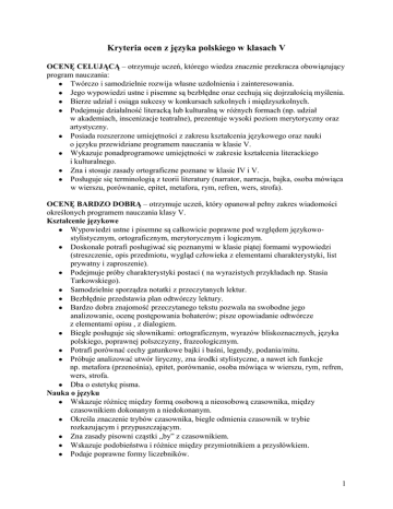 Kryteria ocen z języka polskiego w klasach V OCENĘ CELUJĄCĄ – otrzymuje uczeń, którego wiedza znacznie przekracza obowiązujący program nauczania: Twórczo i samodzielnie rozwija własne uzdolnienia i zainteresowania. Jego wypowiedzi ustne i pisemne są bezbłędne oraz cechują się dojrzałością myślenia. Bierze udział i osiąga sukcesy w konkursach szkolnych i międzyszkolnych. Podejmuje działalność literacką lub kulturalną w różnych formach (np. udział w akademiach, inscenizacje teatralne), prezentuje wysoki poziom merytoryczny oraz artystyczny. Posiada rozszerzone umiejętności z zakresu kształcenia językowego oraz nauki o języku przewidziane programem nauczania w klasie V. Wykazuje ponadprogramowe umiejętności w zakresie kształcenia literackiego i kulturalnego. Zna i stosuje zasady ortograficzne poznane w klasie IV i V. Posługuje się terminologią z teorii literatury (narrator, narracja, bajka, osoba mówiąca w wierszu, porównanie, epitet, metafora, rym, refren, wers, strofa). OCENĘ BARDZO DOBRĄ – otrzymuje uczeń, który opanował pełny zakres wiadomości określonych programem nauczania klasy V. Kształcenie językowe Wypowiedzi ustne i pisemne są całkowicie poprawne pod względem językowostylistycznym, ortograficznym, merytorycznym i logicznym. Doskonale potrafi posługiwać się poznanymi w klasie piątej formami wypowiedzi (streszczenie, opis przedmiotu, wygląd człowieka z elementami charakterystyki, list prywatny i zaproszenie). Podejmuje próby charakterystyki postaci ( na wyrazistych przykładach np. Stasia Tarkowskiego). Samodzielnie sporządza notatki z przeczytanych lektur. Bezbłędnie przedstawia plan odtwórczy lektury. Bardzo dobra znajomość przeczytanego tekstu pozwala na swobodne jego analizowanie, ocenę postępowania bohaterów; pisze opowiadanie odtwórcze z elementami opisu , z dialogiem. Biegle posługuje się słownikami: ortograficznym, wyrazów bliskoznacznych, języka polskiego, poprawnej polszczyzny, frazeologicznym. Potrafi porównać cechy gatunkowe bajki i baśni, legendy, podania/mitu. Próbuje analizować utwór liryczny, zna środki stylistyczne, a nawet ich funkcje np. metafora (przenośnia), epitet, porównanie, osoba mówiąca w wierszu, rym, refren, wers, strofa. Dba o estetykę pisma. Nauka o języku Wskazuje różnicę między formą osobową a nieosobową czasownika, między czasownikiem dokonanym a niedokonanym. Określa znaczenie trybów czasownika, biegle odmienia czasownik w trybie rozkazującym i przypuszczającym. Zna zasady pisowni cząstki „by” z czasownikiem. Wskazuje podobieństwa i różnice między przymiotnikiem a przysłówkiem. Podaje poprawne formy liczebników. 1 Wyróżnia w zdaniu zespoły składniowe i nazywa je. Przeprowadza klasyfikację zdań złożonych współrzędnie i podrzędnie; sporządza wykresy do zdań współrzędnie i podrzędnie złożonych. Wskazuje różnicę między samogłoską i spółgłoską. Omawia zależność brzmienia głoski od ruchów i pozycji narządów mowy; określa spółgłoski. Podaje zasady akcentowania wyrazów w języku polskim oraz zasady wymawiania wyrazów bezakcentowych. Poprawność ortograficzna Zna i stosuje zasady ortograficzne poznane w klasie IV i V. Pisownia u, ó, rz, ż, h, ch. Wyrazy, w których zachodzi zjawisko ubezdźwięcznienia i udźwięcznienia. Różne formy liczebników prostych i złożonych. Zakończenie bezokoliczników. Znaki interpunkcyjne w wypowiedzi. Zwroty grzecznościowe, wielkie litery – rzeczowniki własne. Sprawdza prace pisemne w celu znalezienia pomyłek. Formy czasu przeszłego zacząć i wziąć. Przymiotniki złożone. OCENĘ DOBRĄ – otrzymuje uczeń, który opanował wiadomości i umiejętności przewidziane programem nauczania w klasie V. Kształcenie językowe Czyta poprawnie, stosując zasady prawidłowej intonacji i akcentowania. Jego wypowiedzi ustne i pisemne mogą zawierać jedynie nieliczne błędy językowostylistyczne, logiczne, ortograficzne. Potrafi samodzielnie poprawiać większość swoich błędów. Podejmuje próby wypowiadania się w formach trudniejszych niż określone podstawą programową (opowiadania, opis postaci z elementami charakterystyki). W wypowiedziach próbuje oceniać i wartościować problemy języka, literatury oraz kultury. Nazywa cechy gatunkowe mitu, legendy, bajki. Poprawnie sporządza plan ramowy i szczegółowy lektury. Próbuje określić funkcje środków stylistycznych w utworze lirycznym. Samodzielnie posługuje się słownikami: ortograficznym, wyrazów bliskoznacznych, języka polskiego, frazeologicznym. Nauka o języku Określa formę gramatyczną czasowników. Stosuje w zdaniu czasownik w formie osobowej i nieosobowej. Tworzy czasownik dokonany od niedokonanego, wyróżnia cząstkę, za pomocą której tworzy ten czasownik. Poprawnie odmienia czasownik typu: umiem, rozumiem. Omawia budowę form trybu rozkazującego i przypuszczającego. Wyjaśnia różnice w odmianie rzeczowników, wyodrębnia temat i końcówkę. Uzasadnia pisownię rzeczownika, odwołując się do jego odmiany. W zdaniu wskazuje przyimki i wyrażenia przyimkowe, nazywa ich rolę w zdaniu. Tworzy przysłówki od przymiotników, stosuje je w zdaniach i określa ich rolę. Określa formę gramatyczną przymiotnika z rzeczownikiem. 2 Zastępuje słowem liczebniki podane cyfrą i odwrotnie. Stosuje w zdaniu liczebnik w odpowiednim przypadku. Przekształca zdanie w równoważnik zdania i odwrotnie. Podaje przykład współrzędnego zespołu składniowego. Robi wykres zdania pojedynczego rozwiniętego ( na łatwych przykładach). Przekształca zdanie pojedyncze w zdanie złożone i odwrotnie. Układa zdanie złożone współrzędnie i podrzędnie. Określa cechy głoski. Rozpoznaje wyrazy bezakcentowe. Poprawnie akcentuje wyrazy na trzeciej i czwartej sylabie od końca. Poprawność ortograficzna Zna i stosuje zasady ortograficzne poznane w klasie IV i V. Pisownia u, ó, rz, ż, h,