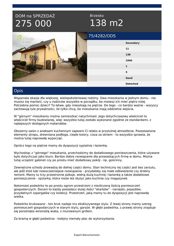 DOM na SPRZEDAŻ 275 000 Brzesko 138 m2 75/4282/ODS Secondary 11 138 1940 1 5 Good Detached Opis Wspaniała okazja dla większej, wielopokoleniowej rodziny. Dwa mieszkania w jednym domu - nie musisz się martwić, czy u rodziców wszystko w porządku, bo możesz ich mieć piętro niżej. Potrzebna pomoc dzieci? To łatwe, gdy mieszkają na piętrze. Do tego - co bardzo ważne - wszyscy zachowują tyle prywatności, ile tylko chcą, bo mieszkania mają oddzielne wejścia. W "górnym" mieszkaniu można zamieszkać natychmiast. Jego dotychczasowy właściciel to właściciel firmy budowlanej, więc wszystko tutaj zostało wykonane zgodnie ze standardami, z najlepszych dostępnych materiałów. Obszerny salon z aneksem kuchennym zapewni Ci relaks w przytulnej atmosferze. Pozostawione elementy stropu, drewniana podłoga, ciepłe kolory, cisza za oknem - to wszystko sprawia, że można tutaj naprawdę wypocząć. Oprócz tego na piętrze mamy do dyspozycji sypialnię i łazienkę. Wychodząc z "górnego" mieszkania, przechodzimy do dodatkowego pomieszczenia, które używane było dotychczas jako biuro. Bardzo dobre rozwiązanie dla prowadzących firmę w domu. Można tutaj urządzić gabinet czy po prostu mieć dodatkowy pokój - np. gościnny. Zewnętrzne schody prowadzą do dolnej części domu. Stan techniczny tej części jest bez zarzutu, ale jeśli ktoś lubi nowocześniejsze rozwiązania - przydałoby się małe odświeżenie czy drobny remont. Mamy tu trzy przestronne pokoje, widną dużą kuchnię i łazienkę a także dodatkowe pomieszczenie - spiżarkę, która może też służyć jako kuchnia czy magazynek. Natomiast podwórko to po prostu ogrom przestrzeni z niezliczoną ilością pomieszczeń gospodarczych. Doceni to każdy posiadacz dużej ilości "skarbów" - narzędzi, pojazdów, przydatnych szpargałów czy kolekcji. Przestrzeń, jaką mamy tu do dyspozycji jest naprawdę wielka. Podwórko brukowane - ten bruk nadaje mu ekskluzywnego stylu. Z lewej strony mamy szereg pomieszczeń gospodarczych w starym stylu, garaże. W głębi podwórka, z prawej strony znajduje się porośnięta winoroślą wiata, z murowanym grillem. Za bramą w głębi podwórza - kolejny niemały plac do wykorzystania. Expert Nieruchomości Podsumowując: - Idealny dom dla dużej lub wielopokoleniowej rodziny, - Wymarzony do prowadzenia zdalnej działalności (biuro, handel online itp.), - Dwa odrębne mieszkania, - Mnóstwo dodatkowych pomieszczeń gospodarczych, - Wielkie podwórko i działka. Zapraszam na prezentację - dzwoń bezpośrednio na nr 793 49 55 53. EXPERT Nieruchomości: sprawdzone, solidne biuro któremu możesz zaufać. Przeprowadzamy klienta przez kupno/sprzedaż/wynajem nieruchomości szybko, łatwo i bezpiecznie. www.nieruchomosciexpert.pl Oddział Stargard ul. Wyszyńskiego 19B, tel. 91 573 25 51 Oddział Pyrzyce ul. Dworcowa 23, tel. 91 831 43 95 Opis nieruchomości ma charakter wyłącznie informacyjny i może podlegać aktualizacji. Powyższy opis nieruchomości nie stanowi oferty określonej w art. 66 Kodeksu Cywilnego a jedynie zaproszenie do rokowań - zgodnie z art. 71 K.C. Paweł Burda tel. 793495553 email: [email protected] Expert Nieruchomości Powered by TCPDF (www.tcpdf.org)