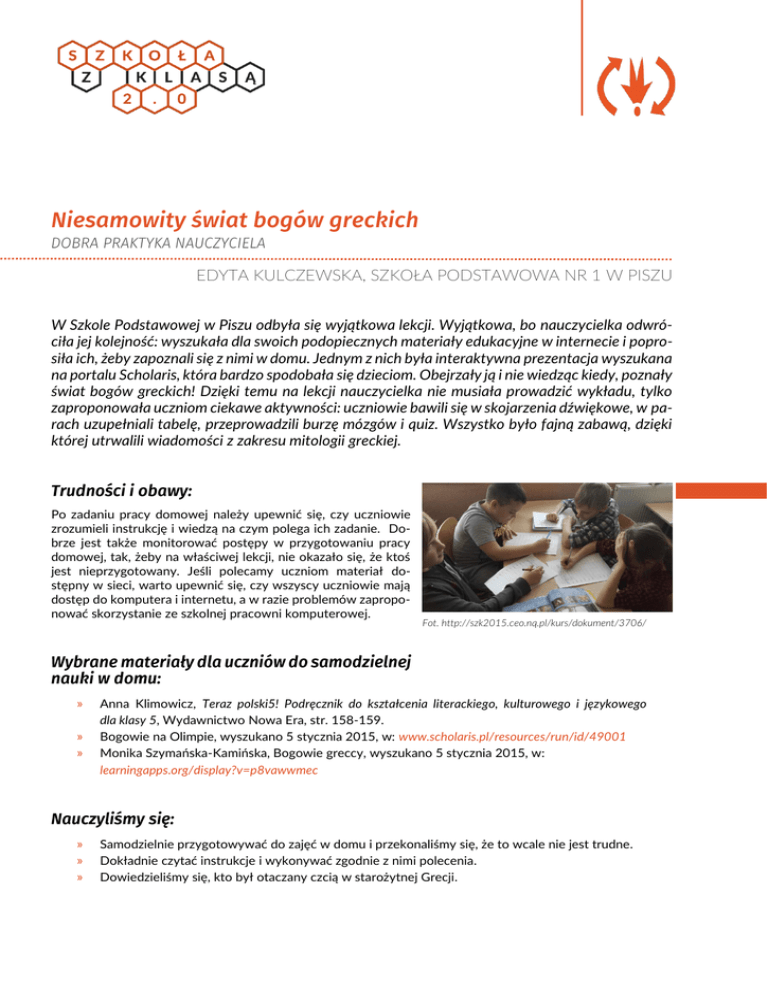 EDYTA KULCZEWSKA, SZKOŁA PODSTAWOWA NR 1 W PISZU W Szkole Podstawowej w Piszu odbyła się wyjątkowa lekcji. Wyjątkowa, bo nauczycielka odwróciła jej kolejność: wyszukała dla swoich podopiecznych materiały edukacyjne w internecie i poprosiła ich, żeby zapoznali się z nimi w domu. Jednym z nich była interaktywna prezentacja wyszukana na portalu Scholaris, która bardzo spodobała się dzieciom. Obejrzały ją i nie wiedząc kiedy, poznały świat bogów greckich! Dzięki temu na lekcji nauczycielka nie musiała prowadzić wykładu, tylko zaproponowała uczniom ciekawe aktywności: uczniowie bawili się w skojarzenia dźwiękowe, w parach uzupełniali tabelę, przeprowadzili burzę mózgów i quiz. Wszystko było fajną zabawą, dzięki której utrwalili wiadomości z zakresu mitologii greckiej. Po zadaniu pracy domowej należy upewnić się, czy uczniowie zrozumieli instrukcję i wiedzą na czym polega ich zadanie. Dobrze jest także monitorować postępy w przygotowaniu pracy domowej, tak, żeby na właściwej lekcji, nie okazało się, że ktoś jest nieprzygotowany. Jeśli polecamy uczniom materiał dostępny w sieci, warto upewnić się, czy wszyscy uczniowie mają dostęp do komputera i internetu, a w razie problemów zaproponować skorzystanie ze szkolnej pracowni komputerowej. » » » » » » Fot. http://szk2015.ceo.nq.pl/kurs/dokument/3706/ Anna Klimowicz, Teraz polski5! Podręcznik do kształcenia literackiego, kulturowego i językowego dla klasy 5, Wydawnictwo Nowa Era, str. 158-159. Bogowie na Olimpie, wyszukano 5 stycznia 2015, w: www.scholaris.pl/resources/run/id/49001 Monika Szymańska-Kamińska, Bogowie greccy, wyszukano 5 stycznia 2015, w: learningapps.org/display?v=p8vawwmec Samodzielnie przygotowywać do zajęć w domu i przekonaliśmy się, że to wcale nie jest trudne. Dokładnie czytać instrukcje i wykonywać zgodnie z nimi polecenia. Dowiedzieliśmy się, kto był otaczany czcią w starożytnej Grecji. „Uczniowie dobrze poradzili sobie z zaplanowanymi zadaniami. Do przygotowania zajęć wykorzystałam prezentację wyszukaną na portalu dla nauczycieli Scholaris. Uczniowie byli bardzo zainteresowani taką formą przekazania wiedzy. Prawie wszyscy wykonali także zadanie na platformie LearningApps (polegało na połączeniu wizerunków bogów z ich nazwami). Uczniowie byli zaangażowani w tok zajęć, zakładane cele udało się zrealizować, quiz mitologiczny wzbudził wiele emocji. Wszystkie grupy wywiązały się ze swych zadań.” Więcej informacji o zadaniu znajdziecie w jego opisie na platformie programu: http://szk2015.ceo.nq.pl/kurs/dokument/3706/