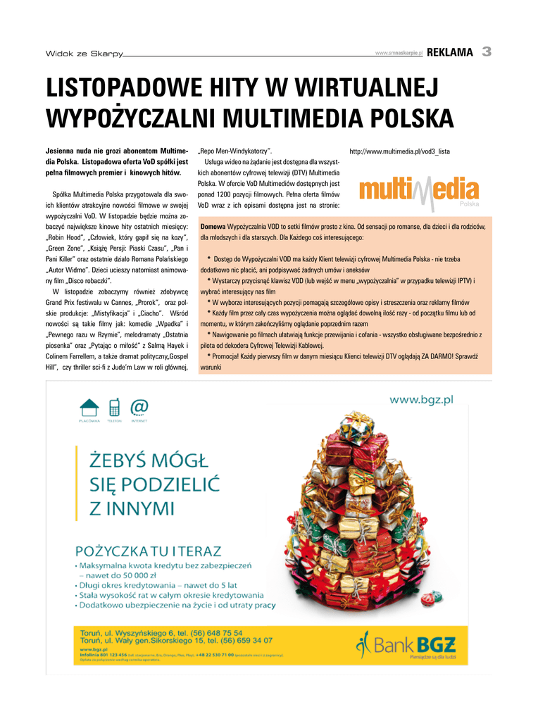 Widok ze Skarpy www.smnaskarpie.pl reklama 3 Listopadowe hity w wirtualnej wypożyczalni Multimedia Polska Jesienna nuda nie grozi abonentom Multimedia Polska. Listopadowa oferta VoD spółki jest pełna filmowych premier i kinowych hitów. Spółka Multimedia Polska przygotowała dla swoich klientów atrakcyjne nowości filmowe w swojej wypożyczalni VoD. W listopadzie będzie można zobaczyć największe kinowe hity ostatnich miesięcy: „Robin Hood”, „Człowiek, który gapił się na kozy”, „Green Zone”, „Książę Persji: Piaski Czasu”, „Pan i Pani Killer” oraz ostatnie działo Romana Polańskiego „Autor Widmo”. Dzieci ucieszy natomiast animowany film „Disco robaczki”. W listopadzie zobaczymy również zdobywcę Grand Prix festiwalu w Cannes, „Prorok”, oraz polskie produkcje: „Mistyfikacja” i „Ciacho”. Wśród nowości są takie filmy jak: komedie „Wpadka” i „Pewnego razu w Rzymie”, melodramaty „Ostatnia piosenka” oraz „Pytając o miłość” z Salmą Hayek i Colinem Farrellem, a także dramat polityczny„Gospel Hill”, czy thriller sci-fi z Jude’m Law w roli głównej, „Repo Men-Windykatorzy”. Usługa wideo na żądanie jest dostępna dla wszystkich abonentów cyfrowej telewizji (DTV) Multimedia Polska. W ofercie VoD Multimediów dostępnych jest ponad 1200 pozycji filmowych. Pełna oferta filmów VoD wraz z ich opisami dostępna jest na stronie: http://www.multimedia.pl/vod3_lista Domowa Wypożyczalnia VOD to setki filmów prosto z kina. Od sensacji po romanse, dla dzieci i dla rodziców, dla młodszych i dla starszych. Dla Każdego coś interesującego: * Dostęp do Wypożyczalni VOD ma każdy Klient telewizji cyfrowej Multimedia Polska - nie trzeba dodatkowo nic płacić, ani podpisywać żadnych umów i aneksów * Wystarczy przycisnąć klawisz VOD (lub wejść w menu „wypożyczalnia” w przypadku telewizji IPTV) i wybrać interesujący nas film * W wyborze interesujących pozycji pomagają szczegółowe opisy i streszczenia oraz reklamy filmów * Każdy film przez cały czas wypożyczenia można oglądać dowolną ilość razy - od początku filmu lub od momentu, w którym zakończyliśmy oglądanie poprzednim razem * Nawigowanie po filmach ułatwiają funkcje przewijania i cofania - wszystko obsługiwane bezpośrednio z pilota od dekodera Cyfrowej Telewizji Kablowej. * Promocja! Każdy pierwszy film w danym miesiącu Klienci telewizji DTV oglądają ZA DARMO! Sprawdź warunki