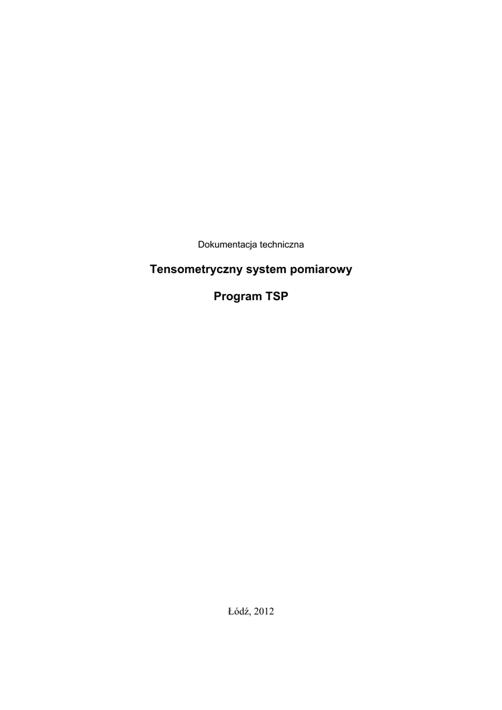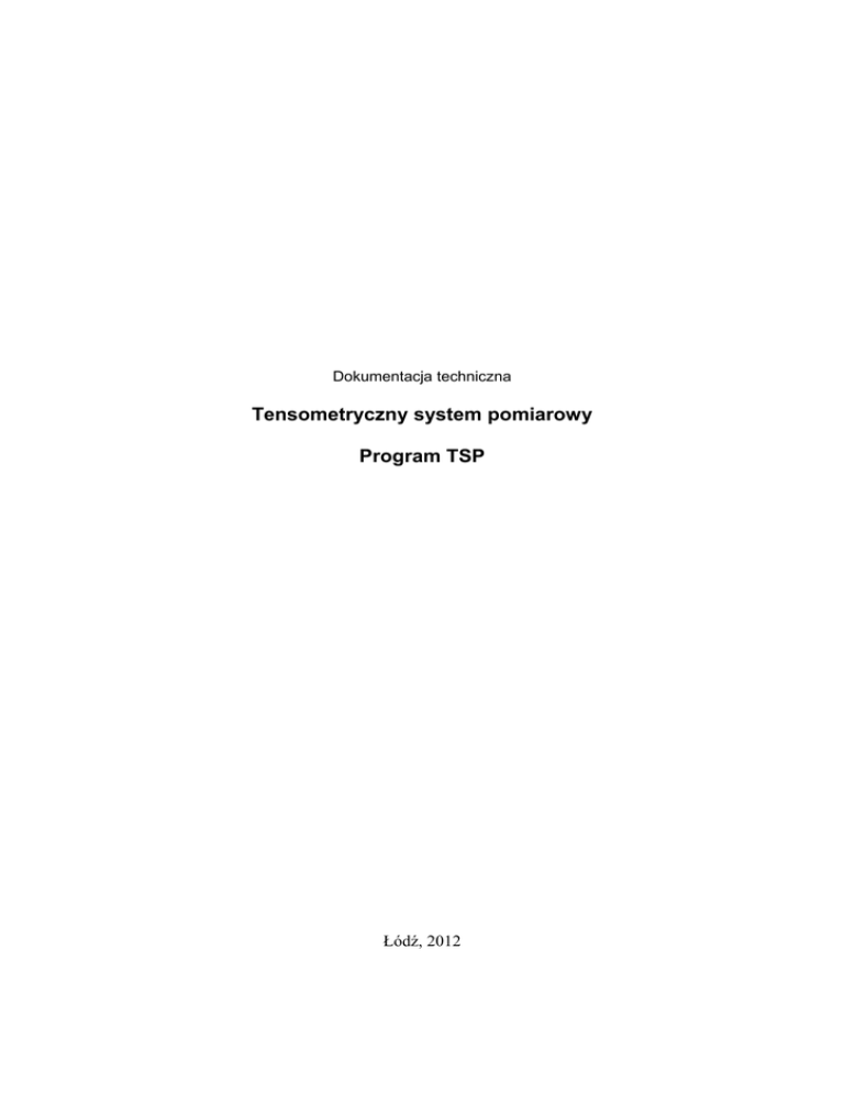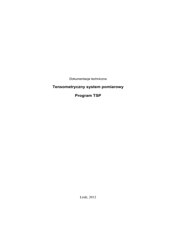Dokumentacja techniczna Tensometryczny system pomiarowy Program TSP Łódź, 2012 © Copyrighted Łódź 2012 Wszelkie prawa zastrzeżone. Nieautoryzowane rozpowszechnianie całości lub fragmentów niniejszej publikacji w jakiejkolwiek postaci zabronione. Wykonywanie kopii metodą kserograficzną, fotograficzną, a także kopiowanie na nośniku filmowym, magnetycznym lub innym powoduje naruszenie praw autorskich niniejszej publikacji. 2 Spis treści 1. Tensometryczny system pomiarowy Stretton 0204SE..........................................................................4 2. Specyfikacja techniczna........................................................................................................................4 3. Panel przedni i tylny systemu Stretton 0204SE....................................................................................5 4. Schemat podłączenia przetworników tensometrycznych......................................................................6 5. Uruchomienie urządzenia i postać ekranów interfejsu użytkownika....................................................7 6. Konfiguracja systemu pomiarowego.....................................................................................................8 6.1. Konfiguracja parametrów pracy systemu......................................................................................8 6.2. Konfiguracja parametrów kanału pomiarowego.........................................................................10 7. Współpraca z komputerem..................................................................................................................11 8. Oprogramowanie systemu pomiarowego............................................................................................12 8.1. Wymagania systemowe...............................................................................................................12 8.2. Instalacja środowiska uruchomieniowego...................................................................................12 8.3. Instalacja oprogramowania systemu pomiarowego.....................................................................12 9. Program „Tensometryczny system pomiarowy”.................................................................................12 9.1. Uruchamianie programu..............................................................................................................12 9.1.1. Rodzina systemów Microsoft Windows..............................................................................12 9.1.2. System Linux.......................................................................................................................12 9.2. Okno główne...............................................................................................................................13 9.3. Okno menu..................................................................................................................................15 9.4. Start programu.............................................................................................................................15 9.5. Dodawanie, usuwanie urządzenia, modyfikacja podstawowych parametrów............................15 9.5.1. Dodawanie urządzenia.........................................................................................................15 9.5.2. Usuwanie urządzenia...........................................................................................................16 9.5.3. Modyfikacja podstawowych parametrów urządzenia..........................................................16 9.5.4. Zapis/odczyt listy urządzeń.................................................................................................16 9.5.5. Zerowanie............................................................................................................................16 9.5.6. Zmiana adresu IP.................................................................................................................17 9.6. Parametry pomiaru, parametry kanałów pomiarowych...............................................................17 9.6.1. Konfiguracja kanałów pomiarowych...................................................................................17 9.6.2. Zapis/odczyt konfiguracji urządzenia..................................................................................18 9.7. Wykonywanie pomiarów.............................................................................................................18 9.7.1. Zapis danych do pliku..........................................................................................................19 9.8. Przeglądanie zapisanych pomiarów.............................................................................................19 9.9. Pliki konfiguracyjne aplikacji......................................................................................................19 10. Załącznik. Wymagane oświadczenie publiczne dotyczące oprogramowania używanego w tym produkcie, udostępnianego na podstawie licencji GPL/LGPL...............................................................20 3 1. Tensometryczny system pomiarowy Stretton 0204SE System pomiarowy Stretton 0204SE jest urządzeniem przeznaczonym do realizacji pomiarów odkształceń wykorzystujących czujniki tensometryczne. Urządzenie może współpracować maksymalnie z 4 czujnikami pracującymi w układzie pełnego mostka lub półmostka. Informacja pomiarowa prezentowana jest na wbudowanym wyświetlaczu ciekłokrystalicznym i może być przesyłana w sieci komputerowej wykorzystującej protokół TCP/IP do komputera klasy PC wyposażonym w dedykowane oprogramowanie. 2. Specyfikacja techniczna Typ mostka pomiarowego Liczba kanałów Napięcie zasilania mostka pomiarowego Rezystancja tensometrów mostka Jednostki pomiarowe Zakresy pomiarowe Częstotliwość próbkowania sygnału Zerowanie Dokładność p