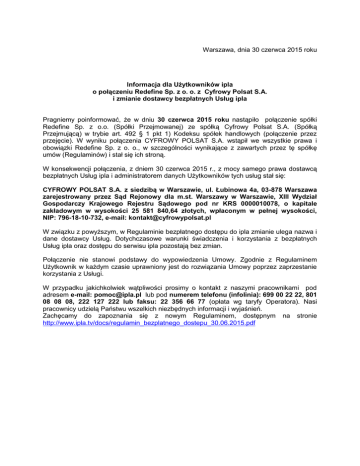 Warszawa, dnia 30 czerwca 2015 roku Informacja dla Użytkowników ipla o połączeniu Redefine Sp. z o. o. z Cyfrowy Polsat S.A. i zmianie dostawcy bezpłatnych Usług ipla Pragniemy poinformować, że w dniu 30 czerwca 2015 roku nastąpiło połączenie spółki Redefine Sp. z o.o. (Spółki Przejmowanej) ze spółką Cyfrowy Polsat S.A. (Spółką Przejmującą) w trybie art. 492 § 1 pkt 1) Kodeksu spółek handlowych (połączenie przez przejęcie). W wyniku połączenia CYFROWY POLSAT S.A. wstąpił we wszystkie prawa i obowiązki Redefine Sp. z o. o., w szczególności wynikające z zawartych przez tę spółkę umów (Regulaminów) i stał się ich stroną. W konsekwencji połączenia, z dniem 30 czerwca 2015 r., z mocy samego prawa dostawcą bezpłatnych Usług ipla i administratorem danych Użytkowników tych usług stał się: CYFROWY POLSAT S.A. z siedzibą w Warszawie, ul. Łubinowa 4a, 03-878 Warszawa zarejestrowany przez Sąd Rejonowy dla m.st. Warszawy w Warszawie, XIII Wydział Gospodarczy Krajowego Rejestru Sądowego pod nr KRS 0000010078, o kapitale zakładowym w wysokości 25 581 840,64 złotych, wpłaconym w pełnej wysokości, NIP: 796-18-10-732, e-mail: [email protected] W związku z powyższym, w Regulaminie bezpłatnego dostępu do ipla zmianie ulega nazwa i dane dostawcy Usług. Dotychczasowe warunki świadczenia i korzystania z bezpłatnych Usług ipla oraz dostępu do serwisu ipla pozostają bez zmian. Połączenie nie stanowi podstawy do wypowiedzenia Umowy. Zgodnie z Regulaminem Użytkownik w każdym czasie uprawniony jest do rozwiązania Umowy poprzez zaprzestanie korzystania z Usługi. W przypadku jakichkolwiek wątpliwości prosimy o kontakt z naszymi pracownikami pod adresem e-mail: [email protected] lub pod numerem telefonu (infolinia): 699 00 22 22, 801 08 08 08, 222 127 222 lub faksu: 22 356 66 77 (opłata wg taryfy Operatora). Nasi pracownicy udzielą Państwu wszelkich niezbędnych informacji i wyjaśnień. Zachęcamy do zapoznania się z nowym Regulaminem, dostępnym na stronie http://www.ipla.tv/docs/regulamin_bezplatnego_dostepu_30.06.2015.pdf