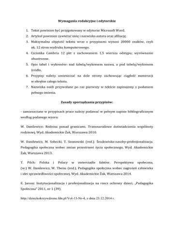 Wymagania redakcyjne i edytorskie 1. Tekst powinien być przygotowany w edytorze Microsoft Word. 2. Artykuł powinien zawierać imię i nazwisko autora oraz afiliację. 3. Maksymalna objętość tekstu wraz z przypisami wynosi 20000 znaków, czyli ok. 12 stron wydruku komputerowego. 4. Czcionka Cambria 12 pkt z zachowaniem 1,5 wiersza odstępu; wyrównanie obustronne. 5. Opis tabel i wykresów: nad tabelą/wykresem nazwa, a pod tabelą/wykresem źródło. 6. Przypisy należy umieszczać na dole strony zachowując ciągłość numeracji w obrębie całego tekstu. 7. Nazwiska osób przywołane po raz pierwszy w tekście zapisujemy z podaniem pełnego imienia. Zasady sporządzania przypisów: - zamieszczane w przypisach prace należy podawać w pełnym zapisie bibliograficznym według podanego wzoru: W. Danilewicz: Rodzina ponad granicami. Transnarodowe doświadczenia wspólnoty rodzinnej, Wyd. Akademickie Żak, Warszawa 2010. W. Danilewicz, M. Sobecki, T. Sosnowski (red.): Środowisko-zasoby-profesjonalizacja. Pedagogika społeczna wobec zmian przestrzeni życia społecznego, Wyd. Akademickie Żak, Warszawa 2013. T. Pilch: Polska i Polacy w zwierciadle faktów. Perspektywa społeczna, (w:) W. Danilewicz, W. Theiss (red.), Pedagogika społeczna wobec zagrożeń człowieka i idei sprawiedliwości społecznej, Wyd. Akademickie Żak, Warszawa 2014. E. Jarosz: Instytucjonalizacja i profesjonalizacja na rzecz ochrony dzieci, „Pedagogika Społeczna” 2011, nr 1 (39). http://dzieckokrzywdzone.fdn.pl/Vol-13-Nr-4, z dnia 23.12.2014 r.