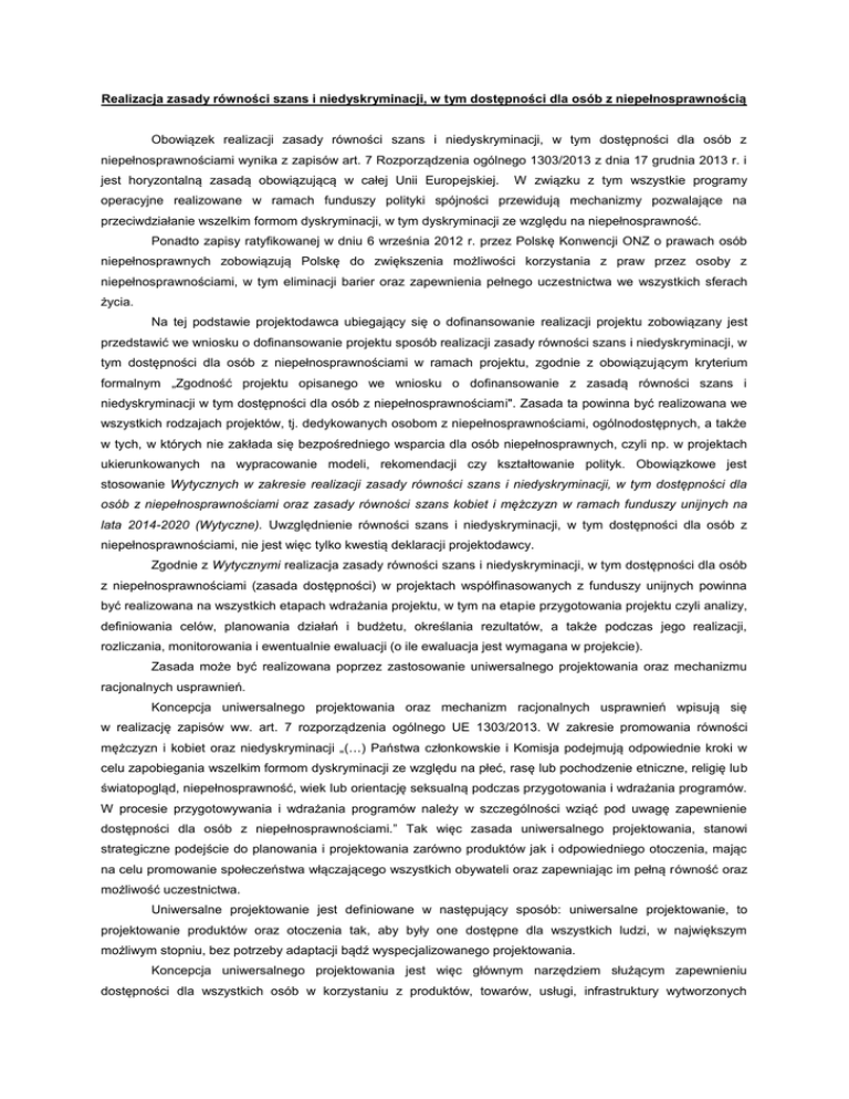 Realizacja zasady równości szans i niedyskryminacji, w tym dostępności dla osób z niepełnosprawnością Obowiązek realizacji zasady równości szans i niedyskryminacji, w tym dostępności dla osób z niepełnosprawnościami wynika z zapisów art. 7 Rozporządzenia ogólnego 1303/2013 z dnia 17 grudnia 2013 r. i jest horyzontalną zasadą obowiązującą w całej Unii Europejskiej. W związku z tym wszystkie programy operacyjne realizowane w ramach funduszy polityki spójności przewidują mechanizmy pozwalające na przeciwdziałanie wszelkim formom dyskryminacji, w tym dyskryminacji ze względu na niepełnosprawność. Ponadto zapisy ratyfikowanej w dniu 6 września 2012 r. przez Polskę Konwencji ONZ o prawach osób niepełnosprawnych zobowiązują Polskę do zwiększenia możliwości korzystania z praw przez osoby z niepełnosprawnościami, w tym eliminacji barier oraz zapewnienia pełnego uczestnictwa we wszystkich sferach życia. Na tej podstawie projektodawca ubiegający się o dofinansowanie realizacji projektu zobowiązany jest przedstawić we wniosku o dofinansowanie projektu sposób realizacji zasady równości szans i niedyskryminacji, w tym dostępności dla osób z niepełnosprawnościami w ramach projektu, zgodnie z obowiązującym kryterium formalnym „Zgodność projektu opisanego we wniosku o dofinansowanie z zasadą równości szans i niedyskryminacji w tym dostępności dla osób z niepełnosprawnościami". Zasada ta powinna być realizowana we wszystkich rodzajach projektów, tj. dedykowanych osobom z niepełnosprawnościami, ogólnodostępnych, a także w tych, w których nie zakłada się bezpośredniego wsparcia dla osób niepełnosprawnych, czyli np. w projektach ukierunkowanych na wypracowanie modeli, rekomendacji czy kształtowanie polityk. Obowiązkowe jest stosowanie Wytycznych w zakresie realizacji zasady równości szans i niedyskryminacji, w tym dostępności dla osób z niepełnosprawnościami oraz zasady równości szans kobiet i mężczyzn w ramach funduszy unijnych na lata 2014-2020 (Wytyczne). Uwzględnienie równości szans i niedyskryminacji, w tym dostępności dla osób z niepełnosprawnościami, nie jest więc tylko kwestią deklaracji projektodawcy. Zgodnie z Wytycznymi realizacja zasady równości szans i niedyskryminacji, w tym dostępności dla osób z niepełnosprawnościami (zasada dostępności) w projektach współfinasowanych z funduszy unijnych powinna być realizowana na wszystkich etapach wdrażania projektu, w tym na etapie przygotowania projektu czyli analizy, definiowania celów, planowania działań i budżetu, określania rezultatów, a także podczas jego realizacji, rozliczania, monitorowania i ewentualnie ewaluacji (o ile ewaluacja jest wymagana w projekcie). Zasada może być realizowana poprzez zastosowanie uniwersalnego projektowania oraz mechanizmu racjonalnych usprawnień. Koncepcja uniwersalnego projektowania oraz mechanizm racjonalnych usprawnień wpisują się w realizację zapisów ww. art. 7 rozporządzenia ogólnego UE 1303/2013. W zakresie promowania równości mężczyzn i kobiet oraz niedyskryminacji „(…) Państwa członkowskie i Komisja podejmują odpowiednie kroki w celu zapobiegania wszelkim formom dyskryminacji ze względu na płeć, rasę lub pochodzenie etniczne, religię lub światopogląd, niepełnosprawność, wiek lub orientację seksualną podczas przygotowania i wdrażania programów. W procesie przygotowywania i wdrażania programów należy w szczególności wziąć pod uwagę zapewnienie dostępności dla osób z niepełnosprawnościami.” Tak więc zasada uniwersalnego projektowania, stanowi strategiczne podejście do planowania i projektowania zarówno produktów jak i odpowiedniego otoczenia, mając na celu promowanie społeczeństwa włączającego wszystkich obywateli oraz zapewniając im pełną równość oraz możliwość uczestnictwa. Uniwersalne projektowanie jest definiowane w następujący sposób: uniwersalne projektowanie, to projektowanie produktów oraz otoczenia tak, aby były one dostępne dla wszystkich ludzi, w największym możliwym stopniu, bez potrzeby adaptacji bądź wyspecjalizowanego projektowania. Koncepcja uniwersalnego projektowania jest więc głównym narzędziem służącym zapewnieniu dostępności dla wszystkich osób w korzystaniu z produktów, towarów, usługi, infrastruktury wytworzonych z udziałem środków EFS. Np. infrastruktura wykorzystywana lub adaptowana na potrzeby projektu powinna, o ile jest to ekonomicznie uzasadnione, spełniać wymogi koncepcji uniwersalnego projektowania (w projektach współfinasowanych EFS będzie to dotyczyć wydatków ponoszonych w ramach cross-financingu). Nie zawsze ekonomicznie uzasadnione będzie dostosowanie np. miejsc realizacji projektu do potrzeb osób z niepełnosprawnościami. Czasem racjonalnym będzie wynajęcie pomieszczeń dostępnych dla osób z niepełnosprawnościami. Koncepcja uniwersalnego projektowania dotyczy natomiast bez wyjątku pozostałych elementów projektu takich jak np. przygotowanie materiałów promocyjnych, czy produktów wytworzonych w projekcie. Koszty związane z koncepcją uniwersalnego projektowania powinny zawierać się w budżecie projektu składanego do oceny. Drugim narzędziem służącym urzeczywistnieniu w ramach funduszy europejskich 2014-2020 pełnej dostępności w korzystaniu z projektów realizowanych z udziałem środków europejskich jest mechanizm racjonalnych usprawnień. Mechanizm ten jest definiowany, jako konieczne i odpowiednie zmiany oraz dostosowania, nienakładające nieproporcjonalnego lub nadmiernego obciążenia, rozpatrywane osobno dla każdego konkretnego przypadku, w celu zapewnienia osobom z niepełnosprawnościami możliwości korzystania z wszelkich praw człowieka i podstawowych wolności oraz ich wykonywania na zasadzie równości z innymi osobami. Mechanizm racjonalnych usprawnień to mechanizm uruchamiany dopiero w trakcie realizacji proje