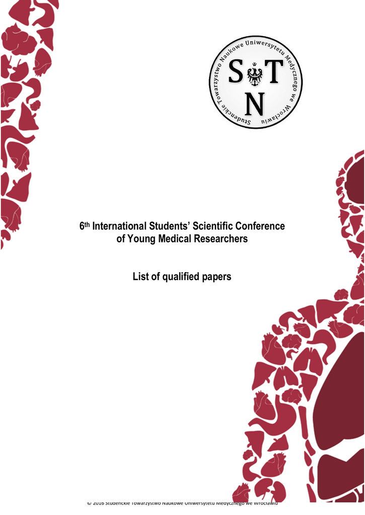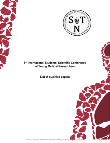 6th International Students’ Scientific Conference of Young Medical Researchers List of qualified papers © 2016 Studenckie Towarzystwo Naukowe Uniwersytetu Medycznego we Wrocławiu PUBLIC HEALTH AND SOCIAL MEDICINE SESSION (SESJA ZDROWIA PUBLICZNEGO I MEDYCYNY SPOŁECZNEJ) ORAL SESSION (SESJA USTNA) 1. Male look at women after mastectomy Agnieszka Badura ([email protected]) Tutor: dr Marta Curyło The University of Physical Education in Krakow 2. Alcohol - a real problem in the emergency department? Magdalena Domek ([email protected]), Katarzyna Dubielak, Ewa Olszańska, Michalina Drożdż Tutor: lek. med. Anna Markowicz Medical University of Silesia 3. Analysis of general awareness about the issue of testicular cancer in the male population Karol Dopierała ([email protected]), Aleksandra Rubin, Marcin Wasilewski, Paweł Poniatowski Tutor: dr n. med. Piotr Morasiewicz, lek. Grzegorz Szpotowicz Wroclaw Medical University 4. Medical care in elderly: functional ability and strength of lower extremities Agnieszka Gaczkowska ([email protected]), Olga Gawłowska Tutors: dr n. med. Adrianna Maria Borowicz Poznan University of Medical Sciences © 2016 Studenckie Towarzystwo Naukowe Uniwersytetu Medycznego we Wrocławiu 5. A national screening program for colorectal cancer in Poland- the analysis of factors determining appearance for colonoscopy Paulina Głowacka ([email protected]), Anna Kopeć, Aleksandra Staśkiewicz Tutor: dr n. med. Maria Janiak Medical University of Gdansk 6. Accessibilities for disabled persons in primary care units in Wroclaw Amelia Głowaczewska ([email protected]), Fryderyk Menzel Tutor: prof. dr hab. Krystyna Pawlas Wroclaw Medical University 7. The problem of consumption of the OTC pain drugs by students of the Upper Silesian agglomeration - preliminary study Klaudia Gut ([email protected]), Nicola Szeja Tutor: mgr inż. Alina Mroczek Medical University of Silesia 8. Prevalence of malnutrition on a surgical ward in different age groups evaluated by four different screening methods. A comparative analysis. Julia Iwanow ([email protected]), Andżelika Pajchert Tutor: dr n. med. Adam Skalski Wroclaw Medical University 9. Have you ever heard of the Zika? Medical university students’ knowledge on the Zika virus Jacek Jagiełło ([email protected]), Michalina Horochowska, Elżbieta Kołeczek, Mateusz Michalczyk Tutor: dr n. med. Małgorzata Fleischer Wroclaw Medical University © 2016 Studenckie Towarzystwo Naukowe Uniwersytetu Medycznego we Wrocławiu 10. Pills, potions or alchemy - how the alternative methods of selftreatment are practiced among the chronically ill patients Justyna Jeżewska ([email protected]) Tutor: dr Monika Wójta- Kempa Wroclaw Medical University 11. Dietary supplements used by physically active people Karolina Kucharska ([email protected]), Iwona Jarosińska Tutor: dr Ewa Sawicka Wroclaw Medical University 12. The knowledge of students about the dangers of solar radiation and about its prevention in practical circumstances Marta Laskowska ([email protected]) Tutor: dr hab. n. med. Adam Reich, prof. nadzw. Wroclaw Medical University 13. Refractive Errors Concern Among Polish students (RECAP study) Adrian Lis ([email protected]), Agata Lubańska, Maciej Klepuszewski Tutor: dr n. med. Małgorzata Piróg-Mulak Wroclaw Medical University 14. Do atopic diseases have influence on children's development? Comparison of anthropometric measurements between children with and without atopic diseases. Kamil Litwinowicz ([email protected]), Marcin Choroszy, Maciej Ornat, Mateusz Węgrzyn Tutor: dr n. med. Iwona Pirogowicz © 2016 Studenckie Towarzystwo Naukowe Uniwersytetu Medycznego we Wrocławiu Wroclaw Medical University 15. Vitamin D intake and serum level in children with pneumonia Marta Dochniak, Marzena Majchrowska ([email protected]) Tutors: dr Anna Prescha, dr Daiva Gorczyca Wroclaw Medical University 16. Do you know what you eat? Preservatives added to food - testing consumer awareness Joanna Roik ([email protected]), Anna Pawlik, Monika Gielniak Tutor: dr Ewa Sawicka Wroclaw Medical University 17. 3 Assessment of eating habits of children from primary schools grades 1- Martyna Skiba ([email protected]), Katarzyna Rozmysł Tutor: mgr inż. Dorota Różańska Wroclaw Medical University 18. Does the profile of the university determine the nutritional knowledge and eating habits of students? Katarzyna Skórska ([email protected]), Martyna Sołtysik Tutor: dr Joanna Pieczyńska Wroclaw Medical University 19. "Bank or not to bank?" - that is the question. A few words about awereness and women opinion about cord blood banking Daria Sowa ([email protected]), Anna Kubera, Barbara Wojszwiłło, Barbara Korczyńska, Patryk Szklarz Tutor: dr n. med. Wojciech Szanecki © 2016 Studenckie Towarzystwo Naukowe Uniwersytetu Medycznego we Wrocławiu Medical University of Silesia 20. Pap test in primary health care – patients’ point of view. A pilot study Monika Storman ([email protected]), Maria Widomska, Olga Lipińska Tutor: dr Anna Krztoń-Królewiecka, prof. UJ dr hab. Adam Windak Jagiellonian University Medical College 21. The role of a general practitioner in domestic violence - an observer, a participant or a judge? A physicians’s view Monika Storman ([email protected]), Anna Tarczyńska Tutors: dr Anna Krztoń-Królewiecka, prof. UJ dr hab. Adam Windak Jagiellonian University Medical College 22. Women's knowledge about supplementation of vitamins, macro- and micronutrients during pregnancy Anna Stysiał ([email protected]), Kinga Gajewska Tutor: dr n. med. Monika Przestrzelska, mgr Małgorzata Pałczyńska Wroclaw Medical University 23. The quality of life of women treated for breast cancer Nikodem Targosz ([email protected]), Agnieszka Lipska Tutor: dr n. med. Monika Ścibor Jagiellonian University Medical College 24. Analysis and evaluation of awareness level, basic knowledge and most commonly used sources of information concerning vaccination in the 