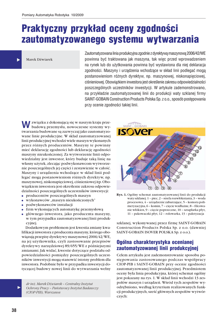 Pomiary Automatyka Robotyka 10/2009 Praktyczny przykład oceny zgodności zautomatyzowanego systemu wytwarzania Marek Dźwiarek Zautomatyzowana linia produkcyjna zgodnie z dyrektywą maszynową 2006/42/WE powinna być traktowana jak maszyna, tak więc przed wprowadzeniem na rynek lub do użytkowania powinna być wystawiona dla niej deklaracja zgodności. Maszyny i urządzenia wchodzące w skład linii podlegać mogą postanowieniom różnych dyrektyw, np. maszynowej, niskonapięciowej, ciśnieniowej. Obowiązkiem inwestora jest określenie zakresu odpowiedzialności poszczególnych uczestników inwestycji. W artykule zademonstrowano, na przykładzie zautomatyzowanej linii do produkcji waty szklanej firmy SAINT-GOBAIN Construction Products Polska Sp. z o.o., sposób postępowania przy ocenie zgodności takiej linii. związku z dokonującą się w naszym kraju przebudową przemysłu, nowoczesne systemy wytwarzania budowane są zazwyczaj jako zautomatyzowane linie produkcyjne. W skład zautomatyzowanej linii produkcyjnej wchodzi wiele maszyn wykonanych przez różnych producentów. Maszyny te powinny mieć deklarację zgodności lub deklarację zgodności maszyny nieukończonej. Za wytworzenie linii odpowiedzialny jest inwestor, który buduje taką linię na własny użytek, zlecając podwykonawcom wytworzenie poszczególnych jej części i zestawienie w całość. Maszyny i urządzenia wchodzące w skład linii podlegać mogą postanowieniom różnych dyrektyw, np. maszynowej, niskonapięciowej, ciśnieniowej itp. Obowiązkiem inwestora jest określenie zakresu odpowiedzialności poszczególnych uczestników inwestycji: producentów poszczególnych maszyn wykonawców „maszyn nieukończonych” podwykonawców instalacji firm wykonujących automatykę przemysłową głównego inwestora, jako producenta maszyny, w tym przypadku zautomatyzowanej linii produkcyjnej. Dodatkowym problemem jest kwestia zmiany kwalifikacji inwestora z producenta maszyny, którego obowiązują przepisy dyrektywy maszynowej 2006/42/WE, na jej użytkownika, czyli zastosowanie przepisów dyrektywy narzędziowej 89/655/WE z późniejszymi zmianami. Jak widać, kwestie dotyczące podziału odpowiedzialności pomiędzy poszczególnych uczestników inwestycji mogą stanowić istotny problem dla inwestora. Podobnie było w przypadku inwestycji dotyczącej budowy nowej linii do wytwarzania wełny 38 dr inż. Marek Dźwiarek – Centralny Instytut Ochrony Pracy – Państwowy Instytut Badawczy (CIOP-PIB), Warszawa Rys. 1. Ogólny schemat zautomatyzowanej linii do produkcji waty szklanej. 1 – piec, 2 – strefa rozwłókniania, 3 – woda procesowa, 4 – urządzenie zaburzające, 5 – komora polimeryzacyjna, 6 – komin, 7 – cięcie wzdłużne, 8 – filcowanie włókien, 9 – cięcie poprzeczne, 10 – sztaplarka płyt, 11 – pakowaczki płyt, 12 – rolowarka, 13 – paletyzacja szklanej, wykonywanej przez firmę SAINT-GOBAIN Construction Products Polska Sp. z o.o. (dawniej SAINT-GOBAIN ISOVER POLSKA Sp. z o.o.). Ogólna charakterystyka ocenianej zautomatyzowanej linii produkcyjnej Celem artykułu jest zademonstrowanie sposobu postępowania zastosowanego podczas współpracy CIOP-PIB i SAINT-GOBAIN przy ocenie zgodności zautomatyzowanej linii produkcyjnej. Przedmiotem oceny była linia produkcyjna, której schemat ogólny jest pokazany na rys. 1. W skład linii wchodzi 13 zespołów maszyn i urządzeń. Wśród tych zespołów wyodrębniono, według kryterium realizowanych funkcji produkcyjnych, sześć głównych zespołów wytwórczych: Pomiary Automatyka Robotyka 10/2009 gorący koniec obróbka kobierca formowanie kobierca zimny koniec przenośniki taśmowe stacja uzdatniania wody procesowej. W budowie linii uczestniczyło kilkanaście firm z całej Europy. Pomijając kwestie budowlane, byli to zazwyczaj różni producenci maszyn, a także wykonawcy instalacji oraz systemów automatyki. Podstawową kwestią było przypisanie zakresu odpowiedzialności poszczególnym wykonawcom. W tym celu należało jednoznacznie wyodrębnić poszczególne maszyny i urządzenia wchodzące w skład linii oraz zidentyfikować przepisy, które ich dotyczą. Punkt odniesienia stanowi w tym przypadku definicja maszyny wg dyrektywy maszynowej. Definicja maszyny według dyrektywy maszynowej Nowo budowana linia produkcyjna była przekazana do użytkowania w 2008 r., w czasie gdy obowiązywały przepisy Rozporządzenia [3] Ministra Gospodarki Pracy i Polityki Społecznej w sprawie zasadniczych wymagań dla maszyn i elementów bezpieczeństwa (wdrażające dyrektywę 98/37/WE), dlatego przy ocenie zgodności stosowane były przepisy tego rozporządzenia. Po 29 grudnia 2009 r. obowiązywać będą przepisy Rozporządzenia [4] Ministra Gospodarki w sprawie zasadniczych wymagań dla maszyn (wdrażające dyrektywę 2006/42/WE). Dlatego też przy analizie obowiązków inwestora linii zautomatyzowanej, której wprowadzanie do użytkowania przewidziane jest w 2010 r., należy stosować definicje zawarte w Rozporządzeniu [4]. Według Rozporządzenia [3] do maszyn zalicza się m.in.: a) zespół sprzężonych części lub elementów składowych, z których przynajmniej jeden jest ruchomy, wraz z odpowiednimi elementami uruchamiającymi, obwodami sterowania, zasilania, połączonych wspólnie w celu określonego zastosowania, w szczególności do przetwarzania, obróbki, przemieszczania lub pakowania materiałów b) zespół maszyn, które w celu osiągnięcia wspólnego efektu końcowego zostały zestawione i są sterowane w taki sposób, aby działały jako zintegrowana całość. Zapisy te dotyczą maszyn w ścisłym tego słowa znaczeniu, dlatego przywołujemy te zapisy, pomijając punkt c) w [3], który dotyczy wymiennego wyposażenia zmieniającego funkcje maszyny, gdyż w naszym przypadku nie miał on zastosowania. W Rozporządzeniu [4] definicje zostały przeformułowane na następujące: a) zespół wyposażony lub który można wyposaż