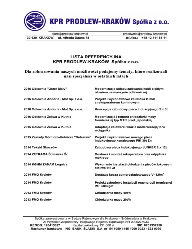 [email protected] 30-629 KRAKÓW ul. Alfreda Dauna 78 [email protected] tel./fax.: +48 12 411 81 11 LISTA REFERENCYJNA KPR PRODLEW-KRAKÓW Spółka z o.o. Dla zobrazowania naszych możliwości podajemy tematy, które realizowali nasi specjaliści w ostatnich latach 2016 Odlewnia "Orzeł Biały" Modernizacja układu zalewania kokil ciekłym ołowiem na maszynie odlewniczej 2016 Odlewnia Andoria - Mot Sp. z o.o. Projekt i wykonawstwo żeliwiaka Ø 850 z rekuperatorem kominowym 2016 Odlewnia Andoria - Mot Sp. z o.o. Koncepcja zabudowy pieca indukcyjnego 2 x 3t 2016 Odlewnia Żeliwa w Kutnie Modernizacja i remont chłodziarki masy formierskiej typ MTC prod. japońskiej 2015 Odlewnia Żeliwa w Kutnie Adaptacja zalewarki wraz z modernizacją toru wciągnika 2015 Zakłady Górniczo-Hutnicze "Bolesław" Projekt i wykonawstwo nowego pieca indukcyjnego kanałowego PIK 30t Zn 2014 Teksid Skoczów Zabudowa pieca indukcyjnego JUNKER 2 x 12t 2014 ZETKAMA Ścinawka Śr. Dostawa i montaż rekuperatora oraz odpylnika mokrego 2014 KGHM ZANAM Legnica Wykonanie instalacji chłodzenia pieców łukowych staliwa 6t i 3t 2014 FMO Kraków Dostawa kosza samorozładowczego V=1,5m3 2014 FMO Kraków Projekt zabudowy instalacji regeneracji termicznej IMF 500kg/h 2013 FMO Kraków Chłodziarka masy 40t/h 2013 FMO Kraków Chłodziarka masy 20t/h __________________________________________________________ Spółka zarejestrowana w Sądzie Rejonowym dla Krakowa – Śródmieścia w Krakowie, XI Wydział Gospodarczy Krajowego Rejestru Sądowego NR 0000276033 REGON: 120415627 Kapitał zakładowy 131.000 zł NIP: 6751357958 Rachunek bankowy: ING BANK ŚLĄSKI S.A nr 54 1050 1445 1000 0023 1523 0090 2013 Odlewnia Białystok Wyposażenie technologiczne Odlewni Białystok: topialnia z piecem indukcyjnym 2 x 2 t, /żeliwo/ automatyczna linia formierska bezskrzynkowa na masach samoutwardzalnych wraz z regeneracją, stanowisko ręcznego formowania, oczyszczarka hakowa i taśmowa, piece do obróbki cieplnej, rdzeniarnia, malarnia 2013 Teriel Gostyń Gniazdo magazynowania i dozowania pyłów do mieszarki 2013 Metalodlew S.A. Instalacja zamkniętego obiegu chłodzenia pieców łukowych w odlewni staliwa 2013 POMET S.A. Wstępna koncepcja odlewni na produkcję odlewów "lekkich" ze staliwa 2012 POMET S.A. Koncepcja modernizacji odlewni staliwa 2012 KGHM Ecoren Lubin Weryfikacja koncepcji budowy wydziału do odlewania elementów budowlanych z żużla z pieca elektrycznego 2012 ANDORIA-MOT Andrychów Wykonanie i montaż 2 szt. odpylników mokrych do żeliwiaków ø 850 mm 2012 METALODLEW Kraków Instalacja chłodzenia pieców łukowych 2012 TEKSID Skoczów Zabudowa pieca indukcyjnego JUNKER 2 x 12 t 2012 TERIEL Gostyń Koncepcja wdrożenia nowoczesnego zintegrowanego systemu topienia i obróbki pozapiecowej stopów żelaza 2011 IMF (Magnus Nord Toruń) Zabudowa automatycznej linii bezskrzynkowej dla odlewów żeliwnych i staliwnych na masach samoutwardzalnych z regeneracją 2011 ZETKAMA Ścinawka Średnia Zabudowa rozdrabniaczy masy formierskiej na linii FBO i HSP 2011 ZREMB Kraków Budowa nowej odlewni i wdrożenie nowoczesnej technologii produkcji odlewów staliwnych w Nowym Brzesku: topialnia z piecem indukcyjnym 2 x 1,5 t, linia formierska skrzynkowa na masach samoutwardzalnych wraz z regeneracją, stanowisko ręcznego formowania, oczyszczarka hakowa i taśmowa, piece do obróbki cieplnej, rdzeniarnia 2010 IMŻ Gliwice Koncepcja budowy zakładu utylizacji szlamów konwertorowych dla ARCELOR MITTAL Dąbrowa Górnicza 2 2010 Prac. Konstr. Inżynierskie Kraków Projekt nowej odlewni ZREMB Nowe Brzesko 2010 Kornak Sp. j. Adamowice Projekt i wykonanie modernizacji odlewni: stacji przygotowania masy, oczyszczalni, topialni, magazynu materiałów wsadowych i formierni 2010 IMF Włochy Zabudowa mieszarko-nasypywarek i linii regeneracji mas furanowych w Krakodlew 2010 Zakłady Górniczo-Hutnicze "Bolesław" Projekt instalacji do czyszczenia blendy cynkowej z zanieczyszczeń technologicznych 2010 KGHM Ecoren Lubin Studium opłacalności zagospodarowania odpadów hałdy odlewniczej w Odlewni Chofum w Chocianowie 2010 Guss-ex Warszawa Projekt do pozwolenia na budowę i projekty techniczne zabudowy Oczyszczarki STEM, stanowiska wybijania i regeneracji mas samoutwardzalnych IMF, pieca indukcyjnego 2 x 12 t JUNKER i obrabiarki TOS w Metalodlew Kraków 2009 Guss-ex Warszawa Projekt Budowlany modernizacji odlewni Metalodlew Kraków; wydziały topialni, oczyszczalni, formierni wraz z regeneracją i obróbki mechanicznej 2009 Odlewnia Motoryzacyjna Andrychów Projekt i wykonanie instalacji odpylających piec indukcyjny oraz kratę wstrząsową 2009 KGHM Ecoren Lubin Koncepcja budowy wydziału do odlewania elementów budowlanych z piecem gazowym do podgrzewania 60t 2009 IMF Włochy Projekt Budowlany zabudowy mieszarko-nasypywarek i linii regeneracji mas furanowych dla Krakodlew Kraków 2009 Aldesa Polska Diamante Plaza Projekt wielobranżowy kantyny 2009 Odlewnia Żeliwa Lublin Projekt i wykonanie zabudowy pieca indukcyjnego 2 x 6t firmy JUNKER 2009 Odlewnia Żeliwa SIMIŃSKI -ORDON Wykonanie przenośnika taśmowego 2009 Odlewnia Motoryzacyjna Andrychów Wykonanie odpylników mokrych dla żeliwiaków 850 mm, 2 szt. 2009 ELZAMECH Elbląg Wykonanie odpylnika mokrego z instalacją wodną chłodzenia 2008 Odlewnia Motoryzacyjna Andrychów Remont i modernizacja spulchniarki SW 40 3 2008 GMT Niemcy Wykonanie modernizacji Stacji Przerobu Mas formierskich w TERIEL Gostyń 2008 WSK Rzeszów Koncepcja modernizacji i rozwoju odlewni żeliwa 2008 GMT Niemcy Projekt Stacji Przerobu Mas w TERIEL Gostyń 2007 Metalodlew Kraków Dostawa instalacji odpylającej do szlifierki wahliwej SZW-500 2007 Odlewnia Motoryzacyjna Andrychów Wykonanie projektu odtworzenia i dostawa przenośnika taśmowego dla B-10 2007 Odlewnia Motoryzacyjna Andrychów Wykonanie i dostawa suchej wentylacji ręcznego wykańczania na oczyszczalni 2007 PIOMA Odlewnia Piotrków Trybunalski Projekt orga