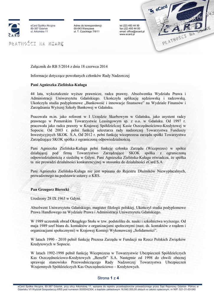 eCard Spółka Akcyjna 80-387 Gdańsk ul. Arkońska 11 Adres do korespondencji: 00-043 Warszawa ul. T. Czackiego 7/9/11 tel (22) 493 44 90 fax (22) 493 44 00 email: [email protected] www.ecard.pl Załącznik do RB 5/2014 z dnia 18 czerwca 2014 Informacje dotyczące powołanych członków Rady Nadzorczej Pani Agnieszka Zielińska-Kułaga 44 lata, wykształcenie wyższe prawnicze, radca prawny. Absolwentka Wydziału Prawa i Administracji Uniwersytetu Gdańskiego. Ukończyła aplikację sędziowską i radcowską. Ukończyła studia podyplomowe „Bankowość i innowacje finansowe” na Wydziale Finansów i Zarządzania Wyższej Szkoły Bankowej w Gdańsku. Pracowała m.in. jako referent w I Urzędzie Skarbowym w Gdańsku, jako asystent radcy prawnego w Pomorskim Towarzystwie Leasingowym sp. z o.o. w Gdańsku. Od 1997 r. pracowała jako radca prawny w Krajowej Spółdzielczej Kasie Oszczędnościowo-Kredytowej w Sopocie. Od 2003 r. pełni funkcję sekretarza rady nadzorczej Towarzystwa Funduszy Inwestycyjnych SKOK S.A. Od 2012 r. pełni funkcję wiceprezesa zarządu spółki Towarzystwo Zarządzające SKOK spółka z ograniczoną odpowiedzialnością. Pani Agnieszka Zielińska-Kułaga pełni funkcję członka Zarządu (Wiceprezes) w spółce działającej pod firmą Towarzystwo Zarządzające SKOK spółka z ograniczoną odpowiedzialnością z siedzibą w Gdyni. Pani Agnieszka Zielińska-Kułaga oświadcza, że spółka ta nie prowadzi działalności konkurencyjnej w stosunku do działalności eCard S.A. Pani Agnieszka Zielińska-Kułaga nie jest wpisana do Rejestru Dłużników Niewypłacalnych, prowadzonego na podstawie ustawy o KRS. Pan Grzegorz Bierecki Urodzony 28 IX 1963 w Gdyni. Absolwent Uniwersytetu Gdańskiego, magister filologii polskiej. Ukończył studia podyplomowe Prawa Handlowego na Wydziale Prawa i Administracji Uniwersytetu Gdańskiego. W 1989 uczestnik obrad Okrągłego Stołu w tzw. podstoliku ds. nauki i szkolnictwa wyższego. Od maja 1989 szef biura ds. kontaktów z organizacjami społecznymi (nast. ds. kontaktów z rządem i organizacjami społecznymi) w Krajowej Komisji Wykonawczej „Solidarności”. W latach 1990 - 2010 pełnił funkcję Prezesa Zarządu w Fundacji na Rzecz Polskich Związków Kredytowych w Sopocie. W latach 1992-1998 pełnił funkcję Wiceprezesa w Towarzystwie Ubezpieczeń Spółdzielczych Kas Oszczędnościowo-Kredytowych „Benefit” S.A. Następnie od 1998 do chwili obecnej sprawuje stanowisko Przewodniczącego Rady Nadzorczej Towarzystwa Ubezpieczeń Wzajemnych Spółdzielczych Kas Oszczędnościowo – Kredytowych. Strona 1 z 4 eCard Spółka Akcyjna, 80-387 Gdańsk, przy ulicy Arkońskiej 11, wpisana do rejestru przedsiębiorców prowadzonego przez Sąd Rejonowy Gdańsk- Północ w Gdańsku VII Wydział Gospodarczy KRS pod numerem 0000042304, o kapitale zakładowym 16.840.000,00 złotych w całości opłaconym, nr NIP: 521-31-03-040 eCard Spółka Akcyjna 80-387 Gdańsk ul. Arkońska 11 Adres do korespondencji: 00-043 Warszawa ul. T. Czackiego 7/9/11 tel (22) 493 44 90 fax (22) 493 44 00 email: [email protected] www.ecard.pl W latach 1994 - 2012 pełnił funkcję Prezesa Zarządu w Krajowej Spółdzielczej Kasie Oszczędnościowo-Kredytowej. Współzałożyciel i autor publikacji nt. tzw. SKOK-ów. Od czerwca 2009 do chwili obecnej: Przewodniczący Rady Nadzorczej e-Card S.A. w Gdańsku. Od czerwca 2010 do chwili obecnej: Przewodniczący Rady Nadzorczej Towarzystwa Finansowego SKOK S.A. w Gdańsku. Od 2012 do stycznia 2014 Przewodniczący Rady Nadzorczej Krajowej Spółdzielczej Kasy Oszczędnościowo-Kredytowej. W 2000 roku wybrany do Rady Dyrektorów Światowej Rady Związków Kredytowych (Word Council of Credit Union, Inc.) z siedzibą w Madison (USA). Od 2005 pełnił funkcję Sekretarza, następnie w 2007 został powołany na Skarbnika Rady Dyrektorów World Council of Credit Unions (WOCCU). Od 2009 Wiceprzewodniczący Światowej Rady Związków Kredytowych. W 2013 objął najwyższą z możliwych w strukturach tej organizacji funkcję Przewodniczącego WOCCU. Ekspert komisji sejmowych. Honorowy obywatel kilku miast amerykańskich, laureat nagród ekonomicznych w Polsce i USA; wyróżniony m.in. odznaką Zasłużony dla Kultury Polskiej (2001) i Krzyżem Kawalerskim Orderu Odrodzenia Polski (2007). W 2011 roku wybrany na Senatora Rzeczypospolitej Polskiej. Pan Grzegorz Bierecki nie prowadzi działalności konkurencyjnej dla działalności eCard S.A. Pan Grzegorz Bierecki nie jest wpisany do Rejestru Dłużników Niewypłacalnych, prowadzonego na podstawie ustawy o KRS. Pan Andrzej Sosnowski Urodził się w 1963 r. Absolwent Wydziału Ekonomicznego Uniwersytetu Gdańskiego. W latach 1991-1993 pracował w Fundacji na rzecz Polskich Związków Kredytowych i był odpowiedzialny za tworzenie SKOK na terenie Polski północnej. W latach 1994 - 1996 pracował w KSKOK oraz pełnił funkcję Członka Zarządu SKOK Pracowników Przedsiębiorstw Morskich. Od 1994 r. Prezes Zarządu SKOK im. Franciszka Stefczyka, największej spółdzielczej kasy w kraju. - Od marca 2005 r. członek Rady Nadzorczej Apella S.A. (wcześniej Media SKOK Sp. z o.o.); - Od lutego 2008 r. członek Rady Nadzorczej Hardware Software Outsourcing sp. z o.o. (wcześniej HandS Outsourcing Sp. z o.o.); - Od września 2008 r. członek Rady Nadzorczej Towarzystwa Finansowego SKOK S.A. (wcześniej Towarzystwo Finansowe SKOK Sp. z o.o.); - Od listopada 2008 r. do grudnia 2012 r. Wiceprzewodniczący Rady Nadzorczej Towarzystwa Zarządzającego SKOK Sp. z o.o.; - Od czerwca 2009 r. do chwili obecnej Członek Rady Nadzorczej eCard S.A.; - Od stycznia 2012 r. do chwili obecnej Członek Rady Fundacji im. Franciszka Stefczyka; - Od sierpnia 2009 r. do maja 2012 r. Członek Rady Nadzorczej Zachodniej Spółdzielczej Kasy Oszczędnościowo – Kredytowej; - Od października 2012 r. do chwili obecnej Członek Rady Nadzorczej Stefczyk Nieruchomości Towarzystwo Zarządzające SKOK Sp. z o.o