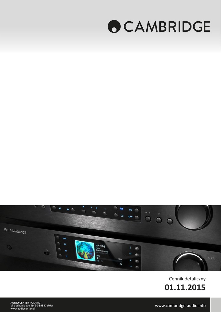 Cennik detaliczny 01.11.2015 AUDIO CENTER POLAND ul. Sucharskiego 49, 30-898 Kraków www.audiocenter.pl www.cambridge-audio.info CXA60 WZMACNIACZ STEREOFONICZNY 3490 zł cena detaliczna NOWOŚĆ Moc wyjściowa: 60 WRMS przy obciążeniu 8 omów, 90 WRMS przy obciążeniu 4 omy, Konwerter cyfrowo-analogowy: Wolfson WM8740, Pasmo przenoszenia: <5Hz– 60kHz ±1dB, Analogowe wejścia audio: CINCH x 4, 3,5 mm typu JACK (MP3) x 1 (na panelu przednim), Cyfrowe wejścia audio: koncentryczne S/PDIF x 1, optyczne TOSLINK x 2, Bluetooth dla odbiornika BT100 (brak w wyposażeniu), Kompatybilność: Cyfrowy sygnał optyczny Toslink, koncentryczny S/PDF, odbiornik Bluetooth BT100, Wyjścia: Głośniki A+B, słuchawkowe 3,5 mm, wyjście na przedwzmacniacz, wyjście na subwoofer, Maksymalny pobór mocy: 600 W, Pobór mocy w trybie czuwania: <0.5 W, Wymiary (wysokość x szerokość x głębokość): 115 x 430 x 341 mm, Waga: 8,3 kg CXA80 WZMACNIACZ STEREOFONICZNY 4590 zł cena detaliczna NOWOŚĆ Moc wyjściowa: 80 WRMS przy obciążeniu 8 omów, 120 WRMS przy obciążeniu 4 omy, Konwerter cyfrowo-analogowy: Wolfson WM8740, Pasmo przenoszenia: <5Hz– 60kHz ±1dB, Analogowe wejścia audio: Symetryczne XLR x 1, CINCH x 4, 3,5 mm typu JACK (MP3) x 1 (na panelu przednim) Cyfrowe wejścia audio: Cyfrowe wejścia audio: koncentryczne S/PDIF x 1, optyczne Toslink x 2, USB audio x 1, Bluetooth dla odbiornika BT100 (brak w wyposażeniu), Kompatybilność: TOSLINK optyczne, S/PDIF koncentryczne, USB 1.0 i 2.0, odbiornik Bluetooth BT100, Wyjścia: Głośniki A+B, słuchawkowe 3,5 mm, wyjście na przedwzmacniacz, wyjście na subwoofer, Maksymalny pobór mocy: 750 W, Pobór mocy w trybie czuwania: <0.5 W, Wymiary (wysokość x szerokość x głębokość): 115 x 430 x 341 mm, Waga: 8,7 kg CXC NAPĘD CD 2190 zł cena detaliczna NOWOŚĆ Odtwarzacz CXC zaprojektowano do skutecznego odzyskiwania cyfrowych danych z płyty CD, wyposażając go w napęd o jednej prędkości oraz najnowocześniej system korekcji błędów. Została zaprojektowany tak, aby zachwycał znakomitym odtwarzaniem płyt CD. Cyfrowe wyjścia audio: koncentryczne S/PDF oraz optyczne TOSLINK, Impedancja wyjściowa S/PDIF: < 75 ohms, Maksymalny pobór mocy: 25 W, Pobór mocy w trybie czuwania: <0.5 W, Wymiary (wysokość x szerokość x głębokość): 85 x 430 x 315 mm, Waga: 4,7 kg CXU ODTWARZACZ UNIWERSALNY 5290 zł cena detaliczna NOWOŚĆ Odtwarzane typy płyt: Blu-ray (BD, BD-3D, DVD, DVD-A, AVCHD, SACD, CD, HDCD, Kodak Picture CD, CD-R/RW, DVD+-R/RW, DVD, Wyjścia wideo: 2 x HDMI 1.4a z ARC, Wyjścia audio: 7.1 RCA, stereo RCA, Wejścia HDMI: 2 x 1.4a (frontowe z MHL), Wejścia audio: 1 x S/PDIF, 1 x TOSLINK, Złącza dla zewnętrznych dysków pamięci: 3 x USB 2.0, Maksymalny pobór mocy: 35 W, Pobór mocy standby: <0,5 W, Wymiary (HxWxD): 82 x 430 x 312 mm, Waga: 5 kg, Dostępny w wersji czarnej i srebrnej. AUDIO CENTER POLAND ul. Sucharskiego 49, 30-898 Kraków www.audiocenter.pl www.cambridge-audio.info 2 CXN ODTWARZACZ SIECIOWY 4590 zł cena detaliczna NOWOŚĆ Konwerter cyfrowo-analogowy: Podwójny, 24-bitowy konwerter Wolfson WM8740, Filtr cyfrowy: Upsampling drugiej generacji typu ATF2, maksymalnie do formatu 24 bity/384 kHz. Filtr analogowy: Podwójny, dwubiegunowy, różnicowy Bessel, Wejście USB audio: USB typu B, zgodne z profilem USB audio 1.0 lub 2.0 (do wyboru przez użytkownika); DSD poprzez USB, Cyfrowe wejścia audio: koncentryczne S/PDIF oraz optyczne TOSLINK, Analogowe wyjścia audio: Analogowe, symetryczne XLR oraz niesymetryczne CINCH, Cyfrowe wyjścia audio: koncentryczne S/PDIF oraz optyczne TOSLINK, Kompatybilność: UPnP, lokalne nośniki USB, USB audio 1.0 i 2.0, S/PDIF TOSLINK i koncentryczne, odbiornik Bluetooth BT100 (brak w wyposażeniu), radio internetowe, Spotify Connect Formaty audio: ALAC, WAV, FLAC, AIFF, WMA, MP3, AAC, HE AAC, AAC+, OGG Vorbis Kolorowy wyświetlacz z możliwością wyświetlania okładek płyt, Maksymalny pobór mocy: 30 W, Pobór mocy w trybie czuwania: <0.5 W Wymiary (wysokość x szerokość x głębokość): 85 x 430 x 305 mm, Waga: 3,5 kg CXR120 AMPLITUNER AUDIO VIDEO NOWOŚĆ CXR200 AMPLITUNER AUDIO VIDEO 7990 zł cena detaliczna Moc wyjściowa: 120 WRMS na kanał, 6 omów (sterowanie dwoma kanałami), 155 WRMS na kanał, 4 omy (sterowanie dwoma kanałami), 100 WRMS na kanał, 8 omów (sterowanie dwoma kanałami), 60 WRMS na kanał, 8 omów (sterowanie wszystkimi 7 kanałami) HDMI: HDMI 2.0, HDCP 2.2, wyjście HDMI 1 obsługuje funkcję powrotnego kanału audio (ARC), Wejścia audio: analogowe x 3, tuner (FM/AM), bezpośredni system analogowy wielokanałowy 7.1, cyfrowe koncentryczne x 2, optyczne x 2, Wejścia wideo: HDMI 2.0 x 7 (6 z tyłu, 1 na panelu przednim, 1 wejście kompatybilne ze standardem MHL), Główne wyjścia audio: 7 wyjść głośnikowych ze wzmocnieniem, wyjście na subwoofer x 2, moduł Wi-Fi, złącze Ethernet RJ45, złącze Bluetooth odbiornika BT100 (brak w wyposażeniu), Spotify Connect, Formaty audio (strumieniowa transmisja sieciowa i dyski twarde USB): ALAC, WAV, FLAC, AIFF, WMA, MP3, AAC, HE AAC, AAC+, OGG Vorbis (16–24 bity, 11,025–192 kHz), DSD (poprzez HDMI), Maksymalny pobór mocy: 1000 W, Pobór mocy w trybie czuwania: <0.5 W, Wymiary (wysokość x szerokość x głębokość): 165 x 430 x 420 mm, Waga: 13,2 kg 10 990 zł cena detaliczna NOWOŚĆ Moc wyjściowa: 200 WRMS na kanał, 6 omów (sterowanie dwoma kanałami), 270 WRMS na kanał, 4 omy (sterowanie dwoma kanałami), 170 WRMS na kanał, 8 omów (sterowanie dwoma kanałami), 120 WRMS na kanał, 8 omów (sterowanie wszystkimi 7 kanałami), HDMI: HDMI 2.0, HDCP 2.2, wyjście HDMI 1 obsługuje funkcję powrotnego kanału audio (ARC), Wejścia audio: analogowe x 4, tuner (FM/AM), bezpośredni system analogowy wielokanałowy 7.1, cyfrowe koncentryczne x 2, cyfrowe optyczne x 4, Wejścia wideo: 6 x HDMI 2.0 (5 z tyłu, 1 na panelu przednim), 1 x MHL kompatybilne (HDMI 1.4 - max 1080p), Wyjścia w