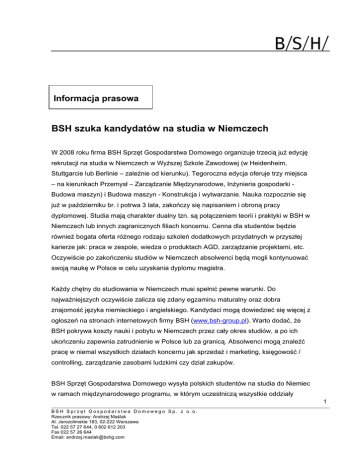 Informacja prasowa BSH szuka kandydatów na studia w Niemczech W 2008 roku firma BSH Sprzęt Gospodarstwa Domowego organizuje trzecią już edycję rekrutacji na studia w Niemczech w Wyższej Szkole Zawodowej (w Heidenheim, Stuttgarcie lub Berlinie – zależnie od kierunku). Tegoroczna edycja oferuje trzy miejsca – na kierunkach Przemysł – Zarządzanie Międzynarodowe, Inżynieria gospodarki Budowa maszyn) i Budowa maszyn - Konstrukcja i wytwarzanie. Nauka rozpocznie się już w październiku br. i potrwa 3 lata, zakończy się napisaniem i obroną pracy dyplomowej. Studia mają charakter dualny tzn. są połączeniem teorii i praktyki w BSH w Niemczech lub innych zagranicznych filiach koncernu. Cenna dla studentów będzie również bogata oferta różnego rodzaju szkoleń dodatkowych przydatnych w przyszłej karierze jak: praca w zespole, wiedza o produktach AGD, zarządzanie projektami, etc. Oczywiście po zakończeniu studiów w Niemczech absolwenci będą mogli kontynuować swoją naukę w Polsce w celu uzyskania dyplomu magistra. Każdy chętny do studiowania w Niemczech musi spełnić pewne warunki. Do najważniejszych oczywiście zalicza się zdany egzaminu maturalny oraz dobra znajomość języka niemieckiego i angielskiego. Kandydaci mogą dowiedzieć się więcej z ogłoszeń na stronach internetowych firmy BSH (www.bsh-group.pl). Warto dodać, że BSH pokrywa koszty nauki i pobytu w Niemczech przez cały okres studiów, a po ich ukończeniu zapewnia zatrudnienie w Polsce lub za granicą. Absolwenci mogą znaleźć pracę w niemal wszystkich działach koncernu jak sprzedaż i marketing, księgowość / controlling, zarządzanie zasobami ludzkimi czy dział zakupów. BSH Sprzęt Gospodarstwa Domowego wysyła polskich studentów na studia do Niemiec w ramach międzynarodowego programu, w którym uczestniczą wszystkie oddziały 1 BSH Sprzęt Gospodarstwa Domowego Sp. z o.o. Rzecznik prasowy: Andrzej Maślak Al. Jerozolimskie 183, 02-222 Warszawa Tel. 022 57 27 644, 0 602 612 203 Fax 022 57 26 644 Email: [email protected] koncernu na świecie. Korzyści z programu odniosą obie strony. BSH zyskuje wysoko wykwalifikowanych pracowników, a studenci będą mogli zawrzeć nowe międzynarodowe znajomości oraz doskonalić znajomość języków obcych, co w dzisiejszych czasach globalizacji jest niezwykle istotne. Kandydaci mogą przesyłać swoje oferty do końca lutego pocztą elektroniczną na adres: [email protected]. A więc, kandydaci! Teraz należy tylko przygotować swoje CV w języku polskim i niemieckim, wysłać i czekać na odpowiedź. www.bsh-group.pl Powstała w 1993 roku BSH Sprzęt Gospodarstwa Domowego Sp. z o.o. jest polską spółką-córką niemieckiego koncernu BSH Bosch und Siemens Hausgeräte GmbH z siedzibą w Monachium. Działa on na całym świecie z rocznym obrotem ponad 8,3 mld EUR, co daje mu silną pozycję na światowym rynku AGD. BSH GmbH został utworzony w 1967 roku, jako joint venture pomiędzy firmami Robert Bosch GmbH a Siemens AG. Koncern posiada dziś na świecie 45 zakładów produkcyjnych i ponad 70 oddziałów w 39 krajach oraz zatrudnia ponad 39 000 pracowników. Firma BSH Sprzęt Gospodarstwa Domowego Sp. z o.o. w swoich trzech łódzkich fabrykach produkuje pralki, zmywarki, suszarki do odzieży oraz dystrybuuje sprzęt AGD marek Bosch i Siemens. Jest to cała gama urządzeń wolnostojących i do zabudowy oraz produkty drobnego AGD. Spółka osiąga systematyczny wzrost obrotów, sięgający w 2006 r. kwoty ponad 2,5 mld zł, przy czym ok. 80% obrotów stanowi eksport. Łączna wartość inwestycji wyniosła na koniec 2006 roku około 600 mln zł, a zatrudnienie wynosi ponad 1 400 osób. 2 BSH Sprzęt Gospodarstwa Domowego Sp. z o.o. Rzecznik prasowy: Andrzej Maślak Al. Jerozolimskie 183, 02-222 Warszawa Tel. 022 57 27 644, 0 602 612 203 Fax 022 57 26 644 Email: [email protected]