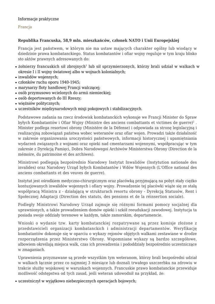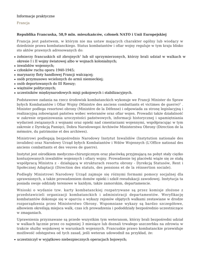 Informacje praktyczne Francja Republika Francuska, 58,9 mln. mieszkańców, członek NATO i Unii Europejskiej Francja jest państwem, w którym nie ma ustaw mających charakter ogólny lub wiodący w dziedzinie prawa kombatanckiego. Status kombatantów i ofiar wojny reguluje w tym kraju blisko sto aktów prawnych adresowanych do: ● ● ● ● ● ● ● ● żołnierzy francuskich sił zbrojnych1 lub sił sprzymierzonych, którzy brali udział w walkach w okresie I i II wojny światowej albo w wojnach kolonialnych; inwalidów wojennych; członków ruchu oporu 1940-1945; marynarzy floty handlowej Francji walczącej; osób przymusowo wcielonych do armii niemieckiej; osób deportowanych do III Rzeszy; więźniów politycznych; uczestników międzynarodowych misji pokojowych i stabilizacyjnych. Podstawowe zadania na rzecz środowisk kombatanckich wykonuje we Francji Minister do Spraw byłych Kombatantów i Ofiar Wojny (Ministre des anciens combattants et victimes de guerre)2 . Minister podlega resortowi obrony (Ministére de la Défense) i odpowiada za stronę legislacyjną i realizacyjną zobowiązań państwa wobec weteranów oraz ofiar wojen. Prowadzi także działalność w zakresie organizowania uroczystości państwowych, informacji historycznej i upamiętniania wydarzeń związanych z wojnami oraz opieki nad cmentarzami wojennymi, współpracując w tym zakresie z Dyrekcją Pamięci, Dobra Narodowegoi Archiwów Ministerstwa Obrony (Direction de la mémoire, du patrimoine et des archiwes). Ministrowi podlegają bezpośrednio Narodowy Instytut Inwalidów (Instytution nationale des invalides) oraz Narodowy Urząd byłych Kombatantów i Wdów Wojennych (L'Office national des anciens combattants et des veuves de guerre). Instytut jest ośrodkiem medyczno-chirurgicznym oraz placówką przyjmującą na pobyt stały ciężko kontuzjowanych inwalidów wojennych i ofiary wojny. Prowadzenie tej placówki wiąże się ze stałą współpracą Ministra z - działającą w strukturach resortu obrony - Dyrekcją Statusów, Rent i Społecznej Adaptacji (Direction des statuts, des pensions et de la réinsertion sociale). Podległy Ministrowi Narodowy Urząd zajmuje się różnymi formami pomocy socjalnej dla uprawnionych, a także prowadzeniem domów opieki i szkół reeudukacji zawodowej. Instytucja ta posiada swoje oddziały terenowe w każdym, także zamorskim, departamencie. Wnioski o wydanie tzw. karty kombatanckiej rozpatrywane są przez komisje złożone z przedstawicieli organizacji kombatanckich i administracji departamentów. Weryfikację kombatantów dokonuje się w oparciu o wykazy rejonów objętych walkami zestawiane w drodze rozporządzenia przez Ministerstwo Obrony. Wspomniane wykazy są bardzo szczegółowe, albowiem określają miejsca walk, czas ich prowadzenia i pododdziały bezpośrednio uczestniczące w zmaganiach. Uprawnienia przyznawane są przede wszystkim tym weteranom, którzy brali bezpośredni udział w walkach łącznie przez co najmniej 3 miesiące lub doznali trwałego uszczerbku na zdrowiu w trakcie służby wojskowej w warunkach wojennych. Francuskie prawo kombatanckie przewiduje możliwość odstępstwa od tych zasad, jeśli weteran udowodnił na przykład, że: ● uczestniczył w wyjątkowo niebezpiecznych operacjach bojowych; ● był przetrzymywany przez co najmniej 6 miesięcy w obozie jenieckim na terytorium okupowanym przez Niemców lub co najmniej 3 miesiące w obozie na terytorium okupowanym przez Japończyków. Minister do Spraw byłych Kombatantów i Ofiar Wojny może jednak podjąć decyzję o przyznaniu uprawnień także w przypadkach nie przewidzianych przepisami prawa kombatanckiego Weteranom przysługuje prawo zatrudnienia w służbie cywilnej i niektórych gałęziach przemysłu. Mają oni także możliwość przechodzenia na wcześniejszą emeryturę, albowiem w zależności od charakteru odbytej służby wojskowej jej okres zaliczany jest w zwiększonym wymiarze do lat pracy, np. 1 rok służby może być przeliczony na 2, a nawet 3 lata pracy. Oprócz rent inwalidzkich przyznanych z tytułu kontuzji wojennych, francuscy kombatanci otrzymują stałe dodatki kombatanckie w wysokości ok. 461 euro rocznie (dane z 2003 r.). Inwalidzi wojenni z uznanym 75 % stopniem inwalidztwa mogą także korzystać z bezpłatnej opieki medycznej oraz bezpłatnych pobytów w sanatoriach i domach wypoczynkowych. Posiadacze karty kombatanckiej mają także prawo do zasiłków, nieoprocentowanych pożyczek, bezpłatnych porad adwokatów i miejsc w domach opieki podlegających Narodowemu Urzędowi byłych Kombatantów. Mogą również korzystać z bezpłatnych przejazdów środkami komunikacji miejskiej, przyznawanych przez władze lokalne. Po śmierci uprawnionego wdowy, wdowcy, byli konkubenci i sieroty otrzymują renty jedynie w przypadku niskich dochodów własnych i mogą korzystać z pewnych przywilejów w zakresie opieki zdrowotnej. Państwo ponosi także koszty wystawienia grobowca poległego żołnierza i raz do roku pokrywa koszty wyjazdu na grób weterana. Osobom pozostałym po kombatantach i ofiarach wojny władze lokalne mogą także przyznawać prawo do bezpłatnych przejazdów środkami komunikacji miejskiej. Z możliwości korzystania z uprawnień wyłączone są osoby, które: ● ● ● dobrowolnie (ochotniczo) uczestniczyły w walkach po stronie nieprzyjaciela; w trakcie przymusowej służby w armii nieprzyjaciela awansowały ze stopnia podoficerskiego na oficerski albo otrzymały awans na wyższy stopień oficerski; kolaborowały z nieprzyjacielem. Francuscy kombatanci zrzeszeni są między innymi w: Narodowym Związku Kombatantów (Union National de Combattants), Narodowej Federacji byłych Kombatantów Algierii (Féderation Nationale des Anciens Combattans en Algérie), Republikańskim Stowarzyszeniu byłych Kombatantów (Assotiation Républicaine Ancienes Combattants). Z ruchem kombatanckim związane jest, działające od 1872 r., Narodowe Sto