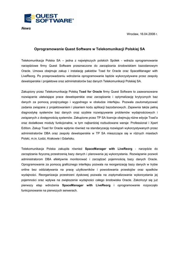 News Wrocław, 16.04.2008 r. Oprogramowanie Quest Software w Telekomunikacji Polskiej SA Telekomunikacja Polska SA – jedna z największych polskich Spółek - wdraża oprogramowanie narzędziowe firmy Quest Software przeznaczone do zarządzania środowiskiem bazodanowym Oracle. Umowa obejmuje zakup i instalację pakietów Toad for Oracle oraz SpaceManager with LiveReorg. Po przeprowadzeniu wdrożenia oprogramowanie będzie wykorzystywane przez zespoły deweloperskie i projektowe oraz administratorów baz danych Telekomunikacji Polskiej SA. Zakupiony przez Telekomunikację Polską Toad for Oracle firmy Quest Software to zaawansowane rozwiązanie ułatwiające prace deweloperskie oraz zarządzanie i optymalizację krytycznych baz danych za pomocą przejrzystego i wygodnego w obsłudze interfejsu. Pozwala zautomatyzować zadania związane z projektowaniem i pisaniem kodu aplikacji bazodanowych. Zapewnia także pełną diagnostykę systemów baz danych oraz szybkie rozwiązywanie problemów wydajnościowych i związanych z dostępnością systemów. Zakupione przez TP SA licencje obejmują różne edycje Toad’a oraz dodatkowe moduły funkcjonalne, w tym najbardziej rozbudowane wersje: Professional i Xpert Edition. Zakup Toad for Oracle wpłynie również na standaryzację rozwiązań wykorzystywanych przez administratorów DBA oraz zespoły deweloperskie w TP SA mieszczące się w różnych miastach Polski, m.in. Łodzi, Krakowie i Gdańsku. Telekomunikacja Polska zakupiła również SpaceManager with LiveReorg - narzędzie do zarządzania fizyczną przestrzenią bazy danych i planowania jej wykorzystania. Rozwiązanie pozwoli administratorom DBA efektywnie monitorować i zarządzać pojemnością bazy danych Oracle. Oprogramowanie za pomocą graficznego interfejsu pozwala na reorganizację bazy danych w trybie online bez oddziaływania na pracę użytkowników i powodowania przestojów oraz spadków wydajności. Reorganizacja przestrzeni dyskowej pozwala na zoptymalizowanie wykorzystania jej pojemności oraz wpływa na zwiększenie wydajności całego środowiska Oracle. Zakończył się już pierwszy etap wdrożenia SpaceManager funkcjonowanie na pierwszych serwerach. with LiveReorg i oprogramowanie rozpoczęło Telekomunikacja Polska SA (TP) jest jednym z największych, dynamicznie rozwijających się polskich przedsiębiorstw. Firma działa na rynku telefonii stacjonarnej, telefonii komórkowej, internetu i transmisji danych. Oferuje także specjalistyczne usługi w zakresie radiokomunikacji, telefonii przywoławczej, radiotelefonii i łączności dyspozytorskiej. Telekomunikacja Polska SA powstała w grudniu 1991 roku, a od stycznia 1992 rozpoczęła działalność pod obecną nazwą. Jest kontynuatorką ponad 60 lat tradycji przedsiębiorstwa Polska Poczta, Telegraf i Telefon. W 1998 roku spółka została sprywatyzowana, a jej akcje zostały wprowadzone do obrotu na Giełdzie Papierów Wartościowych w oraz w formie GDR-ów (Globalnych Kwitów Depozytowych) na giełdzie w Londynie. Od 2000 r. partnerem strategicznym TP jest konsorcjum France Telecom. Telekomunikacja Polska SA stanowi trzon Grupy Telekomunikacja Polska, będącej największą grupą telekomunikacyjną w Europie Środkowej. Firmy należące do Grupy TP to oprócz TP SA: Polska Telefonia Komórkowa Centertel sp. z o.o., TP Internet, TP Invest, Ditel SA, TP EmiTel sp. z o.o., Wirtualna Polska, Marketplanet (Otwarty Rynek Elektroniczny S.A.). Grupa działa na rynku telefonii stacjonarnej, telefonii komórkowej, internetu, transmisji danych, dzierżawy łączy oraz transmisji satelitarnej. Zakres świadczonych usług jest systematycznie poszerzany o nowe obszary biznesowe. Dodatkowych informacji udziela: Joanna Żuchowska [email protected] tel. 0-71 356 49 42 ..................................................................................................................................................................................... Quest Software jest producentem oprogramowania do zarządzania wydajnością aplikacji, bazami danych oraz infrastrukturą IT. Firma powstała w 1987 r., a od 1998 r. notowana jest na giełdzie NASDAQ. Quest Software zatrudnia ok. 3000 pracowników w ponad 50 przedstawicielstwach na całym świecie. W 2007 r. obroty firmy wyniosły 631 mln USD. Quest Software posiada w ofercie ponad 160 produktów. Są to kompleksowe rozwiązania przeznaczone do zarządzania bazami danych (Oracle, SQL Server, MySQL, Sybase i DB2), zarządzania wydajnością aplikacji (PeopleSoft, Oracle E-business, .NET, SAP i Siebel), wspomagające zarządzanie infrastrukturą Microsoft (Windows, Active Directory, Exchange, SharePoint i .NET), a także integrację środowisk Windows/Unix/Linux. Firma oferuje również oprogramowanie przeznaczone do optymalizacji jakości kodu Java uzupełnione o rozwiązania dla aplikacji działających w środowisku J2EE. Produkty Quest Software były wielokrotnie nagradzane i wyróżniane zarówno przez ekspertów branży IT, jak i użytkowników. W niezależnych badaniach rynku (m.in. Forrester Research), przeprowadzonych w 2007 roku, Quest Software został uznany za światowego lidera na rynku rozwiązań przeznaczonych do zarządzania środowiskiem Microsoft Windows oraz Active Directory. Firma otrzymała dwukrotnie (w 2004 r. i 2007 r.) tytuł Partnera Roku Microsoft: “Microsoft Global Independent Software Vendor (ISV) Partner of the Year”. Nagroda ta przyznawana jest raz w roku firmom, które oferują najlepsze, innowacyjne rozwiązania w oparciu o wykorzystanie technologii tworzonych przez Microsoft. Przejęte w 2007 r. firmy Magnum Technologies, PassGo Technologies, eXc Software, ScriptLogic oraz Provision Networks umocniły pozycję Quest Software na rynku rozwiązań do zarządzania środowiskiem IT również w takich obszarach jak m.in. Virtual Desktop Infrastructure (VDI) oraz Business Services Management (BSM). Quest Software dostarcza oprogramowanie do ponad 50 000 k