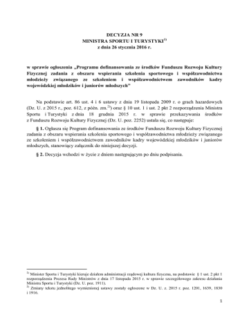 DECYZJA NR 9 MINISTRA SPORTU I TURYSTYKI1) z dnia 26 stycznia 2016 r. w sprawie ogłoszenia „Programu dofinansowania ze środków Funduszu Rozwoju Kultury Fizycznej zadania z obszaru wspierania szkolenia sportowego i współzawodnictwa młodzieży związanego ze szkoleniem i współzawodnictwem zawodników kadry wojewódzkiej młodzików i juniorów młodszych” Na podstawie art. 86 ust. 4 i 6 ustawy z dnia 19 listopada 2009 r. o grach hazardowych (Dz. U. z 2015 r., poz. 612, z późn. zm.2)) oraz § 10 ust. 1 i ust. 2 pkt 2 rozporządzenia Ministra Sportu i Turystyki z dnia 18 grudnia 2015 r. w sprawie przekazywania środków z Funduszu Rozwoju Kultury Fizycznej (Dz. U. poz. 2252) ustala się, co następuje: § 1. Ogłasza się Program dofinansowania ze środków Funduszu Rozwoju Kultury Fizycznej zadania z obszaru wspierania szkolenia sportowego i współzawodnictwa młodzieży związanego ze szkoleniem i współzawodnictwem zawodników kadry wojewódzkiej młodzików i juniorów młodszych, stanowiący załącznik do niniejszej decyzji. § 2. Decyzja wchodzi w życie z dniem następującym po dniu podpisania. 1) Minister Sportu i Turystyki kieruje działem administracji rządowej kultura fizyczna, na podstawie § 1 ust. 2 pkt 1 rozporządzenia Prezesa Rady Ministrów z dnia 17 listopada 2015 r. w sprawie szczegółowego zakresu działania Ministra Sportu i Turystyki (Dz. U. poz. 1911). 2) Zmiany tekstu jednolitego wymienionej ustawy zostały ogłoszone w Dz. U. z. 2015 r. poz. 1201, 1639, 1830 i 1916. 1 Załącznik do Decyzji nr Ministra Sportu i Turystyki z dnia stycznia 2016 roku PROGRAM DOFINANSOWANIA ZE ŚRODKÓW FUNDUSZU ROZWOJU KULTURY FIZYCZNEJ ZADANIA Z OBSZARU WSPIERANIA SZKOLENIA SPORTOWEGO I WSPÓŁZAWODNICTWA MŁODZIEŻY ZWIĄZANEGO ZE SZKOLENIEM I WSPÓŁZAWODNICTWEM ZAWODNIKÓW KADRY WOJEWÓDZKIEJ MŁODZIKÓW I JUNIORÓW MŁODSZYCH 2 Na podstawie art. 86 ust. 4 i 6 ustawy z dnia 19 listopada 2009 r. o grach hazardowych (Dz. U. z 2015 r. poz. 612, z późn. zm. 3)) oraz § 10 ust. 1 i ust. 2 pkt 2 rozporządzenia Ministra Sportu i Turystyki z dnia 18 grudnia 2015 r. w sprawie przekazywania środków z Funduszu Rozwoju Kultury Fizycznej (Dz. U. poz. 2252), zwanego dalej „rozporządzeniem”, ogłasza się „Program dofinansowania ze środków Funduszu Rozwoju Kultury Fizycznej zadania z obszaru wspierania szkolenia sportowego i współzawodnictwa młodzieży związanego ze szkoleniem i współzawodnictwem zawodników kadry wojewódzkiej młodzików i juniorów młodszych, zwany dalej „Programem”. I. ZAŁOŻENIA PROGRAMOWE 1. Celem Programu jest wyselekcjonowanie utalentowanych sportowo zawodników do dalszego szkolenia w placówkach sportowych i kadrach narodowych polskich związków sportowych poprzez zapewnienie optymalnych warunków szkolenia i możliwości podnoszenia poziomu sportowego młodzieży uzdolnionej sportowo. 2. Programem objęci są zawodnicy w kategoriach wiekowych młodzika i juniora młodszego zwani dalej Kadrą Wojewódzką. 3. Dofinansowanie szkolenia zawodników odbywać się będzie niezależnie od ich udziału w innych zadaniach zleconych przez Ministra Sportu i Turystyki, zwanego dalej „Ministrem”, z zastrzeżeniem możliwości uczestnictwa zawodnika tylko w jednej akcji w danym czasie. II. RODZAJ ZADANIA PRZEWIDZIANEGO DO REALIZACJI W ramach Programu przewiduje się do realizacji zadanie związane ze szkoleniem i współzawodnictwem zawodników kadry wojewódzkiej młodzików i juniorów młodszych obejmujące następujące działania: 1) szkolenie zawodników Kadry Wojewódzkiej w sportach i kategoriach wiekowych wykazanych w załączniku nr 1 do Programu; 2) Międzywojewódzkie Mistrzostwa Młodzików (MMM). III. PODMIOTY UPRAWNIONE DO UZYSKANIA DOFINANSOWANIA Wniosek o dofinansowanie może składać podmiot wybrany przez właściwego Marszałka Województwa na podstawie przepisów ustawy z dnia o pożytku publicznym i wolontariacie (Dz. U. z 2014 r. poz. 1118, z późn. zm.4)), tj.: ogólnokrajowe stowarzyszenie lub związek stowarzyszeń działający w obszarze kultury fizycznej – zwany dalej Wnioskodawcą. 3) Zmiany tekstu jednolitego wymienionej ustawy zostały ogłoszone w Dz. U. z. 2015 r. poz. 1201, 1639, 1830 i 1916. 4) Zmiany tekstu jednolitego wymienionej ustawy zostały ogłoszone w Dz. U. z 2014 r., poz. 1138 i 1146 oraz z 2015 r. poz. 1255, 1333, 1339 i 1777. 3 IV. WYSOKOŚĆ ŚRODKÓW PRZEZNACZONYCH NA REALIZACJĘ PROGRAMU 1. Na realizację Programu Minister przeznacza kwotę 22 500 000,00 zł ujętą w projekcie ustawy budżetowej na rok 2016. 2. W przypadku zmniejszenia przychodów z FRKF w stosunku do założonego planu, Minister może zmienić kwotę przyznanego dofinansowania w formie aneksu do umowy. V. WARUNKI UDZIELANIA DOFINANSOWANIA I JEGO WYSOKOŚĆ 1. Wnioskodawca przedstawia wniosek o dofinasowanie zadania ze środków FRKF w podziale na poszczególne działania. 2. Wymogi formalne wniosku z zakresu rozwijania sportu i aktywności fizycznej określa § 12 rozporządzenia. 3. Załącznikami do wniosku są: 1) preliminarz kosztów bezpośrednich i pośrednich – zestawienie zbiorcze kosztów; 2) koszty pośrednie – obsługa zadania; 3) aktualny odpis lub wydruk komputerowy z Krajowego Rejestru Sądowego albo zaświadczenie bądź informację sporządzoną na podstawie ewidencji właściwej dla formy organizacyjnej wnioskodawcy, wraz z oświadczeniem potwierdzającym zgodność i aktualność danych na dzień składania wniosku; 4) statut wnioskodawcy; 5) dokument potwierdzający wybór Wnioskodawcy przez Marszałka Województwa; 6) ramowy program szkolenia oraz regulamin szkolenia Kadry Wojewódzkiej w 2016 r.; 7) schemat struktury szkolenia sportowego. 4. Wniosek należy złożyć: - w formie elektronicznej za pośrednictwem systemu AMODIT, - w formie papierowej wraz z załącznikami o których mowa w ust. 3. 5. Wzór wniosku o dofinansowanie zadania w ramach Programu, a także wzór umowy na realizac