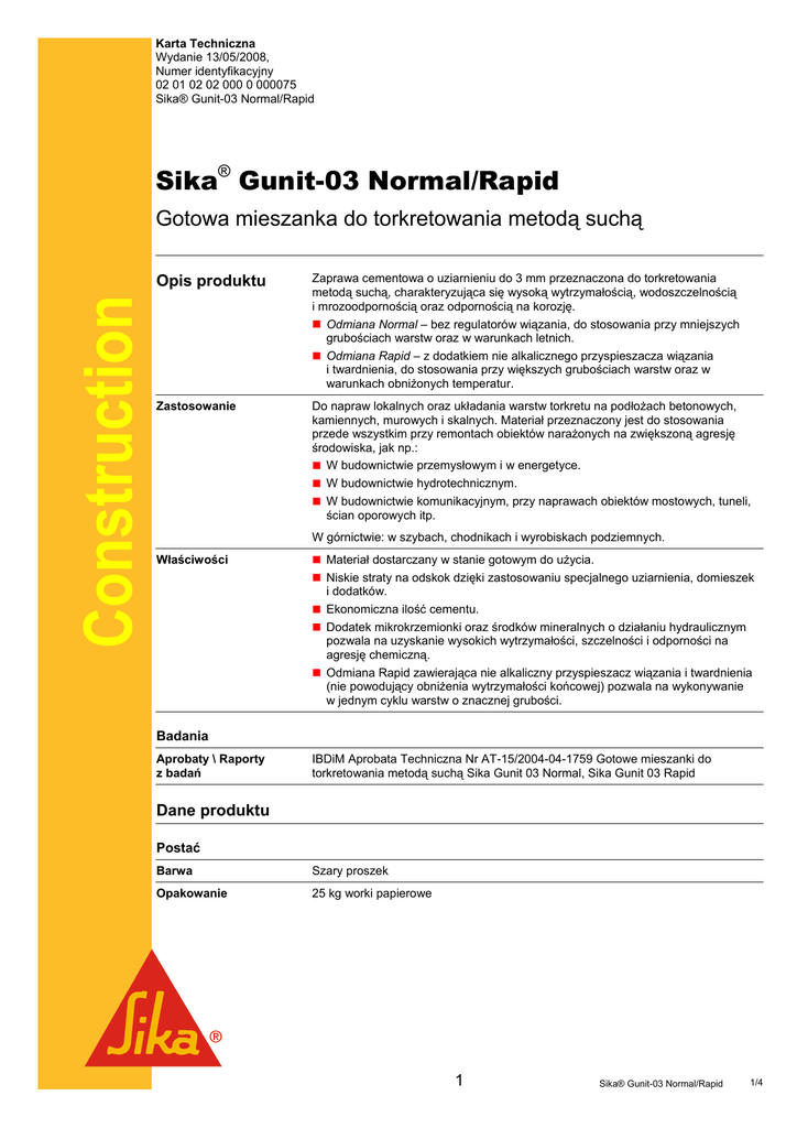 Karta Techniczna Wydanie 13/05/2008, Numer identyfikacyjny 02 01 02 02 000 0 000075 Sika® Gunit-03 Normal/Rapid Sika® Gunit-03 Normal/Rapid Construction Gotowa mieszanka do torkretowania metodą suchą Opis produktu Zaprawa cementowa o uziarnieniu do 3 mm przeznaczona do torkretowania metodą suchą, charakteryzująca się wysoką wytrzymałością, wodoszczelnością i mrozoodpornością oraz odpornością na korozję. Odmiana Normal – bez regulatorów wiązania, do stosowania przy mniejszych grubościach warstw oraz w warunkach letnich. Odmiana Rapid – z dodatkiem nie alkalicznego przyspieszacza wiązania i twardnienia, do stosowania przy większych grubościach warstw oraz w warunkach obniżonych temperatur. Zastosowanie Do napraw lokalnych oraz układania warstw torkretu na podłożach betonowych, kamiennych, murowych i skalnych. Materiał przeznaczony jest do stosowania przede wszystkim przy remontach obiektów narażonych na zwiększoną agresję środowiska, jak np.: W budownictwie przemysłowym i w energetyce. W budownictwie hydrotechnicznym. W budownictwie komunikacyjnym, przy naprawach obiektów mostowych, tuneli, ścian oporowych itp. W górnictwie: w szybach, chodnikach i wyrobiskach podziemnych. Właściwości Materiał dostarczany w stanie gotowym do użycia. Niskie straty na odskok dzięki zastosowaniu specjalnego uziarnienia, domieszek i dodatków. Ekonomiczna ilość cementu. Dodatek mikrokrzemionki oraz środków mineralnych o działaniu hydraulicznym pozwala na uzyskanie wysokich wytrzymałości, szczelności i odporności na agresję chemiczną. Odmiana Rapid zawierająca nie alkaliczny przyspieszacz wiązania i twardnienia (nie powodujący obniżenia wytrzymałości końcowej) pozwala na wykonywanie w jednym cyklu warstw o znacznej grubości. Badania Aprobaty \ Raporty z badań IBDiM Aprobata Techniczna Nr AT-15/2004-04-1759 Gotowe mieszanki do torkretowania metodą suchą Sika Gunit 03 Normal, Sika Gunit 03 Rapid Dane produktu Postać Barwa Szary proszek Opakowanie 25 kg worki papierowe 1 Sika® Gunit-03 Normal/Rapid 1/4 Składowanie Warunki składowania / Czas przydatności do użycie Produkt przechowywany w suchym pomieszczeniu, w temperaturze od +5°C do +35°C. Najlepiej użyć w ciągu 9 miesięcy (odmiana Normal) lub 6 miesięcy (odmiana Rapid). Chronić przed wilgocią. Dane techniczne Uziarnienie 0 ÷ 3 mm Gęstość nasypowa w stanie luźnym Nasypowa w stanie luźnym: ~1,60 kg/l (PN-88/B-04500) Nasypowa w stanie zagęszczonym: ~1,95 kg/l (PN-88/B-04500) Po zarobieniu wodą ,do uzyskania konsystencji odpowiadającej zagłębieniu stożka Nowikowa na 3 cm: ~2,20 kg/l (PN-88/B-04500) Początek gęstnienia Utrata urabialności przy zagłębieniu stożka Nowikowa <1cm ~60 min, typ Normal ~10 min, typ Rapid Gęstość próbki wykonanej torkretnicą (PN-88/B-04500) 2,37÷2,39 kg/l Właściwości mechaniczne Wytrzymałości na ściskanie Dla zaprawy wykonanej w laboratorium 10 – 12 MPa R 2d 25 – 28 MPa R 7d 42 – 48 MPa R 28d Na rdzeniach 10 cm odwierconych z płyt wykonanych torkretnicą 17 – 22 MPa R 2d 33 – 38 MPa R 7d 58 – 66 MPa R 28d Nasiąkliwość <4% na rdzeniach 10 cm odwierconych z płyt wykonanych torkretnicą Wodoszczelność > W 12 na kostkach 15 cm wyciętych z płyt wykonanych torkretnicą Mrozoodporność F 150 na rdzeniach 10 cm odwierconych z płyt wykonanych torkretnicą Informacje o systemie Szczegóły aplikacji Zużycie ~20.5 kg/m2/1 cm Zużycie teoretyczne: Zużycie praktyczne zależy od chropowatości podłoża i strat na odskok. Straty na odskok mogą się znacznie wahać w zależności od dostępności elementu, pozycji torkretowania, gęstości zbrojenia, grubości warstwy i kwalifikacji operatora dyszy. Orientacyjne straty można przyjąć na podstawie poniższej tabelki : Dostępność podłoża i grubość warstwy pozioma pionowa sufitowa Około 5% 10-20% 20-30% Grubość warstwy poniżej 2 cm lub niewielkie zagęszczenie zbrojenia 10-15% 20-30% 30-40% Znaczne zagęszczenie zbrojenia 15-20% 30-40% 40-50% Brak zbrojenia, grubość warstwy 2÷5 cm Przygotowanie podłoża Pozycja torkretowania Podłoże mineralne powinno być czyste, pozbawione luźnych cząstek i słabych fragmentów oraz zatłuszczeń, lekko chropowate. Najlepsze efekty zapewnia piaskowanie lub wysokociśnieniowe czyszczenie hydrodynamiczne. Przed torkretowaniem podłoże należy obficie nawilżyć wodą i odczekać aż osiągnie stan matowo-wilgotny. Podłoża porowate i przesuszone zaleca się moczyć wodą przez 1 dzień przed aplikacją. 2 Sika® Gunit-03 Normal/Rapid 2/4 Warunki aplikacji Temperatura powietrza, podłoża i materiału Typ Normal Typ Rapid Instrukcja aplikacji Materiał wsypuje się wprost do leja zasypowego torkretnicy. Sposoby aplikacji Przed przystąpieniem do robót należy zapoznać się z Instrukcją ITB nr 299 „Wykonywanie betonu natryskowego” oraz skonsultować z przedstawicielem Sika Poland. W razie potrzeby należy uzgodnić wspólne przeprowadzenie aplikacji próbnej. Podczas natrysku przestrzegać następujących zasad: od + 10°C do + 35°C od + 3°C do + 25°C Utrzymywać końcówkę dyszy w odległości 0.75 ÷ 1.25 m od podłoża i tak ustawić tę odległość oraz ciśnienie, by dla określonej pozycji natrysku, długości węży oraz pozycji torkretowania osiągnąć jak najniższy odskok i pylenie. W pierwszym momencie natrysku bezpośrednio na podłoże dozować nieco więcej wody na dyszy, aby utworzyła się cienka warstwa szlamu sczepnego. Następnie zredukować ilość wody do momentu, aż materiał padający na podłoże przestanie „falować” wokół miejsca uderzenia strugi. Taka konsystencja odpowiada optymalnemu stosunkowi w/c z zakresu 0.38 ÷ 0.42. Zwiększony odskok i pylenie świadczą o zbyt niskim dozowaniu wody. Stosując odmianę Normal torkretowanie należy prowadzić warstwami o grubości od 1 do 6 cm z przerwą technologiczną co najmniej 8 ÷12 godz. (w zależności od temperatury). P