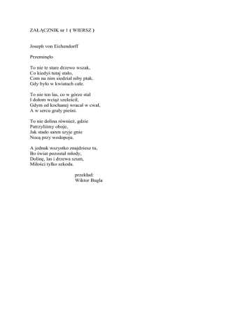 ZAŁĄCZNIK nr 1 ( WIERSZ ) Joseph von Eichendorff Przeminęło To nie te stare drzewo wszak, Co kiedyś tutaj stało, Com na nim siedział niby ptak. Gdy było w kwiatach całe. To nie ten las, co w górze stał I dołom wciąż szeleścił, Gdym od kochanej wracał w cwał, A w sercu grały pieśni. To nie dolina również, gdzie Patrzyliśmy oboje, Jak stado saren szyje gnie Nocą przy wodopoju. A jednak wszystko znajdziesz tu, Bo świat pozostał młody, Dolinę, las i drzewa szum, Miłości tylko szkoda. przekład: Wiktor Bugla