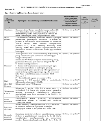 Załącznik nr 3 OPIS PRZEDMIOTU ZAMÓWIENIA (wykaz/cennik asortymentowo – ilościowy) Zadanie 3: Lp. 1 Serwer aplikacyjno-bazodanowy szt. 1 Nazwa komponen tu Wymagane minimalne parametry techniczne Wykonawca wypełnia kolumnę wpisując „spełnia” przy każdym elemencie oferty zawierającym opis wymogów zamawiającego. 1 2 3 Obudowa typu Rack o wysokości maksymalnej 2U, wraz kompletem szyn umożliwiających montaż w standardowej szafie Rack,wysuwanie serwera do celów serwisowych wraz z organizatorem kabli. Z możliwością instalacji minimum dwóch fizycznych procesorów, posiadająca minimum 12 slotów na pamięci z możliwością zainstalowania do minimum 384GB pamięci RAM, możliwe zabezpieczenia pamięci: ECC, SDDC, Memory Mirroring Rank Sparing, SBEC. Płyta główna zaprojektowana przez producenta serwera i oznaczona trwale jego znakiem firmowym. Jeden procesor min. ośmiordzeniowy dedykowany do pracy z zaoferowanym serwerem umożliwiający osiągnięcie wyniku minimum 307 Gflops w trybie standardowej pracy, gdzie moc obliczana jest wzorem Gflops=C * I * F C- liczba rdzeni procesora I – liczba instrukcji zmiennoprzecinkowych typu dodawanie i mnożenie w podwójnej precyzji wykonywanych przez pojedynczy rdzeń procesora w czasie jednego cyklu zegarowego (np. dla procesora Intel Xeon seria E56xx oraz procesorów AMD Opteron I=4 F – Częstotliwość zegara procesora w GHz Minimum 64 GB pamięci RAM o częstotliwości taktowania minimum 2133MHz Minimum 3 sloty PCI Express Spełnia/ nie spełnia** Obudowa Płyta główna Procesor RAM Sloty PCI Express Wartość brutto*** 4 5 …………* Spełnia/ nie spełnia** Spełnia/ nie spełnia** Spełnia/ nie spełnia** Spełnia/ nie spełnia** Minimum 5 portów USB 2.0 z czego min. 2 w Spełnia/ nie spełnia** technologii 3.0 (porty nie mogą zostać osiągnięte Wbudowan poprzez stosowanie dodatkowych adapterów, e porty przejściówek oraz kart rozszerzeń) 1x RS-232, 2x VGA D-Sub Zintegrowana karta graficzna, umożliwiająca Spełnia/ nie spełnia** Karta wyświetlanie obrazu w rozdzielczości minimum graficzna 1280x1024 pikseli Spełnia/ nie spełnia** Minimum cztery interfejsy sieciowe 1Gb/s Ethernet ze złączami BaseT nie zajmujące żadnego z Interfejsy dostępnych slotów PCI Express oraz złącz USB. sieciowe Kontroler pamięci masowej Cena jednostko wa brutto*** Sprzętowy kontroler dyskowy, umożliwiający obsługę Spełnia/ nie spełnia** dysków z prędkościami transferu 3, 6, 12 Gb/s; umożliwiający skonfigurowanie na wewnętrznej pamięci dyskowej zabezpieczeń RAID: 0, 1, 5, 6, 10, ….……* 50, 60, wyposażony w wbudowaną, nieulotną pamięć cache o pojemności min. 1GB. Możliwość instalacji min. 48TB w wewnętrznej pamięci masowej typu Hot Plug 7.2k RPM, możliwość instalacji dysków twardych typu: SATA, NearLine SAS, SAS, SSD, PCI Express Flash oraz SED dostępnych w ofercie producenta serwera. Zainstalowane 4 dyski twardeo poj. min. 600GB SAS Wewnętrzn 15k RPM każdy skonfigurowane fabrycznie w RAID a pamięć 10 Zainstalowany wewnętrzny moduł SD z dwoma masowa kartami o pojemności min. 8GB każda, dedykowanej dla hypervisorawirtualizacyjnego, umożliwiającej konfigurację zabezpieczenia typu "mirror" lub RAID 1 z poziomu BIOS serwera, rozwiązanie nie może powodować zmniejszenia ilości minimalnej ilości wewnętrznej pamięci masowej w serwerze. Napęd Zainstalowany wewnętrzny napęd umożliwiający optyczny odczyt i zapis nośników DVD Wykonawca dostarczy 1 licencję na serwerowy system operacyjny wraz z licencjami umożliwiającymi korzystanie z funkcji systemu przez 20 użytkowników lokalnych. System zainstalowany fabrycznie Spełnia/ nie spełnia** Spełnia/ nie spełnia** Producent…………...* Symbol/model……… ………………………...* Licencja na oprogramowanie powinna być przypisana Spełnia/ nie spełnia** do każdego procesora fizycznego na serwerze. Liczba rdzeni procesorów i ilość pamięci nie mogą mieć wpływu na liczbę oferowanych licencji. Licencja uprawniająca do uruchamiania serwerowego systemu operacyjnego (SSO) w środowisku fizycznym i dwóch wirtualnych środowisk serwerowego systemu operacyjnego za pomocą wbudowanych mechanizmów wirtualizacji. Serwerowy system operacyjny (dalej: SSO) posiada następujące, wbudowane cechy. System operacyjny 1. Posiada możliwość wykorzystania 320 logicznych procesorów oraz 4 TB pamięci RAM w środowisku fizycznym 2. Posiada możliwość wykorzystywania 64 procesorów wirtualnych oraz 1TB pamięci RAM i dysku o pojemności 64TB przez każdy wirtualny serwerowy system operacyjny. 3. Posiada możliwość budowania klastrów składających się z 64 węzłów, z możliwością uruchamiania do 8000 maszyn wirtualnych. 4. Posiada możliwość migracji maszyn wirtualnych bez zatrzymywania ich pracy między fizycznymi serwerami z uruchomionym mechanizmem wirtualizacji (hypervisor) przez sieć Ethernet, bez konieczności stosowania dodatkowych mechanizmów współdzielenia pamięci. 5. Posiada wsparcie (na umożliwiającym to sprzęcie) dodawania i wymiany pamięci RAM bez przerywania pracy. 6. Posiada wsparcie (na umożliwiającym to sprzęcie) dodawania i wymiany procesorów bez przerywania pracy. 7. Posiada automatyczną weryfikację cyfrowych sygnatur sterowników w celu sprawdzenia, czy sterownik przeszedł testy jakości przeprowadzone przez producenta systemu operacyjnego. 8. Posiada możliwość dynamicznego obniżania poboru energii przez rdzenie procesorów niewykorzystywane w bieżącej pracy. Mechanizm ten uwzględnia specyfikę procesorów wyposażonych w mechanizmy Hyper-Threading. 9. Wbudowane wsparcie instalacji i pracy na wolumenach, które: − pozwalają na zmianę rozmiaru w czasie pracy systemu, − umożliwiają tworzenie w czasie pracy systemu migawek, dających użytkownikom końcowym (lokalnym i sieciowym) prosty wgląd w poprzednie wersje plików i folderów, − umożliwiają kompre
