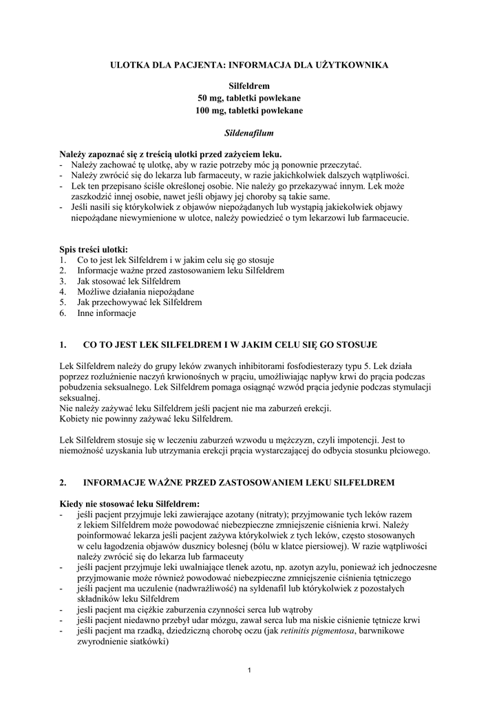 ULOTKA DLA PACJENTA: INFORMACJA DLA UŻYTKOWNIKA Silfeldrem 50 mg, tabletki powlekane 100 mg, tabletki powlekane Sildenafilum Należy zapoznać się z treścią ulotki przed zażyciem leku. - Należy zachować tę ulotkę, aby w razie potrzeby móc ją ponownie przeczytać. - Należy zwrócić się do lekarza lub farmaceuty, w razie jakichkolwiek dalszych wątpliwości. - Lek ten przepisano ściśle określonej osobie. Nie należy go przekazywać innym. Lek może zaszkodzić innej osobie, nawet jeśli objawy jej choroby są takie same. - Jeśli nasili się którykolwiek z objawów niepożądanych lub wystąpią jakiekolwiek objawy niepożądane niewymienione w ulotce, należy powiedzieć o tym lekarzowi lub farmaceucie. Spis treści ulotki: 1. Co to jest lek Silfeldrem i w jakim celu się go stosuje 2. Informacje ważne przed zastosowaniem leku Silfeldrem 3. Jak stosować lek Silfeldrem 4. Możliwe działania niepożądane 5. Jak przechowywać lek Silfeldrem 6. Inne informacje 1. CO TO JEST LEK SILFELDREM I W JAKIM CELU SIĘ GO STOSUJE Lek Silfeldrem należy do grupy leków zwanych inhibitorami fosfodiesterazy typu 5. Lek działa poprzez rozluźnienie naczyń krwionośnych w prąciu, umożliwiając napływ krwi do prącia podczas pobudzenia seksualnego. Lek Silfeldrem pomaga osiągnąć wzwód prącia jedynie podczas stymulacji seksualnej. Nie należy zażywać leku Silfeldrem jeśli pacjent nie ma zaburzeń erekcji. Kobiety nie powinny zażywać leku Silfeldrem. Lek Silfeldrem stosuje się w leczeniu zaburzeń wzwodu u mężczyzn, czyli impotencji. Jest to niemożność uzyskania lub utrzymania erekcji prącia wystarczającej do odbycia stosunku płciowego. 2. INFORMACJE WAŻNE PRZED ZASTOSOWANIEM LEKU SILFELDREM Kiedy nie stosować leku Silfeldrem: jeśli pacjent przyjmuje leki zawierające azotany (nitraty); przyjmowanie tych leków razem z lekiem Silfeldrem może powodować niebezpieczne zmniejszenie ciśnienia krwi. Należy poinformować lekarza jeśli pacjent zażywa którykolwiek z tych leków, często stosowanych w celu łagodzenia objawów dusznicy bolesnej (bólu w klatce piersiowej). W razie wątpliwości należy zwrócić się do lekarza lub farmaceuty jeśli pacjent przyjmuje leki uwalniające tlenek azotu, np. azotyn azylu, ponieważ ich jednoczesne przyjmowanie może również powodować niebezpieczne zmniejszenie ciśnienia tętniczego jeśli pacjent ma uczulenie (nadwrażliwość) na syldenafil lub którykolwiek z pozostałych składników leku Silfeldrem jesli pacjent ma ciężkie zaburzenia czynności serca lub wątroby jeśli pacjent niedawno przebył udar mózgu, zawał serca lub ma niskie ciśnienie tętnicze krwi jeśli pacjent ma rzadką, dziedziczną chorobę oczu (jak retinitis pigmentosa, barwnikowe zwyrodnienie siatkówki) 1 - jeśli pacjent doznał kiedykolwiek utraty wzroku w wyniku nietętniczej przedniej niedokrwiennej neuropatii nerwu wzrokowego. Kiedy zachować szczególną ostrożność stosując lek Silfeldrem: Należy powiedzieć lekarzowi: jeśli pacjent choruje na niedokrwistość sierpowatokrwinkową (nieprawidłowość krwinek czerwonych), białaczkę (choroba nowotworowa krwi), szpiczaka mnogiego (choroba nowotworowa szpiku kostnego) jeśli u pacjenta występuje zniekształcenie prącia lub choroba Peyroniego jeśli pacjent ma dolegliwości ze strony serca. W takim przypadku lekarz powinien dokładnie ocenić, czy stan serca pozwala na dodatkowy wysiłek związany z aktywnością seksualną jeśli pacjent ma chorobę wrzodową żołądka lub zaburzenia krzepnięcia krwi (np. hemofilię) jeśli u pacjenta wystąpi nagłe pogorszenie widzenia lub nagła utrata wzroku, należy przerwać stosowanie leku Silfeldrem i natychmiast skontaktować się z lekarzem. Leku Silfeldrem nie należy stosować jednocześnie z innymi doustnymi lub miejscowymi metodami leczenia zaburzeń wzwodu. Szczególne zalecenia dotyczące dzieci i młodzieży Leku Silfeldrem nie należy stosować u dzieci i młodzieży w wieku poniżej 18 lat. Szczególne zalecenia dotyczące pacjentów z zaburzeniami czynności nerek i wątroby Należy poinformować lekarza jeśli pacjent ma choroby nerek lub wątroby. Lekarz może zdecydować o zastosowaniu mniejszej dawki leku. Zażywanie leku Silfeldrem z innymi lekami: Należy powiedzieć lekarzowi lub farmaceucie o wszystkich przyjmowanych aktualnie lub ostatnio lekach, również tych, które wydawane są bez recepty. Lek Silfeldrem może mieć wpływ na działanie niektórych innych leków, zwłaszcza stosowanych do leczenia bólu w klatce piersiowej. W sytuacji wymagającej nagłej interwencji medycznej należy poinformować personel medyczny o zażyciu leku Silfeldrem oraz kiedy miało to miejsce. Nie należy przyjmować leku Silfeldrem jednocześnie z innymi lekami bez zalecenia lekarza. Nie należy stosować leku Silfeldrem, jeśli pacjent przyjmuje leki zawierające azotany. Jednoczesne przyjęcie azotanów z lekiem Silfeldrem może powodować niebezpieczne zmniejszenie ciśnienia tętniczego. Należy poinformować lekarza lub farmaceutę, jeśli pacjent przyjmuje którykolwiek z leków stosowanych w leczeniu dusznicy bolesnej (bólu w klatce piersiowej). Nie należy przyjmować leku Silfeldrem, jeśli pacjent stosuje leki uwalniajace tlenek azotu (tzw. „poppersy” – potoczne określenie różnych azotynów alkilu przyjmowanych wziewnie, np. azotyn amylu). Jednoczesne stosowanie tych leków z lekiem Silfeldrem może powodować niebezpieczne zmniejszenie ciśnienia krwi. Jeśli pacjent przyjmuje inhibitory proteazy (leki stosowane w zwalczaniu zakażenia HIV), zaleca się rozpoczęcie leczenia od najniższej dawki (25 mg) leku Silfeldrem. Niektórzy pacjenci przyjmujacy leki z grupy alfa-blokerów, z powodu nadciśnienia lub powiększenia gruczołu krokowego, mogą doznać zawrotów głowy lub uczucia oszołomienia, co może być spowodowane spadkiem ciśnienia krwi przy szybkim wstawaniu lub siadaniu. U niektórych pacjentów z