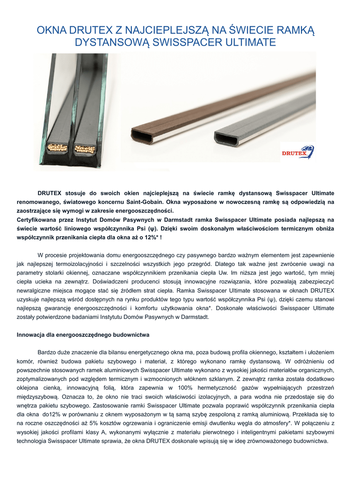 OKNA DRUTEX Z NAJCIEPLEJSZĄ NA ŚWIECIE RAMKĄ DYSTANSOWĄ SWISSPACER ULTIMATE DRUTEX stosuje do swoich okien najcieplejszą na świecie ramkę dystansową Swisspacer Ultimate renomowanego, światowego koncernu Saint-Gobain. Okna wyposażone w nowoczesną ramkę są odpowiedzią na zaostrzające się wymogi w zakresie energooszczędności. Certyfikowana przez Instytut Domów Pasywnych w Darmstadt ramka Swisspacer Ultimate posiada najlepszą na świecie wartość liniowego współczynnika Psi (ψ). Dzięki swoim doskonałym właściwościom termicznym obniża współczynnik przenikania ciepła dla okna aż o 12%* ! W procesie projektowania domu energooszczędnego czy pasywnego bardzo ważnym elementem jest zapewnienie jak najlepszej termoizolacyjności i szczelności wszystkich jego przegród. Dlatego tak ważne jest zwrócenie uwagi na parametry stolarki okiennej, oznaczane współczynnikiem przenikania ciepła Uw. Im niższa jest jego wartość, tym mniej ciepła ucieka na zewnątrz. Doświadczeni producenci stosują innowacyjne rozwiązania, które pozwalają zabezpieczyć newralgiczne miejsca mogące stać się źródłem strat ciepła. Ramka Swisspacer Ultimate stosowana w oknach DRUTEX uzyskuje najlepszą wśród dostępnych na rynku produktów tego typu wartość współczynnika Psi (ψ), dzięki czemu stanowi najlepszą gwarancję energooszczędności i komfortu użytkowania okna*. Doskonałe właściwości Swisspacer Ultimate zostały potwierdzone badaniami Instytutu Domów Pasywnych w Darmstadt. Innowacja dla energooszczędnego budownictwa Bardzo duże znaczenie dla bilansu energetycznego okna ma, poza budową profila okiennego, kształtem i ułożeniem komór, również budowa pakietu szybowego i materiał, z którego wykonano ramkę dystansową. W odróżnieniu od powszechnie stosowanych ramek aluminiowych Swisspacer Ultimate wykonano z wysokiej jakości materiałów organicznych, zoptymalizowanych pod względem termicznym i wzmocnionych włóknem szklanym. Z zewnątrz ramka została dodatkowo oklejona cienką, innowacyjną folią, która zapewnia w 100% hermetyczność gazów wypełniających przestrzeń międzyszybową. Oznacza to, że okno nie traci swoich właściwości izolacyjnych, a para wodna nie przedostaje się do wnętrza pakietu szybowego. Zastosowanie ramki Swisspacer Ultimate pozwala poprawić współczynnik przenikania ciepła dla okna do12% w porównaniu z oknem wyposażonym w tą samą szybę zespoloną z ramką aluminiową. Przekłada się to na roczne oszczędności aż 5% kosztów ogrzewania i ograniczenie emisji dwutlenku węgla do atmosfery*. W połączeniu z wysokiej jakości profilami klasy A, wykonanymi wyłącznie z materiału pierwotnego i inteligentnymi pakietami szybowymi technologia Swisspacer Ultimate sprawia, że okna DRUTEX doskonale wpisują się w ideę zrównoważonego budownictwa. Komfort pod każdym względem Ultraciepła ramka Swisspacer Ultimate pozwala nie tylko zaoszczędzić energię, lecz również zapewnić zdrowy i komfortowy mikroklimat w pomieszczeniach. Temperatura okna od strony pomieszczenia na styku ramy i szyby zespolonej podnosi się, dzięki czemu zjawisko kondensacji pary wodnej na obrzeżach szyby w okresie zimowym jest ograniczone. Tym samym spada ryzyko powstawania szkodliwej dla zdrowia pleśni. Dodatkową korzyścią ze stosowania ramki Swisspacer Ultimate jest fakt, że ramka nie wywołuje nieprzyjemnego uczucia zimna przy dotknięciu ręką. Nowoczesna ramka to również odpowiedź na najnowsze trendy w zakresie wzornictwa. Bogata gama kolorystyczna ramek obejmuje aż 17 odcieni, dzięki czemu można dobrać element optymalnie dopasowany do kolorystyki całego okna. Energooszczędność podstawą nowoczesnego okna Okna DRUTEX to wyraz nowoczesności. Najnowszy system PVC, Iglo Energy wykonany z profili klasy A produkowanych wyłącznie z materiału pierwotnego, to odpowiedź na rosnące oczekiwania w zakresie energooszczędności. To pierwsze rozwiązanie na świecie wyposażone w uszczelkę ze spienionego EPDM. Współczynnik przenikania ciepła na poziomie Uw=0,6 W/(m2K)** jest prawie o 100% lepszym parametrem niż wymagany na polskim rynku! Nowe okno to idealny produkt dla domów energooszczędnych i pasywnych. Zastosowanie ramki Swisspacer, dostępnej wyłącznie w ofercie DRUTEX, wpływa na polepszenie parametrów termoizolacyjnych okna, a tym samym oznacza większe oszczędności energii. *Zgodnie z informacjami z Saint Gobain ** Dla okna o wymiarach 1230x1480 mm wg CSI w Czechach