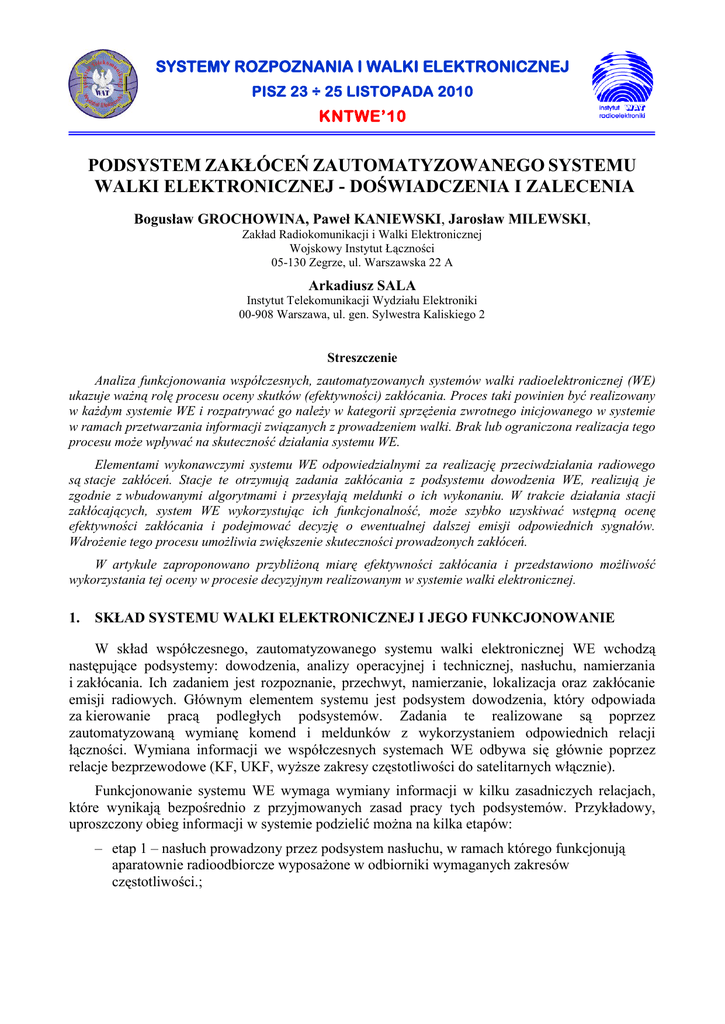SYSTEMY ROZPOZNANIA I WALKI ELEKTRONICZNEJ PISZ 23 ÷ 25 LISTOPADA 2010 KNTWE’10 PODSYSTEM ZAKŁÓCEŃ ZAUTOMATYZOWANEGO SYSTEMU WALKI ELEKTRONICZNEJ - DOŚWIADCZENIA I ZALECENIA Bogusław GROCHOWINA, Paweł KANIEWSKI, Jarosław MILEWSKI, Zakład Radiokomunikacji i Walki Elektronicznej Wojskowy Instytut Łączności 05-130 Zegrze, ul. Warszawska 22 A Arkadiusz SALA Instytut Telekomunikacji Wydziału Elektroniki 00-908 Warszawa, ul. gen. Sylwestra Kaliskiego 2 Streszczenie Analiza funkcjonowania współczesnych, zautomatyzowanych systemów walki radioelektronicznej (WE) ukazuje ważną rolę procesu oceny skutków (efektywności) zakłócania. Proces taki powinien być realizowany w każdym systemie WE i rozpatrywać go należy w kategorii sprzężenia zwrotnego inicjowanego w systemie w ramach przetwarzania informacji związanych z prowadzeniem walki. Brak lub ograniczona realizacja tego procesu może wpływać na skuteczność działania systemu WE. Elementami wykonawczymi systemu WE odpowiedzialnymi za realizację przeciwdziałania radiowego są stacje zakłóceń. Stacje te otrzymują zadania zakłócania z podsystemu dowodzenia WE, realizują je zgodnie z wbudowanymi algorytmami i przesyłają meldunki o ich wykonaniu. W trakcie działania stacji zakłócających, system WE wykorzystując ich funkcjonalność, może szybko uzyskiwać wstępną ocenę efektywności zakłócania i podejmować decyzję o ewentualnej dalszej emisji odpowiednich sygnałów. Wdrożenie tego procesu umożliwia zwiększenie skuteczności prowadzonych zakłóceń. W artykule zaproponowano przybliżoną miarę efektywności zakłócania i przedstawiono możliwość wykorzystania tej oceny w procesie decyzyjnym realizowanym w systemie walki elektronicznej. 1. SKŁAD SYSTEMU WALKI ELEKTRONICZNEJ I JEGO FUNKCJONOWANIE W skład współczesnego, zautomatyzowanego systemu walki elektronicznej WE wchodzą następujące podsystemy: dowodzenia, analizy operacyjnej i technicznej, nasłuchu, namierzania i zakłócania. Ich zadaniem jest rozpoznanie, przechwyt, namierzanie, lokalizacja oraz zakłócanie emisji radiowych. Głównym elementem systemu jest podsystem dowodzenia, który odpowiada za kierowanie pracą podległych podsystemów. Zadania te realizowane są poprzez zautomatyzowaną wymianę komend i meldunków z wykorzystaniem odpowiednich relacji łączności. Wymiana informacji we współczesnych systemach WE odbywa się głównie poprzez relacje bezprzewodowe (KF, UKF, wyższe zakresy częstotliwości do satelitarnych włącznie). Funkcjonowanie systemu WE wymaga wymiany informacji w kilku zasadniczych relacjach, które wynikają bezpośrednio z przyjmowanych zasad pracy tych podsystemów. Przykładowy, uproszczony obieg informacji w systemie podzielić można na kilka etapów: – etap 1 – nasłuch prowadzony przez podsystem nasłuchu, w ramach którego funkcjonują aparatownie radioodbiorcze wyposażone w odbiorniki wymaganych zakresów częstotliwości.; – etap 2 – wykrycie przez aparatownie radioodbiorcze źródła emisji i przekazanie informacji o tym fakcie do podsystemu dowodzenia (wymiana informacji w relacji: aparatownie radioodbiorcze - wóz dowodzenia WE); – etap 3 – przekazanie z podsystemu dowodzenia do podsystemu analizy operacyjnej i technicznej danych otrzymanych z nasłuchu (wymiana informacji w relacji: wóz dowodzenia WE - wóz analizy); – etap 4 – przekazanie z podsystemu dowodzenia do podsystemu namierzania rozkazu do namierzania źródła emisji (wymiana informacji w relacji: wóz dowodzenia WE namierniki); – etap 5 – przekazanie do podsystemu dowodzenia informacji o namierzonym źródle emisji (wymiana informacji w relacji: namierniki - wóz dowodzenia WE); – etap 6 – przekazanie do podsystemu dowodzenia wyników przeprowadzonych analiz (wymiana informacji w relacji: wóz analizy - wóz dowodzenia WE); – etap 7 – wypracowanie w podsystemie dowodzenia decyzji i wydanie rozkazu dotyczącego: o prowadzenia dalszego nasłuchu (wymiana informacji w relacji: wóz dowodzenia WE aparatownie radioodbiorcze); o zakłócania (wymiana informacji w relacji: wóz dowodzenia WE - stacje zakłócające); – etap 8 – przekazanie do podsystemu dowodzenia WE meldunku o przebiegu i zakończeniu procesu zakłócania (wymiana informacji w relacji: stacje zakłócające - wóz dowodzenia WE). Etapy 3 i 4 powinny być realizowane równolegle w jednym czasie, taka sama zasada dotyczy etapów 5 i 6. Przekazanie do podsystemu dowodzenia WE meldunków o przebiegu realizowanych zadań powinno odbywać się przez cały czas działania systemu i obejmować wszystkie jego elementy (aparatownie). Z punktu widzenia tematyki niniejszego artykułu istotne jest zaakcentowanie procesu dotyczącego podsystemu zakłócającego (etap 8). 2. PODSYSTEM ZAKŁÓCEŃ W skład podsystemu zakłóceń systemu walki elektronicznej wchodzą stacje zakłóceń wykonywane zazwyczaj w formie zabudowy specjalistycznej dedykowanego pojazdu kołowego lub gąsienicowego. Dodatkowo przewidzieć można także wariant przewoźny – kontenerowy, przewidziany do uruchomienia po zdjęciu ze środka transportowego. Stacje zakłóceń systemu WE przeznaczone są do zwalczania środków radiowych przeciwnika poprzez realizację w sposób zautomatyzowany procesu zakłócania radiowego. Do podstawowych funkcji każdej stacji zakłóceń zautomatyzowanego systemu WE powinno należeć: – utrzymanie łączności z podsystemem dowodzenia w celu odbioru rozkazów zakłócania, powiadomień, alarmów, przekazywania meldunków oraz innych informacji związanych z realizacją zadań zakłócania i utrzymaniem stacji w gotowości do działania; – zakłócanie w sposób automatyczny emisji radiowych po otrzymaniu odpowiednio sformatowanego zadania do zakłócania; – prowadzenie rozpoznania radiowego z wykorzystaniem odbiorników i systemów antenowych będących na wyposażeniu stacji zakłóceń. 2 Współpraca podsystemu zakł