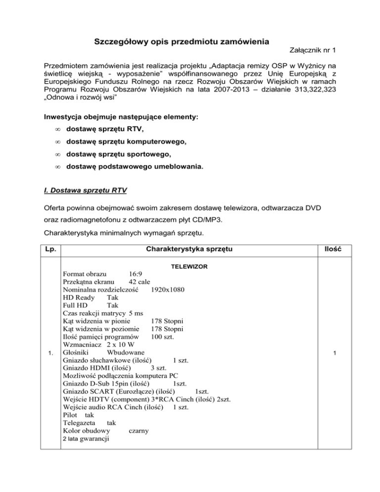 Szczegółowy opis przedmiotu zamówienia Załącznik nr 1 Przedmiotem zamówienia jest realizacja projektu „Adaptacja remizy OSP w Wyżnicy na świetlicę wiejską - wyposażenie” współfinansowanego przez Unię Europejską z Europejskiego Funduszu Rolnego na rzecz Rozwoju Obszarów Wiejskich w ramach Programu Rozwoju Obszarów Wiejskich na lata 2007-2013 – działanie 313,322,323 „Odnowa i rozwój wsi” Inwestycja obejmuje następujące elementy: • dostawę sprzętu RTV, • dostawę sprzętu komputerowego, • dostawę sprzętu sportowego, • dostawę podstawowego umeblowania. I. Dostawa sprzętu RTV Oferta powinna obejmować swoim zakresem dostawę telewizora, odtwarzacza DVD oraz radiomagnetofonu z odtwarzaczem płyt CD/MP3. Charakterystyka minimalnych wymagań sprzętu. Lp. Charakterystyka sprzętu Ilość TELEWIZOR 1. Format obrazu 16:9 Przekątna ekranu 42 cale Nominalna rozdzielczość 1920x1080 HD Ready Tak Full HD Tak Czas reakcji matrycy 5 ms Kąt widzenia w pionie 178 Stopni Kąt widzenia w poziomie 178 Stopni Ilość pamięci programów 100 szt. Wzmacniacz 2 x 10 W Głośniki Wbudowane Gniazdo słuchawkowe (ilość) 1 szt. Gniazdo HDMI (ilość) 3 szt. Mozliwość podłączenia komputera PC Gniazdo D-Sub 15pin (ilość) 1szt. Gniazdo SCART (Eurozłącze) (ilość) 1szt. Wejście HDTV (component) 3*RCA Cinch (ilość) 2szt. Wejście audio RCA Cinch (ilość) 1 szt. Pilot tak Telegazeta tak Kolor obudowy czarny 2 lata gwarancji 1 ODTWARZACZ DVD 2. Odtwarzanie płyt DVD, DVD-R, DVD-RW Odtwarzanie DivX, XviD, WMA, MPEG4, MP3, JPEG Odtwarzania plików DivX i XviD z napisami Odtwarzanie płyt CD, VCD, CD-R, CD-RW Standard Wideo PAL / NTSC Gniazdo SCART (Eurozłącze) (ilość) . Wyjście HDTV (component) 3*RCA Cinch Wyjście Composite video RCA Cinch Wyjście audio L + R (2 x RCA Cinch) Pilot Na wyposażeniu Certyfikaty CE 2 lata gwarancji 1 RADIOMAGNETOFON 3. Odtwarzanie płyt CD-R/RW, MP3 Odbierane zakresy fal FM/AM Dodatkowe wejście USB Elektroniczna regulacja głośności Zasilanie AC Wyświetlacz LCD 2 lata gwarancji CD i MP3 Tuner radiowy FM Tuner radiowy AM Sposób strojenia radia elektroniczny Wbudowany napęd płyt Odtwarzanie MP3 Ilość płyt 1szt. Wyjście słuchawkowe tak 2 lata gwarancji 1 II. Dostawa sprzętu komputerowego Oferta powinna obejmować swoim zakresem dostawę 3 zestawów komputerowych. Charakterystyka minimalnych wymagań sprzętu. Lp. Charakterystyka sprzętu Ilość ZESTAW KOMPUTEROWY 1. Zainstalowany model procesora Intel® Pentium® Dual Core G840 System operacyjny Microsoft® Windows7 Professional PL 32-bit Chipset płyty głównej Intel® H61 Rodzaj pamięci DDR3 Pamięć zainstalowana 2GB Maksymalna wielkość pamięci 8GB 500GB Pojemność dysku Napęd optyczny wbudowany DVD RW DL 3 Karta graficzna Intel® HD Graphics Karta sieciowa bezprzewodowa 54 (Mbps) - 802.11g Wi-Fi Wbudowany LAN 100Mb / 1Gb Wbudowane Audio 6 Ch HD Audio Złącza USB 8 Złącza PCI Express x161 Złącza PCI 32-bit/33MHz 2 Złącza PCI Express x1 1 Złącze LPT Tak Złącze RS-232 Tak Klawiatura i mysz w zestawie Tak Typ obudowy Mini Tower Maksymalna moc zasilacza 350W Gwarancja 3 lata Spełniane normy CE, ROHS Wyposażenie dodatkowe: czytnik kart pamięci, podkładka pod mysz, nośniki recovery, słuchawki z mikrofonem, listwa anty przepięciowa, kamera internetowa Okres rękojmi (gwarancji) w miesiącach 36 Zgodność ze standardem 802.11b/g G DATA Internet Security PRE 1 rok; Microsoft® Office 2010 Starter; Microsoft® Windows Live ™ Essentials Monitor LCD LED 18,5” Format obrazu 16:9 Nominalna rozdzielczość 1366 x 768 250 cd/m2 Jasność Kontrast 1000000 :1 Czas reakcji matrycy 5 ms Kąt widzenia w pionie 160 Stopni Kąt widzenia w poziomie 170 Stopni Ilość wyświetlanych kolorów 16,7 mln Gniazdo D-Sub Zasilacz zewnętrzny Gwarancja 36 miesięcy INNE URZĄDZENIA 2 Router Wi-Fi 1 III. Dostawa sprzętu sportowego Oferta powinna obejmować swoim zakresem dostawę stołów do tenisa, siatek, rakietek, gry szachy oraz tarczy z lotkami. Charakterystyka minimalnych wymagań sprzętu. Lp. Charakterystyka sprzętu Ilość STOŁY DO TENISA 1. 2. Treningowy stół do tenisa stołowego, składany do pionu, podstawa metalowa z kółkami do transportu, Stół wysokiej klasy o wymiarach olimpijskich, Stalowa rama wzmacniająca blat, stabilna konstrukcja wózka, podwójne zabezpieczenie przy złożonym i rozłożonym stole, specjalne łączenie stabilizujące obie połowy podczas gry, łatwy w obsłudze mechanizm składania stołu, możliwość treningu jednej osoby (po złożeniu stołu), blat stołu grubości min 16mm, kolor blatu zielony lub niebieski. W zestawie siatka RAKIETKA DO TENISA Rakietka z atestem ITTF. Do gry wszechstronnej. Deska 5 - sklejkowa - uchwyt konkav. 2 4 SZACHY 3. Gra planszowa, , plansza do gry trwała z drewna, składana, umożliwiająca przechowywanie pionków wewnątrz po zamknięciu, pionki z drewna 2 TARCZA Z LOTKAMI 4. Tarcza elektroniczna umożliwia grę 1-8 graczy jednocześnie, posiada funkcję automatycznej punktacji, funkcję Dart-Finish, regulację głośności oraz efekty dźwiękowe, syntezator mowy (możliwość włączania i wyłączania dźwięku), funkcję automatycznego wyłączania oraz funkcję pamięci oraz mozliwość gry z komputerem, 9 wyświetlaczy diodowych (widoczne w ciemności) w tym 4 wyświetlacze do CRICETA, oraz jeden zliczający punkty w danej kolejce. W zestawie 4 komplety lotek, zasilacz sieciowy, samoprzylepna linia rzutów, uchwyt do oprzyrządowania, opis reguł gry (instrukcja w języku polskim), 1 IV. Dostawa podstawowego umeblowania Oferta powinna obejmować swoim zakresem dostawę 3 mobilnych biurek komputerowych oraz 3 krzeseł obrotowych. Charakterystyka minimalnych wymagań sprzętu. Lp. 1. Charakterystyka sprzętu BIURKA KOMPUTEROWE Biurka pod komputery powinny być metalowe i posiadać kółka umożliwiające transport zestawów pomiędzy pomieszczeniami. Szerokość blatu min. 0,8m, wysu