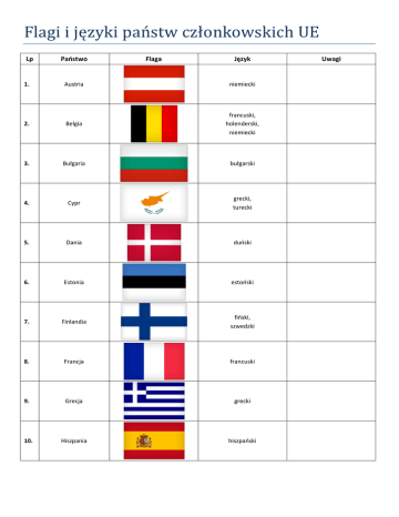 Flagi i języki państw członkowskich UE Lp 1. Państwo Flaga Język Austria niemiecki 2. Belgia francuski, holenderski, niemiecki 3. Bułgaria bułgarski 4. Cypr grecki, turecki 5. Dania duoski 6. Estonia estooski 7. Finlandia fioski, szwedzki 8. Francja francuski 9. Grecja grecki 10. Hiszpania hiszpaoski Uwagi 11. Holandia holenderski 12. Irlandia irlandzki, angielski 13. Litwa litewski 14. Luksemburg luksemburski, Niemiecki, francuski 15. Łotwa łotewski 16. Malta maltaoski, angielski 17. Niemcy niemiecki 18. Polska polski 19. Portugalia portugalski 20. Republika Czeska czeski 21. Rumunia rumuoski 22. Słowacja słowacki 23. Słowenia słoweoski 24. Szwecja szwedzki 25. Węgry węgierski 26. Wielka Brytania angielski 27. Włochy włoski 28. Federacja Rosyjska rosyjski Wszystkie flagi dostępne są pod adresem: http://flagpedia.net/pl/organizacja/eu Powodzenia! Nie jest paostwem należącym do UE