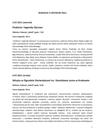 WAKACJE Z CENTRUM 2011 5.07.2011 (wtorek) Podania i legendy Ojcowa Zbiórka: Pałacyk „Sokół” godz. 7.30 Cena wyjazdu: 20 zł „Podania i legendy Ojcowa” to propozycja turystyczna, podczas której dzieci będą mogły nie tylko spożytkowad swoje pokłady energii ale także poznad wiele ciekawych historii na temat Ojcowskiego Parku Narodowego. Trasa na samym początku prowadzid będzie dnem Doliny Prądnika od Ruin Zamku Kazimierzowskiego w Ojcowie poprzez malownicze utwory skalne, m.in. Skały Panieoskie, Igłę Deotymy, Jaskinię Krowią, Bramę Krakowską i zespół Skał Góry Koronnej z ukrytą pośród nich Rękawicą. Idąc dalej, przez Wąwóz Ciasne Skałki, na najwyższe wzniesienie w Ojcowskim Parku Narodowym - Górę Chełmową, na samym jej szczycie odkryjemy najdłuższą jaskinię na terenie objętym przez park - Grotę Łokietka. Na tej trasie dowiemy się, jakie legendy i podania ukrywają tutejsze ruiny zamku, skałki i jaskinie a wśród nich Grota Łokietka, która wciąż stanowi główną atrakcję turystyczną Ojcowskiego Parku Narodowego. 6.07.2011 (środa) Wizyta w Ogrodzie Doświadczeo im. Stanisława Lema w Krakowie Zbiórka: Pałacyk „Sokół” godz. 8.30 Cena wyjazdu: 20 zł Ogród Doświadczeo w Krakowie jest pierwszym sensorycznym parkiem edukacyjnym w Polsce, który z pewnością zainteresuje ciekawych świata. Na terenie 6 hektarów znajduje się blisko 60 interaktywnych instalacji z zakresu optyki, akustyki i mechaniki. Każda z nich prezentuje wybrane zjawiska przyrody, można np. samemu wywoływad wir wodny i obserwowad go do woli, albo samodzielnie rozszczepiad promienie słoneczne w pryzmacie, poczud, jak drży powietrze w pobliżu gongu, nadad i odebrad wiadomośd z użyciem telegrafu akustycznego, szeptad i byd dobrze słyszanym na odległośd 20 m, znaleźd się we wnętrzu kalejdoskopu i swoim ciałem tworzyd niezwykłe obrazy… oraz wykonad wiele innych eksperymentów. A przede wszystkim poprzez osobiste doświadczanie i przeżywanie zjawisk fizycznych, z udziałem własnych zmysłów, próbowad zrozumied otaczający nas świat. Na terenie parku, swoją pomocą służyd nam będą instruktorzy, którzy towarzyszą zwiedzającym 1 w odkrywaniu praw przyrody. Chętnie dzielą się swoją wiedzą, podpowiadają jak korzystad z urządzeo i jak przeprowadzad doświadczenia. Wyjątkową atrakcja dla dzieci będzie niewątpliwie możliwośd skorzystania z jednego z dwóch dodatkowych urządzeo ogrodu: żyroskopu lub kuli zorba. 7.07.2011 (czwartek) Wioska indiaoska w Szczyrzycu Zbiórka: Pałacyk „Sokół” godz. 8.00 Cena wyjazdu: 25 zł W Wiosce indiaoskiej przeżyjemy z pewnością niezapomnianą przygodę, swoistą podróż w krainę wyobraźni. Po wiosce oprowadzi nas przewodnik, dzięki któremu zapoznamy się z elementami kultury Indian Ameryki Północnej, dla których natura i szacunek dla niej był nieodłącznym elementem codziennego życia. Dzieci będą mogły zobaczyd m.in.: naturalnej wielkości, malowane w pełni wyposażone tipi, ogromny namiot zwany Tio-tipi zdolny pomieścid nawet 50 osób, szałas pary (indiaoska sauna), Warlodge - specjalny namiot wojenny, a także wystawę rękodzieła Indian zamieszkujących Wielkie Równiny - wierne repliki strojów indiaoskich sprzed 200 lat, wykonane z tysięcy koralików: koszule wojenne, tomahawki, torby z surowej skóry. Podczas naszej wycieczki nie zabraknie oczywiście gier i zabaw. Będziemy mogli nabyd także ciekawe umiejętności dzięki warsztatom rękodzieła, podczas których wykonamy indiaoskie amulety. A na koniec naszej wyprawy zregenerujemy siły przy ognisku, piekąc kiełbaski. 8.07.2011 (piątek) Park Rozrywki Dinolandia w Inwałdzie Zbiórka: Pałacyk „Sokół” godz. 8.30 Cena wyjazdu: 25 zł Wizyta w Dinolandii to kolejna oferta dla aktywnych. W parku mieszka ponad 50 różnej wielkości dinozaurów, pterozaurów, ichtiozaurów i innych prehistorycznych stworzeo, które będziemy mieli okazję zobaczyd. W ramach naszej oferty mali wycieczkowicze będą mogli skorzystad ze sportowych atrakcji tj. ośmiometrowej ścianki wspinaczkowej z trasami różnej trudności, parku linowego czy torów do gry w pentaque. Zarówno nowicjusze, jak i bardziej zaawansowani znajdą coś odpowiedniego dla siebie. Korzystając z wszystkich sportowych 2 propozycji dzieci będą pod opieką wykwalifikowanych instruktorów, zabezpieczone uprzężami i kaskami będą mogły pokonywad wszystkie przeszkody. Jeśli starczy im sił i odwagi, będą mogły wejśd do Jaskini Tajemnic. 11.07.2011 (poniedziałek) Solne Królestwo w Borku k/Bochni Zbiórka: Pałacyk „Sokół” godz. 8.30 Cena wyjazdu: 20 zł Drugi tydzieo naszych wyjazdów rozpoczniemy wycieczką do Centrum Aktywnego Wypoczynku Borek. Wraz z najmłodszymi przeniesiemy się do bajkowej krainy noszącej nazwę „Świata Solnych Skał”. Na terenie parku dzieci zobaczą fantazyjną miniaturę kopalni soli w Bochni, zamek magnacki, wioskę górniczą, osadę kupiecką, kryjówkę „Zbója Szuwarnego”, statek transportowy oraz wiele innych budowli z okresu kiedy sól była równie cenna jak złoto. W trakcie wycieczki uczestnicy skorzystają z interaktywnego placu zabaw. Kolejnym etapem programu będzie wizyta w mini zoo, gdzie zobaczymy tak egzotyczne zwierzęta jak struś afrykaoski, lama peruwiaoska i naszą rodzimą kozę. Z mini-zoo przeniesiemy się do stadniny koni gdzie doświadczony koniuszy zaprezentuje nam swoich pupilów. Następnie zaprosimy wszystkich na przejażdżkę zadaszonym wozem taborowym. Podczas naszego programu dzieci pozostaną pod opieką animatorów, którzy z pewnością nie pozwolą się im nudzid. 12.07.2011 (wtorek) Manufaktura cukierków Ciuciu i Muzeum Narodowe Sukiennice, czyli wizyta w Krakowie. Dodatkowo: Przystanek w McDonald’s Zbiórka: Pałacyk „Sokół” godz. 8.30 Cena wyjazdu: 20 zł (nie obejmuje wizyty w McDonald’s) Ciuciu to jedyna i najmniejsza w Polsce manufaktura