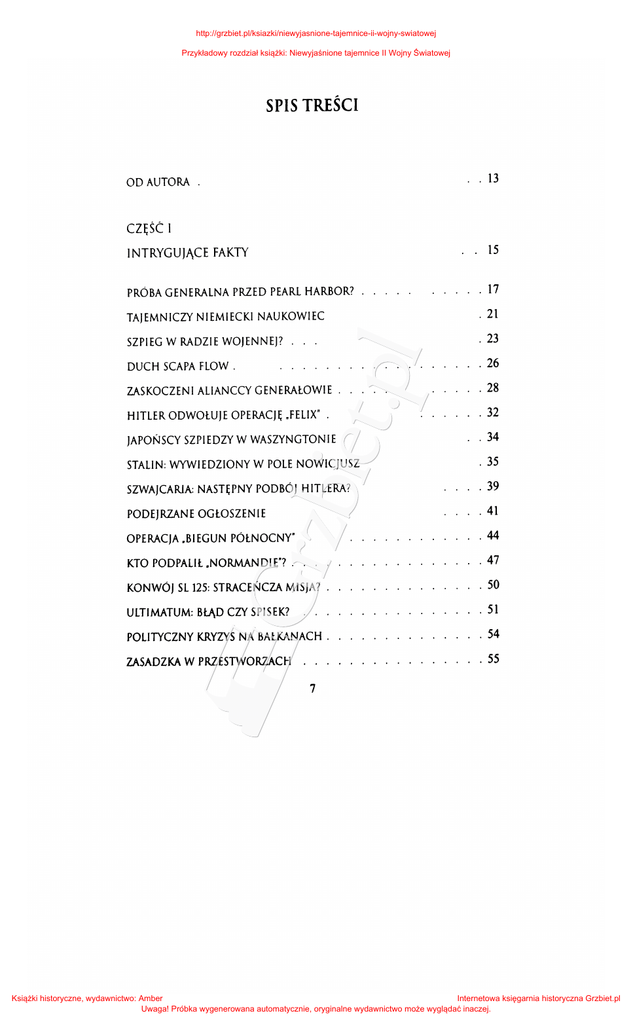 http://grzbiet.pl/ksiazki/niewyjasnione-tajemnice-ii-wojny-swiatowej Przykładowy rozdział książki: Niewyjaśnione tajemnice II Wojny Światowej SPIS TREŚCI . . 13 OD AUTORA . CZĘSĆ: l INTRYGUJĄCE . 15 FAKTY PRÓBA GENERALNA PRZED PEARL HARBOR? . 17 TAJEMNIClY NIEMIECKI NAUKOWIEC . 21 SZPIEG W RADZIE WOJENNEJ? . 23 DUCH SCAPA FLOW . . 26 ZASKOCZENI ALIANCCY GENERAŁOWIE . . 28 HITLER ODWOŁUJE JAPOŃSCY OPERACJĘ .FELIX" . SZPIEDZYW WASZYNGTONIE . 32 . 34 STALIN: WYWIEDZIONY W POLE NOWICJUSZ . 35 SZWAJCARIA: NASTĘPNY PODBÓJ HITLERA? . 39 PODEJRZANE . 41 OGŁOSZENIE .44 OPERACJA .BIEGUN PÓŁNOCNY" KTO PODPALIŁ.NORMANDIE"? . 47 . KONWÓJ SL 125: STRACEŃCZA MISJA? . . 50 . . . . 51 ULTIMATUM: BŁĄD ClY SPISEK? POLITYCZNY KRYlYS NA BAŁKANACH . . 54 . 55 ZASADZKA W PRZESTWORZACH 7 Książki historyczne, wydawnictwo: Amber Internetowa księgarnia historyczna Grzbiet.pl Uwaga! Próbka wygenerowana automatycznie, oryginalne wydawnictwo może wyglądać inaczej. http://grzbiet.pl/ksiazki/niewyjasnione-tajemnice-ii-wojny-swiatowej Przykładowy rozdział książki: Niewyjaśnione tajemnice II Wojny Światowej CZY LĄDOWANIE W NORMANDII BYŁO KONIECZNE? . FAŁSZERSTWO NA NAJWYŻSZYM SZCZEBLU . 58 . 61 CZĘŚĆ II OSOBLIWE ZBIEGI OKOLICZNOŚCI . 65 PONOWNE SPOTKANIE W SALI OPERACYJNEJ . 67 SZPIEG- ARYSTOKRATA . . 69 ZNAK NA POLU PSZENICY 70 DWAJ BRYTYJCZVCY, KTÓRYCH ZE SOBĄ MYLONO. 71 POCZTÓWKA Z NIEZWYKŁYM WIDOKIEM . . 71 PIĘCDZIESIĘCIU CHIRURGÓW NA WŁAŚCIWYM MIEJSCU . 72 PRÓBNY ALARM PRZECIWLOTNICZY . 72 NOWOJORSKI HANDLARZ URANEM . 74 SZPIEG. KTÓRY WYBRAŁ NIEWŁAŚCIWY DOM . 75 DWAJ ŚMIERTELNI WROGOWIE ZNÓW SIĘ SPOTYKAJĄ . 76 PATRZCIE POD NOGI! . . 77 DWAJ ŻOŁNIERZE POD SALERNO . . 79 SZCZĘŚLIWY TRAF . 80 DRUGI BILL PURDY ODNOSI ZWYCIĘSTWO . 82 GOŁĄB POCZTOWY POKONUJE KONKURENCJĘ . 82 JEDEN Z MILIONA SPADOCHRONÓW . . 84 MAPA ZNALEZIONA W NORMANDII . 85 GOŚC PANSTWA MAcARTHURÓW . . 86 SMUTNE ODKRYCIE NA CMENTARZU . 88 ROMMEL l MONTGOMERY . 88 ZGUBIONY NIEŚMIERTELNIK. . 90 .ZABITY" ŻOŁNIERZ POWRACA . 91 KAMIKAZE TRAFIA .CALLOWAY". . 92 ZDUMIEWAJĄCE ODKRYCIE SIOSTRY . 93 NIEROZŁĄCZNI BLIŻNIACY . 93 8 Książki historyczne, wydawnictwo: Amber Internetowa księgarnia historyczna Grzbiet.pl Uwaga! Próbka wygenerowana automatycznie, oryginalne wydawnictwo może wyglądać inaczej. http://grzbiet.pl/ksiazki/niewyjasnione-tajemnice-ii-wojny-swiatowej Przykładowy rozdział książki: Niewyjaśnione tajemnice II Wojny Światowej TU SPAŁA . 95 HITLEROWSM GRUBA RYBA POWROT GENERAŁA . 96 ARESZTOWANIE HITLEROWSKIEGO BONZV. . 97 CZĘSĆ: III NIEZWYKŁE . 99 ZDARZENIA 101 NIEPOKOJ W ETERZE PRZECIWNIK HITLERYZMU ROZPOCZYNA WOJNĘ 102 NIEUDANE PORWANIE 103 POŚMIERTNA PRZVSŁUGA 105 UCZVNNY NIEMIECKI KOMENDANT 105 TRENING PRZYSZŁEGO 107 PILOTA . SAMOLOT-WIDMO Z KIENOU 109 NIECIERPLIWY BOMBARDIER TRAFIA W CEL 111 DZIENNIKARZ WYGRYWA Z PRZECIWNOŚCIAMI 112 NIEMCY POMAGAJĄ STWORZVĆ AMERYKAŃSKĄ BOMBĘ ATOMOWĄ 113 PRZEJAŻDŻKA WIERZCHEM NA OKRĘCIE PODWODNYM. 117 PODWÓJNY AGENT. 118 ZBAWCZV BATONIK 121 GROM Z JASNEGO NIEBA 122 MARYNARZ. KTÓREGO OCALIŁ PRZYPADEK 123 NIEMIECKI PILOT DOŁĄCZA DO SWYCH OFIAR. 124 BOMBY UWALNIAJĄ WIĘŻNIÓW. 125 ŻOŁNIERZ. KTÓRY ZASPAŁ . . . 126 NIEOCZEKIWANE POŻEGNANIE Z BRONIĄ. 127 SPÓŻNIONA KAPITULAC)A NA WYSPIE GUAM 128 DZIWNA RANA . . . . . . . . 129 NIEMIECKI KURIER. 130 STARY CZŁOWIEK W OGRÓDKU 131 ZABŁĄKANY 9 Książki historyczne, wydawnictwo: Amber Internetowa księgarnia historyczna Grzbiet.pl Uwaga! Próbka wygenerowana automatycznie, oryginalne wydawnictwo może wyglądać inaczej. http://grzbiet.pl/ksiazki/niewyjasnione-tajemnice-ii-wojny-swiatowej Przykładowy rozdział książki: Niewyjaśnione tajemnice II Wojny Światowej DRZEMKA NA IWO )IMIE 132 SAMOBÓJCZA TORPEDA . 133 RADIOGRAM RATUJE OKRĘT . 135 CTY PRÓBOWANO WYKRAŚĆ ZWŁOKI HITLERA? 136 ŻYJĄCY NIEZNANY ŻOŁNIERZ 139 CZĘŚC IV NIEROZWIĄZANE ZAGADKI 141 CTYWIELKA BRYTANIA PRÓBOWAŁA PRZEKUPIĆ HITLERA? 143 KTO ZAINSPIROWAŁ JAPOŃCTYKÓW? . 144 CTY FRAU GOEBBELS BYŁA GOTOWA ZDRADZIĆ TRZECIĄ RZESZĘ? . SKĄPSTWO RZĄDU 146 FEDERALNEGO 147 SEKRET REINHARDA HEYDRICHA. 149 BRAKUJĄCA STRONA 150 ZAGINIONY NIEMIECKI RAPORT 151 LUFTWAFFE OSZCZĘDZA DOOLITTLE'A 152 ŁASICA ZNIKA 153 KTO PRÓBOWAŁ ZAMORDOWAĆ DE GAULLE'A?. 155 ZAGADKA ŚMIERCI JOEGO KENNEDY'EGO . 157 LATARNIA MORSKA W NORMANDII . 159 TAJEMNICTY GŁOS W ARDENACH 161 KTO ZATAIŁ RADZIECKĄ ZBRODNIĘ? 162 CZĘŚĆ V ZAGINIONE OSOBY . 165 POLSKI GENIUSZ . . . 167 TAJEMNICZA HRABINA 170 BŁĄD 171 MINISTRA PROPAGANDY. 10 Książki historyczne, wydawnictwo: Amber Internetowa księgarnia historyczna Grzbiet.pl Uwaga! Próbka wygenerowana automatycznie, oryginalne wydawnictwo może wyglądać inaczej. http://grzbiet.pl/ksiazki/niewyjasnione-tajemnice-ii-wojny-swiatowej Przykładowy rozdział książki: Niewyjaśnione tajemnice II Wojny Światowej I72 .ZACHOWAJ NAS. PANI" OSTATNIA MISJA GENERAŁA • o •••• 174 FREDDY. KREWNY CHURCHILLA I76 .DIABELSKI TR0JKĄT' 179 POSZUKIWANIA NIEMIECKIEGO GENERAŁA I80 BORMANN: CERBER FOHRERA 182 DZWON BIJE MARYNARZOWI 186 CZĘŚĆ I86 19. ESKADRY . . ZAGŁADA VI 189 NIESAMOWITE PRZECZUCIA NAGŁY 191 IMPULS CHURCHILLA 192 PRZECZUCIE PANI EISENHOWER . •POPRZEDNIE ŻVCIE" GENERAŁA PATTONA . .KAPITAN EDDIE" WIETRZYWIELKIE ,JESZCZE .CZUJĘ SIĘ KŁOPOTY 198 OPUSZCZA STAREGO PUŁKOWNIKA . .PRZYJACIELSKI OSTRZAŁ" 195 197 SPOTKAMY!" TO W TRZEWIACH!" SZCZĘŚCIE 193 201 POD ANZIO 202 NIEPOTRZEBNA ZAPALNICZKA . . . . ERNEST HEMINGWAY ZAMIENIA KRZESŁA 199 . 204 NOCNY KOSZMAR PANNY MŁODEJ . 205 PAITONA 207 PRZEBUDZENIE GENERAŁA OSTATNIA BITWA ERNIEGO PYLE'A 208 PAITON ŻEGNA SIĘ Z RODZINĄ 210 CZĘŚĆ VII DZIWNE SPOTKANIA. 2I5 ROOSEVELT SPOTYKA HITLEROWSKIEGO AGENTA 217 II Książki historyczne, wydawnictwo: Amber Internetowa księgarnia historyczna Grzbiet.pl Uwaga! Próbka wygenerowana automatycznie, oryginalne wydawnictwo może wyglądać 