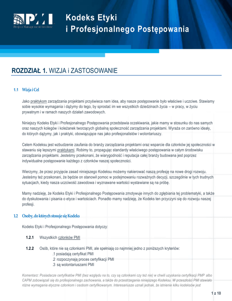Kodeks Etyki i Profesjonalnego Postępowania ROZDZIAŁ 1. WIZJA i ZASTOSOWANIE 1.1 Wizja i Cel Jako praktykom zarządzania projektami przyświeca nam idea, aby nasze postępowanie było właściwe i uczciwe. Stawiamy sobie wysokie wymagania i dążymy do tego, by sprostać im we wszystkich dziedzinach życia – w pracy, w życiu prywatnym i w ramach naszych działań zawodowych. Niniejszy Kodeks Etyki i Profesjonalnego Postępowania przedstawia oczekiwania, jakie mamy w stosunku do nas samych oraz naszych kolegów i koleżanek tworzących globalną społeczność zarządzania projektami. Wyraża on zarówno ideały, do których dążymy, jak i praktyki, obowiązujące nas jako profesjonalistów i wolontariuszy. Celem Kodeksu jest wzbudzenie zaufania do branży zarządzania projektami oraz wsparcie dla członków jej społeczności w stawaniu się lepszymi praktykami. Robimy to, propagując standardy właściwego postępowania w całym środowisku zarządzania projektami. Jesteśmy przekonani, że wiarygodność i reputacja całej branży budowana jest poprzez indywidualne postępowanie każdego z członków naszej społeczności. Wierzymy, że przez przyjęcie zasad niniejszego Kodeksu możemy nakierować naszą profesję na nowe drogi rozwoju. Jesteśmy też przekonani, że będzie on stanowił pomoc w podejmowaniu rozważnych decyzji, szczególnie w tych trudnych sytuacjach, kiedy nasza uczciwość zawodowa i wyznawane wartości wystawiane są na próbę. Mamy nadzieję, że Kodeks Etyki i Profesjonalnego Postępowania zmotywuje innych do zgłębiania tej problematyki, a także do dyskutowania i pisania o etyce i wartościach. Ponadto mamy nadzieję, że Kodeks ten przyczyni się do rozwoju naszej profesji. 1.2 Osoby, do których stosuje się Kodeks Kodeks Etyki i Profesjonalnego Postępowania dotyczy: 1.2.1 Wszystkich członków PMI 1.2.2 Osób, które nie są członkami PMI, ale spełniają co najmniej jedno z poniższych kryteriów: .1 posiadają certyfikat PMI .2 rozpoczynają proces certyfikacji PMI .3 są wolontariuszami PMI Komentarz: Posiadacze certyfikatów PMI (bez względu na to, czy są członkami czy też nie) w chwili uzyskania certyfikacji PMP albo CAPM zobowiązali się do profesjonalnego zachowania, a także do przestrzegania niniejszego Kodeksu. W przeszłości PMI stawiało różne wymagania etyczne członkom i osobom certyfikowanym. Interesariusze uznali jednak, że istnienie kilku kodeksów jest Strona 1 z 110z 10 niekorzystne i wszystkich powinien obowiązywać jeden zbiór przepisów promujący wysokie standardy. Tym samym Kodeks ten obowiązuje zarówno członków PMI, jak i osoby, które starają się o lub otrzymały certyfikację PMI, niezależnie od swojego członkostwa w PMI. 1.3 Układ Kodeksu Kodeks Etyki i Profesjonalnego Postępowania podzielony jest na części odpowiadające normom postępowania zgodnym z czterema wartościami, które społeczność PMI uznała za kluczowe. Niektóre z części Kodeksu zawierają komentarze. Komentarze nie stanowią jednak przepisów Kodeksu, zawierają natomiast przykłady i dodatkowe objaśnienia. Ostatnią część dokumentu stanowi słownik najważniejszych pojęć, którymi posługuje się Kodeks. Aby ułatwić korzystanie ze słownika, słowa i wyrażenia w nim wyjaśnione zostały wyróżnione w tekście Kodeksu podkreśleniem. 1.4 Wartości, na których opera się Kodeks Praktycy należący do ogólnoświatowej społeczności zarządzania projektami zostali poproszeni o stworzenie listy wartości, które są dla nich podstawowe w podejmowaniu decyzji i nadają kierunek wszelkim działaniom. Wartości uznane za najważniejsze to: odpowiedzialność, szacunek, sprawiedliwość i uczciwość. Niniejszy Kodeks uznaje te właśnie cztery wartości za swój fundament. 1.5 Powinności i obowiązki Każdy rozdział Kodeksu Etyki i Profesjonalnego Postępowania zawiera zarówno powinności, jak i obowiązki. Powinności są to normy postępowania, do których przestrzegania dążymy jako praktycy. Chociaż przestrzeganie tych standardów nie zawsze będzie możliwe do zmierzenia, to jednak są to normy, które jako praktycy, sami sobie narzucamy, i które nas wszystkich obowiązują. Obowiązki z kolei opisują bezwzględne wymagania, które w różnych przypadkach ograniczają lub zakazują pewnych zachowań. Praktycy postępujący niezgodnie z tymi zasadami, zostaną poddani procedurom dyscyplinarnym Komitetu Kontroli Etycznej PMI. Komentarz: Normy postępowania przewidziane przez niepisane zasady oraz postępowanie ujęte w zasadach pisanych nie wykluczają się wzajemnie. To oznacza, że konkretne działanie bądź też zaniechanie mogą stanowić pogwałcenie jednocześnie powinności i obowiązków. ROZDZIAŁ 2. ODPOWIEDZIALNOŚĆ 2.1 Definicja odpowiedzialności Odpowiedzialność to przyjęcie na siebie ciężaru odpowiadania za wszelkie decyzje i działania, zarówno podjęte jak i zaniechane oraz konsekwencje z nich wynikające. 2.2 Odpowiedzialność: powinności Jako praktycy w globalnej społeczności zarządzania projektami: 2 z 10 Strona 2 z 10 2.2.1 Podejmujemy decyzje i działania na podstawie najlepiej pojętego interesu społeczności, bezpieczeństwa publicznego i ochrony środowiska. 2.2.2 Akceptujemy jedynie te zadania, które są zgodne z naszym wykształceniem, doświadczeniem, umiejętnościami i kwalifikacjami. Komentarz: Gdy rozważane są zadania wymagające rozwoju i wykraczające poza posiadane kompetencje, zapewniamy, iż główni interesariusze terminowo otrzymują kompletne informacje, bez względu na braki w naszych kwalifikacjach, tak aby mogli podejmować świadome decyzje dotyczące naszej przydatności w konkretnym zadaniu. W przypadku zawierania i realizowania kontraktów, składamy ofertę tylko na pracę, którą nasza organizacja jest w stanie wykonać i jedynie odpowiednio wykwalifikowane osoby są przypisywane do jej wykonania. 2.2.3 Wypełniamy podjęte przez siebie zobowi