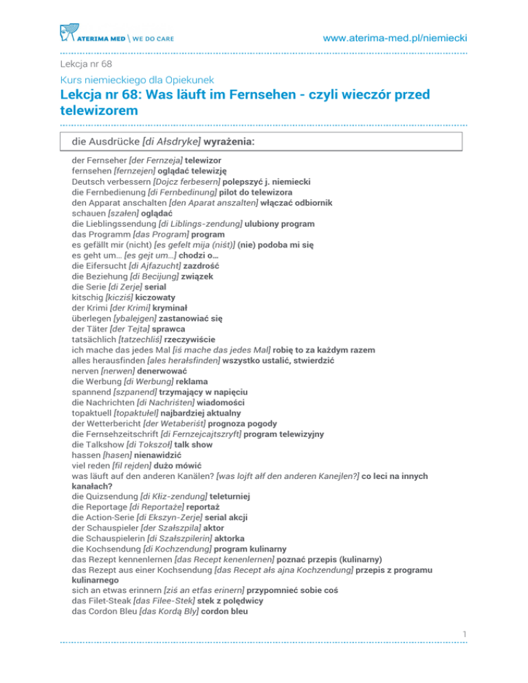 www.aterima-med.pl/niemiecki Lekcja nr 68 Kurs niemieckiego dla Opiekunek Lekcja nr 68: Was läuft im Fernsehen - czyli wieczór przed telewizorem die Ausdrücke [di Ałsdryke] wyrażenia: der Fernseher [der Fernzeja] telewizor fernsehen [fernzejen] oglądać telewizję Deutsch verbessern [Dojcz ferbesern] polepszyć j. niemiecki die Fernbedienung [di Fernbedinung] pilot do telewizora den Apparat anschalten [den Aparat anszalten] włączać odbiornik schauen [szałen] oglądać die Lieblingssendung [di Liblings-zendung] ulubiony program das Programm [das Program] program es gefällt mir (nicht) [es gefelt mija (niśt)] (nie) podoba mi się es geht um… [es gejt um…] chodzi o… die Eifersucht [di Ajfazucht] zazdrość die Beziehung [di Becijung] związek die Serie [di Zerje] serial kitschig [kicziś] kiczowaty der Krimi [der Krimi] kryminał überlegen [ybalejgen] zastanowiać się der Täter [der Tejta] sprawca tatsächlich [tatzechliś] rzeczywiście ich mache das jedes Mal [iś mache das jedes Mal] robię to za każdym razem alles herausfinden [ales herałsfinden] wszystko ustalić, stwierdzić nerven [nerwen] denerwować die Werbung [di Werbung] reklama spannend [szpanend] trzymający w napięciu die Nachrichten [di Nachriśten] wiadomości topaktuell [topaktułel] najbardziej aktualny der Wetterbericht [der Wetaberiśt] prognoza pogody die Fernsehzeitschrift [di Fernzejcajtszryft] program telewizyjny die Talkshow [di Tokszoł] talk show hassen [hasen] nienawidzić viel reden [fil rejden] dużo mówić was läuft auf den anderen Kanälen? [was lojft ałf den anderen Kanejlen?] co leci na innych kanałach? die Quizsendung [di Kłiz-zendung] teleturniej die Reportage [di Reportaże] reportaż die Action-Serie [di Ekszyn-Zerje] serial akcji der Schauspieler [der Szałszpila] aktor die Schauspielerin [di Szałszpilerin] aktorka die Kochsendung [di Kochzendung] program kulinarny das Rezept kennenlernen [das Recept kenenlernen] poznać przepis (kulinarny) das Rezept aus einer Kochsendung [das Recept ałs ajna Kochzendung] przepis z programu kulinarnego sich an etwas erinnern [ziś an etfas erinern] przypomnieć sobie coś das Filet-Steak [das Filee-Stek] stek z polędwicy das Cordon Bleu [das Kordą Bly] cordon bleu 1 www.aterima-med.pl/niemiecki etwas ist unglaublich lecker [etfas yst unglałbliś leka] coś jest nieprawdopodobnie/niewiarygodnie pyszne schmecken [szmeken] smakować aufhören [ałfhyren] przestawać quatschen [kwatszen] gadać, paplać etwas ist vorbei [etfas yst forbaj] coś przeminęło, skończyło się etwas geht weiter [etfas gejt wajta] coś trwa dalej verpassen [ferpasen] przegapić der Fernseher [der Fernzeja] telewizor das Fernsehen [das Fernsejen] telewizja die Glotze [di Gloce] (pot.) telewizor glotzen [glocen] gapić się w ekran fernsehen [fernzejen] oglądać telewizję ich sehe gerne fern [iś zeje gerne fern] chętnie oglądam telewizję das Satelliten-/Kabelfernsehen [das Zateliten- /Kabelfernzejen] telewizja satelitarna/kablowa der Fernsehkanal [der Fernzejkanal] kanał telewizyjny die Unterhaltung [di Untahaltung] zabawa das Frühstücksfernsehen [das Frysztyksfernzejen] telewizja śniadaniowa das Fernsehtheater [das Fernzejteata] teatr telewizji die Sportsendung [di Szportzendung] program sportowy die politische Sendung [di politisze Zendung] program polityczny die Kindersendung [di Kindazendung] program dla dzieci die Live-Sendung [di Lajf-Zendung] program na żywo die Musiksendung [di Muzikzendung] program muzyczny der Film [der Film] film der Abenteuerfilm [der Abentojafilm] film przygodowy die Komödie [di Komydie] komedia der Krimi [der Krimi] kryminał der Thriller [der Trila] thriller der Horror [der Horor] horror der Dokumentarfilm [der Dokumentarfilm] film dokumentarny der Zeichentrickfilm [der Cajsientrikfilm] film rysunkowy der Naturfilm [der Natułafilm] film przyrodniczy der Spielfilm [der Szpilfilm] film fabularny der Liebesfilm [der Liebesfilm] film romantyczny die Nachricht [di Nachryśt] wiadomość das Interview [der Intawju] wywiad das Kabarett [das Kabaret] kabaret sich etwas ansehen [ziś etfas anzejen] oglądać coś ich sehe mir eine Komödie an [iś zeje mija ajne Komydie an] oglądam komedię den Film unterbrechen [den Film untabresien] przerwać film den Film empfehlen [den Film empfejlen] polecić film den Film drehen [den Film drejen] kręcić film der Regisseur [der Reżyser] reżyser der Moderator [der Moderator] prowadzący der Sprecher [der Szpresia] spiker der Kommentator [der Komentator] komentator der Journalist [der Żurnalist] dziennikarz was läuft im Kino? [was lojft im Kino?] co leci w kinie? was läuft im Fernsehen? [was lojft im Fernzejen?] co leci w telewizji? was gibt es heute im Fernsehen? [was gibt es hojte im Fernzejen?] co jest dzisiaj w telewizji? interessant [interesant] interesujący unterhaltend [untahaltend] zajmujący, ciekawy langweilig [langwajliś] nudny 2 www.aterima-med.pl/niemiecki lustig [lustyś] zabawny traurig [trałryś] smutny anrührend [anryrend] poruszający Materiał stanowi własność firmy ATERIMA Sp. z o.o. Sp. K. ul. Puszkarska 7f, 30-644 Kraków. Reprodukcja, rozpowszechnianie lub inne wykorzystywanie całości lub części materiału w jakiejkolwiek formie dla celów innych, niż cele niekomercyjne i osobiste jest zakazane. 3 Powered by TCPDF (www.tcpdf.org)