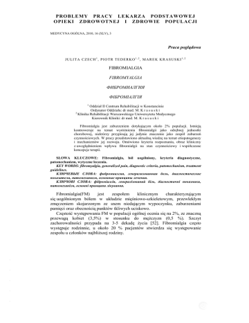 PROBLEMY PRACY LEKARZA PODSTAWOWEJ OPIEKI ZDROWOTNEJ I ZDROWIE POPULACJI MEDYCYNA OGÓLNA, 2010, 16 (XLV), 3 Praca poglądowa J U LI T A C Z E C H 1 , P I O T R TE D E R K O 1 , 2 , M A R E K K R A S U S K I 1 , 2 FIBROMIALGIA FIBROMYALGIA ФИБРОМИАЛГИЯ ФІБРОМІАЛГІЯ 1 Oddział II Centrum Rehabilitacji w Konstancinie Ordynator Oddziału: dr med. M. K r a s u s k i 2 Klinika Rehabilitacji Warszawskiego Uniwersytetu Medycznego Kierownik Kliniki: dr med. M. K r a s u s k i Fibromialgia jest zaburzeniem dotykającym około 2% populacji. Istnieją kontrowersje na temat wyróżnienia fibromialgii jako odrębnej jednostki chorobowej, niektórzy przypisują jej jedynie znaczenie jako zespół zaburzeń czynnościowych. W pracy przedstawiono aktualną wiedzę na temat etiopatogenezy i mechanizmów jej rozwoju. Omówiono kryteria rozpoznania, obraz kliniczny z uwzględnieniem wpływu fibromialgii na stan czynnościowy i współczesne koncepcje terapii. SŁOWA KLUCZOWE: Fibromialgia, ból uogólniony, kryteria diagnostyczne, patomechanizm, wytyczne leczenia. KEY WORDS: fibromyalgia, generalized pain, diagnostic criteria, patomechanism, treatment guidelines. КЛЮЧЕВЫЕ СЛОВА: фибромиалгия, генерализованная боль, диагностические показатели, патомеханизм, основные принципы лечения. КЛЮЧОВІ СЛОВА: фіброміалгія, генералізований біль, діагностичні показники, патомеханізм, основні принципи лікування. - - - - - Fibromialgia(FM) jest zespołem klinicznym charakteryzującym się uogólnionym bólem w układzie mięśniowo-szkieletowym, przewlekłym zmęczeniem skojarzonym ze snem niedającym wypoczynku, zaburzeniami pamięci oraz obecnością punktów tkliwych uciskowo. Częstość występowania FM w populacji ogólnej ocenia się na 2%, ze znaczną przewagą kobiet (3,5%) w stosunku do mężczyzn (0,5 %). Szczyt zachorowalności przypada na 3-5 dekadę życia [52]. Fibromialgia często występuje rodzinnie, u około 20 % pacjentów stwierdza się występowanie zespołu u członków najbliższej rodziny. 304 J. Czech, P. Tederko, M. Krasuski KRYTERIA ROZPOZNANIA I OBJAWY KLINICZNE - - - - - W 1990 roku Amerykańskie Towarzystwo Reumatologiczne (ACR - American College of Rheumatology) opublikowało kryteria rozpoznawcze FM: 1. Uogólniony, trwający dłużej niż 3 miesiące ból występujący po lewej i prawej stronie ciała, nad i pod przeponą oraz w osi ciała. 2. Bolesność uciskowa 11 z 18 „punktów tkliwych”(tender points - TP), rozmieszczonych symetrycznie w miejscach przyczepów ścięgien lub na ich przebiegu: — przyczepy mięśni podpotylicznych, — przestrzenie między wyrostkami poprzecznymi C5–C7, — górny brzeg mięśnia czworobocznego w połowie długości, — punkt leżący po środku nad grzebieniem łopatki, — połączenie chrzęstno-kostne II żebra, — 2 cm dystalnie od nadkłykcia bocznego kości ramiennej, — górny zewnętrzny kwadrant pośladka, — tylna powierzchnia wyniosłości krętarza większego, — okolica przyśrodkowa kolana, proksymalnie od szpary stawowej. Ucisk powinien być wywierany z siłą około 4 kg/cm2 kciukiem lub opuszkami palca wskazującego i środkowego. Oczekiwaną reakcją chorego jest reakcja werbalna, grymas twarzy, cofnięcie kończyny lub tułowia. Do rozpoznania fibromialgii powinny być spełnione oba kryteria, jednak brak bolesności wystarczającej liczby tkliwych punktów nie przesądza o jej wykluczeniu z powodu dużej zmienności tego objawu [50]. Kryteria ACR z 1990 r. skupiają się na aspekcie bólu. Jednakże pacjenci z fibromialgią oprócz nadwrażliwości na dotyk i ból zgłaszają też inne dolegliwości. Chroniczne zmęczenie zgłasza 78-94% osób z FM [32]. Sen nie dający wypoczynku, łatwe wybudzanie się, zaburzenia pamięci, uczucie sztywności, drętwienia, parestezje, nadmierne pocenie się, zawroty głowy, trudności z połykaniem, nudności, zaburzenia oddawania moczu nie wyczerpują długiej listy dodatkowych objawów [13, 52]. W 2010 ACR ogłosiło nowe kryteria diagnostyczne FM. Test tkliwych punktów zastąpiono indeksem bólu i skalą nasilenia objawów. Indeks bólu jest określany poprzez zliczenie liczby miejsc na ciele, w których pacjent odczuwał ból w ciągu ostatniego tygodnia. Wykaz obejmuje 19 określonych obszarów ciała. Wskaźnik nasilenia objawów to suma czteropunktowych (od 0 do 3) skal numerycznych mierzących intensywność zmęczenia, zaburzeń snu i zaburzeń poznawczych. Kolejne trzy punkty mogą być dodane w przypadku występowania dodatkowych objawów takich jak drętwienie, zawroty głowy, nudności, zespół jelita drażliwego i depresja. Wynik końcowy zawiera się między 0 a 12. By spełnić kryteria rozpoznania fibromialgii pacjent musi wskazać co najmniej 7 bolesnych obszarów i uzyskać co najmniej 5 punktów w skali nasilenia objawów. W przypadku wskazania 5-6 bolesnych miejsc, wskaźnik nasilenia objawów musi wynosić co najmniej 9. Objawy muszą być obecne co najmniej Fibromialgia 305 od trzech miesięcy i wykluczono schorzenia tłumaczące dolegliwości [49]. W różnicowaniu FM należy brać pod uwagę: — zaburzenia endokrynologiczne: niedoczynność tarczycy, nadczynność przytarczyc, niedobór witaminy D; — choroby neurologiczne: stwardnienie rozsiane, miastenię, neuropatie; — układowe choroby tkanki łącznej, reumatoidalne zapalenie stawów, toczeń trzewny, zesztywniające zapalenie stawów kręgosłupa; — zaburzenia psychiczne: depresja, osobowość borderline, nerwice; — działania uboczne leków takich jak: statyny, inhibitory monoaminooksydazy. Pomocne w ustaleniu rozpoznania są szczegółowy wywiad poparty dokładnym badaniem przedmiotowym oraz wyniki badań dodatkowych takich jak morfologia krwi obwodowej, OB, badanie 
