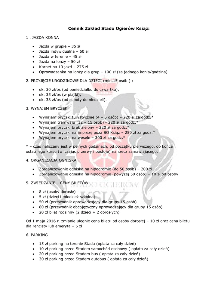 Cennik Zakład Stado Ogierów Książ: 1 . JAZDA KONNA Jazda w grupie – 35 zł Jazda indywidualna – 60 zł Jazda w terenie – 45 zł Jazda na lonży – 50 zł Karnet na 10 jazd – 275 zł Oprowadzanka na lonży dla grup – 100 zł (za jednego konia/godzina) 2. PRZYJĘCIE URODZINOWE DLA DZIECI (min.15 osób ) : ok. 30 zł/os (od poniedziałku do czwartku), ok. 35 zł/os (w piątki), ok. 38 zł/os (od soboty do niedzieli). 3. WYNAJEM BRYCZEK Wynajem Wynajem Wynajem Wynajem Wynajem bryczki turystycznie (4 – 5 osób) – 220 zł za godz.* tramwaju (12 – 15 osób) - 220 zł za godz.* bryczki brek zielony – 220 zł za godz.* bryczki na imprezę poza SO Książ – 250 zł za godz.* bryczki na wesele – 300 zł za godz.* * – czas naliczany jest w pełnych godzinach, od początku pierwszego, do końca ostatniego kursu (wliczając przerwy i postoje) na rzecz zamawiającego. 4. ORGANIZACJA OGNISKA Zorganizowanie ogniska na hipodromie (do 50 osób) – 200 zł Zorganizowanie ogniska na hipodromie (powyżej 50 osób) – 10 zł od osoby 5. ZWIEDZANIE – CENY BILETÓW 8 zł (osoby dorosłe) 5 zł (dzieci i młodzież szkolna) 50 zł (przewodnik oprowadzający dla grupy 15 osób) 80 zł (przewodnik obcojęzyczny oprowadzający dla grupy 15 osób) 20 zł bilet rodzinny (2 dzieci + 2 dorosłych) Od 1 maja 2016 r. zmianie ulegnie cena biletu od osoby dorosłej – 10 zł oraz cena biletu dla rencisty lub emeryta – 5 zł 6. PARKING 15 10 20 30 zł zł zł zł parking parking parking parking na terenie Stada (opłata za cały dzień) przed Stadem samochód osobowy ( opłata za cały dzień) przed Stadem bus ( opłata za cały dzień) przed Stadem autobus ( opłata za cały dzień) 7. Pensjonat - 6 pokoi (5 pokoi 2 osob.,1 pokój 3 osob.) wynajęcie całości pok. nr 1 pok. nr 2 pok. nr 3 pok. nr 4 pok. nr 5 pok. nr 6 ( 3os.) Wynajęcie czasowo zawieszone - 600,-zł / doba - 110 zł /doba - 100 zł /doba - 120 zł /doba - 120 zł /doba - 140 zł / doba -140 zł / doba 8. Wynajem terenu wynajem hipodromu dla grup do 50 osób - 1000 zł wynajem hipodromu powyżej 50 osób – cena ustalana indywidualnie** wynajem terenu wokół Stada - cena ustalana indywidualnie ** wynajem zabytkowej powozowni z przeznaczeniem na ucztę staropolska – od 100 zł/godz. max 30 osób ** Cena uzależniona od wielkości wynajmowanego terenu oraz od ilości uczestników 9. Oferta dla młodzieży szkolnej*** 1. przejazd wozami biesiadnymi, zwiedzanie z przewodnikiem zabytkowych stajni, ognisko – 15 zł/os 2. przejazd wozami biesiadnymi, zwiedzanie z przewodnikiem zabytkowych stajni, - 12 zł/os 3. zwiedzanie z przewodnikiem zabytkowych stajni, ognisko – 10 zł/os 4. przejazd wozami biesiadnymi, zwiedzanie z przewodnikiem zabytkowych stajni, oprowadzanka na koniu - 18 zł/os *** Dotyczy grup powyżej 15 osób, na każde 10 osób jeden opiekun wstęp wolny. 10. Oferta dla grup zorganizowanych Zwiedzanie zabytkowych stajni z przewodnikiem, przejazd wozami biesiadnymi, ognisko – 40 zł/osoba (grupa min. 10 osób) Weekend w siodle – jazdy konne od piątku do niedzieli - od 180 zł /os (4 jazdy indywidualne) Nauka powożenia zaprzęgiem jednokonnym – od 50 zł/os – 30 min Kursy farmerskie – podstawy pielęgnacji i żywienia koni, nauka siodłania i zaprzęgania koni, zapoznanie z obowiązkami i kompetencjami masztalerza, ognisko, certyfikat masztalerza –50 zł/os dla grup min. 12 os Organizacja pokazów – cena do uzgodnienia Przejażdżka bryczkami na terenie Książa i okolicach – od 25 zł/os dla grup min. 10 osób – 45 min. Organizacja imprez integracyjnych – cena do uzgodnienia **** Kwoty podane w cenniku są kwotami brutto