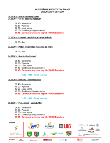 MŁODZIEŻOWE MISTRZOSTWA ŚWIATA DRZONKÓW 19-26.05.2014 20.05.2014 Wtorek - sztafety kobiet 21.05.2014 Środa - sztafety mężczyzn 08: 30 - Szermierka 12: 30 - Pływanie 14: 30 - Jazda konna 17: 00 - Kombinacja (bieg&strzelanie) 18: 15 - Ceremonia wręczenia nagród - WOSiR Drzonków 22.05.2014 Czwartek - kwalifikacje kobiet do finału 09: 00 - Start 23.05.2014 Piątek - kwalifikacje mężczyzn do finału 08: 00 - Start 24.05.2014 Sobota - finał kobiet 08: 40 - Szermierka 13: 00 - Pływanie 15: 00 - Jazda konna 17: 30 - Kombinacja (bieg&strzelanie) 18: 45 - Ceremonia wręczenia nagród - WOSiR Drzonków 12:00 - 19.00 - Piknik rodzinny 25.05.2014 Niedziela - finał mężczyzn 08: 40 - Szermierka 13: 00 - Pływanie 15: 00 - Jazda konna 17: 30 - Kombinacja (bieg&strzelanie) 18: 45 - Ceremonia wręczenia nagród - WOSiR Drzonków 12:00 - 19.00 - Piknik rodzinny 26.05.2014 Poniedziałek - sztafety MIX 08: 30 - Szermierka 11: 30 - Pływanie 13: 00 - Jazda konna 15: 30 - Kombinacja (bieg&strzelanie) 16: 15 - Ceremonia wręczenia nagród - WOSiR Drzonków