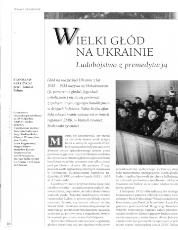 SPRAWY UKRAINSKIE lELKI GLOD NA UKRAINIE Ludohojstwo z premedytacjq STANISLAW KULCZYCKI przel. Tomasz Bohun Glod na radzieckiej Ukrainie z lat 1932 - 1933 nazywa si^ Hohdomorem (tj. pomorem z gtodu). Jego skali i okolicznosci nie da si^ porownac Z zadnym innym tego typu kataklizmem w dziejach ludzkosci. Takze liczba ofiar Czlonkowie radzieckiego politbiura na XVll Zjezdzie WKP(b), siedzi} od lewej w pierwszym rz^dzie: Walerian Kujbyszew, Sergo Ordzonikidze, Kliment Woroszylow, Jozef Stalin, Lazar Kaganowicz, Siergiej Kirow, Stanislaw Kosior. Po prawej stoi Pawel Postyszew, ktorego Stalin wysial w styczniu 1933 roku na Ukraine hyla zdecydowanie v\yzsza niz w innych regionach ZSRR, w ktdrych rowniez hrakowalo zywnosci. M o z n a si? zastanawiac, czy u z n a c za z b r o d n i ? smierc setek tysi?cy l u d z i w r o z n y c h regionach Z S R R , ktorej p o w o d e m byly przymusowe dostawy z b o z a sprzedawanego potem przez p a n s l w o za granicq. Lecz n a U k r a i n i e m i e l i s m y do czynienia ze smierci^ glodowq spowodowanq konfiskatq wszelkiej z y w n o s c i (nie tylko zboza) p o d pretekstem dostaw dla paristwa. Z tego p o w o d u wedle najbardziej ostroznych szacunkow n i e z a d o w o l e n i a spolecznego. w U k r a i h s k i e j Socjalistycznej R e p u b l i c e b y l o m a k s y m a l n e spot?gowanie k l ? s k i g l o d u . dzieckiej ( U S R R ) z m a r l o w latach 1932 - Ra1933 az 3,5 m l n l u d z i . Ludobojstwo moze przybrac form? klasycznej czystki etnicznej - zorganizowanej zaglady, ma- 16 C e l e m tej akcji Stalin i s p o l k a kierowaU si? chytrg kalkulacjg, ze c z l o w i e k p o z b a w i o n y m o z l i w o s c i zdobycia z y w n o s c i nie b?dzie si? w stanie z d o b y c na aktywny protest. sowych rzezi, pogromow, ale takze eksterminacji 1 listopada 1932 r o k u nalez^cy do scislego wskutek g l o d u . Tureckie ludobojstwo O r m i a n k i e r o w n i c t w a panstwa czlonek K o m i t e t u Cen- i niemieckie Z y d o w to typowe p r z y k l a d y czystki tralnego i Biura Politycznego Wszechzwiqzkowej etnicznej. Pytanie, czy m o z n a zahczyc do niej Komunistycznej Partii (bolszewikow) t a z a r Ka- W i e l k i G l o d . Ukrainskie srodowiska patriotyczne ganowicz podczas obrad Okr?gowego Komitetu nazywajq go u k r a i h s k i m Holokaustem i uwazajq, W K P ( b ) Polnocnego K a u k a z u zalecil przedsi?- ze m o z n a go p o r o w n y w a c z tragediami, k t o r y m wzi?cie s r o d k o w k a r n y c h przeciw l u d n o s c i nie- bezspornie p r z y z n a n o status ludobojstwa. wywi^zujqcej si? z n o r m dostaw z b o z a . J e d n y m K r e m l skonfiskowal cal^ zywnosc z ogami?tej z n i c h m i a l o bye przesiedlenie o p o r n y c h w p o l - glodem ukrairiskiej wsi, aby zapobiec w y b u c h o w i n o c n e rejony europejskiej cz?sci Z S R R . B?dgc z gospodarskq wizyt^ \ Stanley Miedwiedowskiej, d n i o w e k . W praktyce w i ? k s z o s c p l o n o w wcale stwierdzil wprost: Przesiedlimy na Polnoc wszyst- i m nie p r z y p a d a l a . kich, ktorzy nie chcq siac [obsiewac pol]! J u z K r y z y s e k o n o m i c z n y , j a k i ogarnql swiat w la- w hstopadzie z K u b a n i a w y s i e d l o n o p o n a d tach 1929 - 1933, s p o w o d o w a l g w a l t o w n y 60 tys. c h l o p o w i K o z a k o w . P o d o b n i e bylo n a spadek cen p r o d u k t o w r o l n y c h , o p r o c z surow- Ukrainie. c o w najwazniejszych towarow eksportovvych Z S R R . A b y pozyskac waluty w y m i e n i a l n e n a GLOD JAKO NARZ^DZIE REPRESJI z a k u p technologii i m a s z y n n i e z b ? d n y c h d o Bolszewicy pierwszy raz si?gn?li p o t? metod? forsownej industrializacji, a takze splacac biezqce na U k r a i n i e w 1921 r o k u , aby z l i k w i d o w a c kredyty, w i a d z e radzieckie musiaiy sprzedawac tzw. k u l a c k i bandytyzm. W t e d y sci^gano zalegle za granic? coraz wi?cej zboza. W z w i q z k u z tym k o n i y n g e n t y aprowizacyjne z d o t k n i ? t y c h j u z zacz?to srubowac n o r m y k o n t y n g e n t o w z b o - g l o d e m guberni p o l u d n i o w y c h . J e d n a k z e g l o d zo\\7ch. wynikal z przyczyn naturalnych - przede wszystk i m z suszy. G d y c h l o p i z d a l i sobie spraw?, ze w i a d z e chcg i m zabrac Iwiq cz?sc zboza, zacz?li sabotowac i tak malo wydajn^ prac? w gospodarstwach k o l e k t y w n y c h . N i e b y l i zainteresowani w)Tabianiem n o r m , nie widzqc w t y m k o r z y s c i . W czasie zbior o w marnotrawiono lub chowano duze ilosci ziarna. Podczas m l o c k i k o l c h o z n i c y chytrze o d r z u c a l i cz?sc z i a r n a w s l o m ? i plewy, p o n i e w a z tych odpad o w nie zaliczano w poczet k o n t y n gentu. K r e m l katastrofalne obnizenie dostaw k o n t y n g e n t o w y c h t l u m a c z y l zorganiz o w a n y m sabotazem chlopow i kra- d z i e z a m i n a masowq skal?. 7 sierpnia 1932 r o k u Stalin osobiscie s l o r m u l o w a l u c h w a l ? Wszechrosyjskiego Central- nego K o m i t e t u W y k o n a w c z e g o R a d i Rady K o m i s a r z y L u d o w y c h ZSRR (odpowiednika rady „ 0 ochronie mienia ministrow) przedsi?biorstw pahstwowych, k o l c h o z o w i kooperatyw oraz o w z m o c n i e n i u w l a s n o s c i spolecznej (socjalistycznej)", ktora w p r o wadzila drakohskie kary. Kradziez mieW 1929 r o k u Stalin p r z y p u s c i l n o w y s z t u r m nia k o l c h o z o w miala bye karana rozstrzelaniem, na U k r a i n ? , chcqc dokonac tego, co nie u d a l o a p r z y „okohcznosciach lagodzqcych" pozba- si? L e n i n o w i : zmusic dziesigtki m i l i o n o w r o l - w i e n i e m w o l n o s c i o d dziesi?ciu lat w z w y z . n i k o w d o przystqpienia d o k o m u n r o l n y c h . D o K r y z y s gospodarczy w Z S R R p o g l ? b i a l si?. poczqtku lat trzydziestych wiadze nie rozroznialy W i a d z e n a K r e m l u musiaiy m o c n o ograniczyc pseudospoldzielczych k o t c h o z o w o d panstwo- w y d a t k i n a o b r o n n o s c panstwa i strategiczne w y c h sowchozow: produkcja