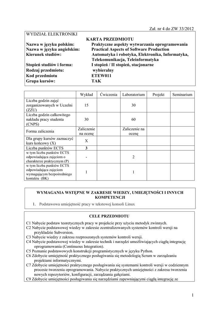 Zał. nr 4 do ZW 33/2012 WYDZIAŁ ELEKTRONIKI Nazwa w języku polskim: Nazwa w języku angielskim: Kierunek studiów: Stopień studiów i forma: Rodzaj przedmiotu: Kod przedmiotu Grupa kursów: KARTA PRZEDMIOTU Praktyczne aspekty wytwarzania oprogramowania Practical Aspects of Software Production Automatyka i robotyka, Elektronika, Informatyka, Telekomunikacja, Teleinformatyka I stopień / II stopień, stacjonarne wybieralny ETEW011 TAK Wykład Liczba godzin zajęć zorganizowanych w Uczelni (ZZU) Liczba godzin całkowitego nakładu pracy studenta (CNPS) Forma zaliczenia Dla grupy kursów zaznaczyć kurs końcowy (X) Liczba punktów ECTS w tym liczba punktów ECTS odpowiadająca zajęciom o charakterze praktycznym (P) w tym liczba punktów ECTS odpowiadająca zajęciom wymagającym bezpośredniego kontaktu (BK) Ćwiczenia Laboratorium 15 30 30 60 Zaliczenie na ocenę Zaliczenie na ocenę Projekt Seminarium X 3 - 2 1 1 WYMAGANIA WSTĘPNE W ZAKRESIE WIEDZY, UMIEJĘTNOŚCI I INNYCH KOMPETENCJI 1. Podstawowa umiejętność pracy w tekstowej konsoli Linux CELE PRZEDMIOTU C1 Nabycie podstaw teoretycznych pracy w projekcie przy użyciu metodyk zwinnych. C2 Nabycie podstawowej wiedzy w zakresie zcentralizowanych systemów kontroli wersji na przykładzie Subversion. C3 Nabycie wiedzy z zakresu rozproszonych systemów kontroli wersji. C4 Nabycie podstawowej wiedzy w zakresie technik i narzędzi umożliwiających ciągłą integrację oprogramowania (Continuous Integration). C5 Poznanie podstawowych konstrukcji programistycznych w języku Python. C6 Zdobycie umiejętność praktycznego posługiwania się metodologią Scrum w zarządzaniu projektami informatycznymi. C7 Zdobycie umiejętności praktycznego posługiwania się systemami kontroli wersji w codziennym procesie tworzenia oprogramowania. Nabycie praktycznych umiejętności z zakresu tworzenia nowych repozytoriów, konfiguracji, zarządzania gałęziami. C9 Zdobycie umiejętności posługiwania się narzędziami zapewniającymi ciągłą integrację ze 1 szczególnym uwzględnieniem narzędzi Jenkins/Hudson. C10 Nabycie podstawowych umiejętności programowania obiektowego w języku Python. C11 Nabycie podstawowych umiejętności tworzenia prostych scenariuszy testów jednostkowych. PRZEDMIOTOWE EFEKTY KSZTAŁCENIA Z zakresu wiedzy: PEK_W01 Posiada wiedzę o cyklu życia projektu i metodach zarządzania kompleksowymi projektami informatycznymi. PEK_W02 Posiada wiedzę z zakresu scentralizowanych i rozproszonych systemów kontroli wersji, ich charakterystyk i podstawowych różnic. PEK_W03 Posiada wiedzę dotyczącą ciągłej integracji (CI), jej znaczenia w cyklu życia oprogramowania oraz wpływu CI na jakość wytwarzanego oprogramowania. PEK_W04 Zna specyfikę tworzenia aplikacji obiektowych w języku Python. Z zakresu umiejętności: PEK_U01 Potrafi użyć metodologii Scrum do prowadzenia projektu informatycznego. PEK_U02 Potrafi wykorzystać podstawowe systemy kontroli wersji do zarządzania jakością i integralnością oprogramowania. PEK_U03 Potrafi skonfigurować i wykorzystać narzędzia ciągłej integracji oprogramowania do kolejkowania i zrównoleglenia budowy oprogramowania. PEK_U04 Posiada praktyczne podstawy programowania obiektowego i przetwarzania danych i testowania oprogramowania w języku Python. Z zakresu kompetencji społecznych: PEK_K01 – ma świadomość wpływu zarządzania wersjami oprogramowania (Software Configuration Management) na integralność, odtwarzalność i jakości tworzonego oprogramowania. TREŚCI PROGRAMOWE Wy1 Wy2 Wy3 Wy4 Wy5 Forma zajęć – wykład Umieszczenie tematyki poszczególnych wykładów w kontekście pracy dużego projektu programistycznego. Omówienie obszarów prezentowanych w ramach cyklu oraz zależności pomiędzy nimi. Podstawy metodyk zwinnych. Pojęcia, role i reguły na przykładach z codziennego życia projektu programistycznego. Zalety i wyzwania pojawiające się podczas pracy zorganizowanej przy pomocy Agile. Wprowadzenie do systemów kontroli wersji. Charakterystyka Subversion jako jednego z najpopularniejszych systemów kontroli wersji. GIT jako przykład rozproszonego systemu kontroli wersji. Cechy oraz możliwości GIT’a, jako nowoczesnego systemu kontroli wersji. GIT Workflows - różne warianty pracy z narzędziem GIT. Wprowadzenie do systemów Continuous Integration. Charakterystyka systemów CI na przykładzie narzędzia Jenkins/Hudson. Alternatywne systemy CI. Liczba godz. 1 2 2 2 2 Wy6 Podstawy programowania w języku Python: podstawowe typy danych, podstawowe operacje na liczbach i napisach, instrukcje sterujące, funkcje, realizacja obiektowości (klasy, metody, dziedziczenie). 2 Wy7 Podstawy programowania w języku Python: struktury danych (listy, słowniki, krotki), operacje na strukturach danych, obsługa modułów, wyjątki, podstawowe operacje na plikach. 2 Testowanie kodu w języku Python. Suma godzin 2 15 Wy8 2 Forma zajęć - laboratoria Liczba godzin L1 Szkolenie stanowiskowe BHP. Sprawy organizacyjne. Wprowadzenie – przygotowanie stanowisk do ćwiczeń semestralnych. 3 L2-3 Praktyczne wykorzystanie metodyk zwinnych na przykładach z codziennego życia projektu programistycznego. Workshop. 4 L4 Praktyczne użycie systemu kontroli wersji SVN. Uruchomienie serwera SVN lokalnie, wstępna konfiguracja, polaczenie z serwerem SVN, użycie podstawowych komend systemu. 2 L5-6 Praca z systemem GIT. Użycie głównych elementów takich jak: submoduły, gałęzie, remote’y, wskaźniki. 4 L7-8 Instalacja, konfiguracja i administracja Jenkinsem. Definiowanie zadań (jobs) w Jenkinsie, konfigurowanie zaawansowanych opcji, pluginy, połączenie z systemem kontroli wersji. 4 L9 Poznanie interpretera języka Python. Wykorzystanie podstawowych instrukcji języka Python (print, import, help, dir) 2 L10 Operacje na typach danych w języku Python. Tworzenie struktur danych (lista, słownik, krotka), operacje na strukturach danych, kontrola przypływu danych (if, fo