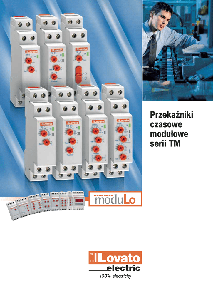 Przekaźniki czasowe modułowe serii TM 100% electricity Przekaźniki czasowe modułowe Możliwość montażu wkrętami Duże zaciski LOVATO Electric powiększa ofertę elektronicznych przekaźników czasowych o nową serię modułową przekaźników TM . Wersje wielozakresowe: od 1 s do 100 dni Szeroki zakres napięć zasilania 12…240VAC/DC Wyjątkowa dokładność i stabilność nastaw czasowych Odporność na zakłócenia przemysłowe Temperatura pracy od -20 do +60°C Obudowa modułowa DIN43880, o szerokości jednego modułu - 17,5 mm Montaż na szynie DIN 35mm lub wkrętami (specjalne klipsy) Średnica przewodów od 0,2 do 4 mm2 Odpowiednie do pracy w różnych warunkach Przekaźniki czasowe KOD ZAMÓWIENIA TM P TM M1 TM M2 TM PL TM D TM ST Opóźnione zadziałanie Programowalny, wielofunkcyjny Programowalny, wielofunkcyjny Praca cykliczna asymetryczna Opóźnione odpadanie Rozruch silnika gwiazda-trójkąt 24-240VAC/DC 24-48VDC 24-240VAC OPIS ZASILANIE Znamionowe napięcie zasilania (Us) 24-48VDC 24-240VAC 12-240VAC/DC ZAKRESY CZASOWE Zakresy czasowe Wielozakresowy 0.1-1s 1-10s 6s-1min 1-10min 6min-1h 1-10h 0.1-1 dzień 1-10 dni ON tylko OFF tylko Wielozakresowy 0.1-1s 1-10s 6s-1min 1-10min 6min-1h 1-10h 0.1-1 dzień 1-10 dni ON tylko OFF tylko Wielozakresowy 0.1-1s 1-10s 6s-1min 1-10min 6min-1h 1-10h 0.1-1 dzień 1-10 dni ON tylko OFF tylko Wielozakresowy 0.1-1s 1-10s 6s-1min 1-10min 6min-1h 1-10h 0.1-1 dzień 1-10 dni 3-30 dni 10-100 dni Wielozakresowy 0.06-0,6s 0.6-6s 6s-1min 12s-2min Wielozakresowy 0.1-1s 1-10s 6s-1min 1-10min 1 opóźniony przełączny 1 opóźniony przełączny 1 bezzwłoczny/opóźniony zwierny + 1 opóźniony przełączny 1 opóźniony przełączny 1 opóźniony przełączny 2 opóźnione zwierne 5A 8A ZESTYKI WYJŚCIOWE Ilość i rodzaj zestyków Maksymalne napięcie łączeniowe 250VAC Obciążalność prądowa (Ith) 8A INNE INFORMACJE Temperatura pracy Ilość w opakowaniu [n°] Masa [kg] -20…+60°C 1 0.048 0.053 0.078 0.060 Automat schodowy OPIS ZESTYKI WYJŚCIOWE Oświetlenie schodowe Obciążalność prądowa (Ith) ZASILANIE Znamionowe napięcie zasilania (Us) 220-240VAC Jeden zakres 0.5-20min 1 opóźniony zwierny 250VAC 16A INNE INFORMACJE Temperatura pracy ZESTYKI WYJŚCIOWE Zakres nastaw czasu Ilość i rodzaj zestyków Maksymalne napięcie łączeniowe Ilość w opakowaniu [n°] Masa [kg] -20…+60°C - podłączenie maksimum 50 elementów świetlnych - do stosowania w sieciach 3 i 4 przewodowych - przełącznik działania ręcznego lub automatycznego (świecenie ciągłe) - Specjalna funkcja czasowa: jeżeli przycisk będzie wciśnięty przez czas dłuższy niż 3 sek., to przekaźnik czasowy zostanie w stanie zadziałania przez czas 1 godziny. Przy ponownym naciśnięciu przycisku przez czas dłuższy niż 3 sek., przekaźnik czasowy przejdzie w stan niezadziałania 1 0.060 KOD ZAMÓWIENIA TM LS Funkcje czasowe i schematy połączeń A1-A2 = Zasilanie ON = Wskaźnik LED włączonego zasilania = Wskaźnik LED stanu przekaźnika Opóźnione zadziałanie. Odmierzanie czasu do zadziałania od chwili załączenia napięcia zasilania TM P A1 A1 A2 ON 15 E D F G H C I B J A A2 16 18 15 TM M1 18 16 t TM M2 S S S A1 S 15 A1 S 15 23 A1 S 15 27 A2 16 18 A2 16 18 24 A2 16 18 28 Przy przełączniku ustawionym w pozycji INST, zestyk (23-24) zostanie załączony bezzwłocznie po załączeniu napięcia zasilania. Przy przełączniku ustawionym w pozycji DEL, zestyk (27-28) zachowuję się tak samo jak zestyk (15-18). DEL INST Opóźnione zadziałanie. Odmierzanie czasu do zadziałania od chwili załączenia napięcia zasilania D E F D H B I D E F J A B I 15 16 t E F B E F D C I B 15 16 t t D H I t 15 t t t t (przerwa) (praca) (przerwa) (praca) 0,5s Start od zadziałania A1 S 15 A2 16 18 A1 A2 ON H I B S-A1 J A Praca cykliczna, symetryczna. Start od zadziałania. 18 16 t 15 E F D G C H B I A F 18 15 16 J t t W 18 16 t P S-A1 15 t P H I A 18 W G B J P A1 A2 ON C S W Start od przerwy A1 A2 ON E 18 16 t Opóźnione zadziałanie-odpadanie. Opóźnione zadziałanie sterowane przez zamknięcie zestyku zewnętrznego, opóźnione odpadanie sterowane przez otwarcie zestyku zewnętrznego. A1 A2 H I J G C S G t J A 18 t t t t (praca) (przerwa) (praca) (przerwa) 16 TM PL F F 18 0,5s E E A 18 G B 16 J A J C 18 H A1 A2 ON D H I J A G Odmierzanie nastawionego czasu zadziałania, sterowane zestykiem zewnętrznym ON G A1 A2 ON S 15 D F B Generator impulsu. Start od odmierzenia nastawionego czasu impulsu i stały czas załączenia 0.5 sek C t A1 A2 ON E C S Odmierzanie nastawionego czasu zadziałania, sterowane zestykiem zewnętrznym 18 16 H D H Praca cykliczna, symetryczna. Start od przerwy. 15 D G I G C A 16 F B A1 A2 ON A1 A2 ON 16 E C 18 15 t Odmierzanie nastawionego czasu zadziałania start w chwili załączenia napięcia zasilania 15 S J A 15 A1 A2 ON G C 18 16 Pojedynczy impuls, sterowanie zestykiem zewnętrznym. Każde załączenie zestyku zewnętrznego powoduje zamknięcie lub otwarcie zestyku przekaźnika A1 A2 ON A1 A2 ON 15 Opóźnione odpadanie, sterowanie zestykiem zewnętrznym P W Funkcje czasowe i schematy połączeń A1-A2 = Zasilanie = Wskaźnik LED włączonego zasilania ON = Wskaźnik LED stanu przekaźnika Opóźnione odpadanie, start od chwili zaniku napięcia zasilania TM D A1 15 TM ST Rozruch silnika gwiazda-trójkąt A1 A2 A1 A1 A2 ON 17 18 17 ON A2 16 18 15 18 A2 16 18 28 17 28 t start czas prze?àczania TM LS Automat schodowy N 3 N 3 L N L N ON ON L/N L 4 L N L 3 4 >3s >3s >3s L L N 4 L t Ø4.2 t 1h 43.7 Wymiary [mm] Certyfikaty i zgodność z normami 45.0 90.0 104.7 98.3 Certyfikaty: cULus Zgodność z normami: IEC/EN 61812-1. 5 17,5 58 59.9 LOVATO Electric oferuje także pełny zakres przekaźników czasowych w następujących wersjach. Przekaźniki czasowe do montażu na szynę DIN 31 AT1P… 31 AT1CP… 31 ATD… 31 AT1DP… Opóźnione zadziałanie. Wielozakresowy. Wielonapięciowy AC. 1 zestyk przełączny. Opóźnione zadziałanie. Wielozakr