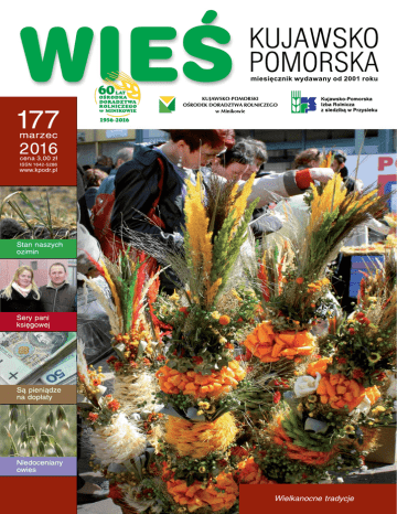 Proste, wszechstronne i sprawdzone narzędzie każdego gospodarza... Ciągnik Kubota serii M60 to niezastąpione narzędzie w Twoim gospodarstwie! | | | | Niskie spalanie Doskonała zwrotność Prosta konstrukcja Trwałość i niezawodność www.traktorykubota.pl Skontaktuj się z Twoim lokalnym dilerem i poznaj promocyjne oferty finansowania fabrycznego Kubota Finance STACJA DOŚWIADCZALNA OCENY ODMIAN CHRZĄSTOWO Lista odmian zalecanych 28 stycznia odbyło się posiedzenie Kujawsko-Pomorskiego Zespołu Porejestrowego Doświadczalnictwa Odmianowego, podczas którego na podstawie wyników doświadczeń PDO utworzono Listę odmian Jęczmień jary zalecanych (LOZ) dla województwa kujawsko-pomorskiego na rok 2016. Znajdujące się na tej liście odmiany potwierdziły dużą przydatność do uprawy w warunkach naszego województwa. Pszenica zwyczajna jara Pszenżyto jare Lista odmian zalecanych obejmuje odmiany zbóż, rzepaku, grochu siewnego, łubinu wąskolistnego i żółtego oraz ziemniaka jadalnego. Informacje o odmianach dostępne są na stronie www.chrzastowo.coboru.pl. Owies zwyczajny Ziemniak odmiany jadalne 1 Basic 1 Arabella (A) 1 Dublet 1 Arden 2 Ella 2 Harenda (B) 2 Mazur 2 Bingo 1 Arielle 3 KWS Atrika 3 Kandela (A) 3 Komfort 2 Denar 4 KWS Olof 4 KWS Torridon (A) Owies nagi 3 Lord 5 Penguin 5 Tybalt (A) 1 4 Miłek 6 Soldo Nagus wczesne Groch siewny odmiany ogólnoużytkowe 1 bardzo wczesne Groch siewny odmiany pastewne Łubin wąskolistny Rzepak jary Akord 1 Hubal 1 1 2 Turnia 2 Batuta 3 Mecenas 4 Tarchalska Dalbor Gandalf 1 Gwiazda 2 Ignacy 3 Michalina 4 Vineta 2 Heros 2 Lennon 3 Kalif 3 Tamarin 1 Finezja Łubin żółty 4 Regent 4 2 Satina 1 Baryt 5 Tango 5 Delight F1 3 Tajfun 2 Bursztyn 6 Wars 6 Pszenica zwyczajna ozima 1 Arkadia (A) średniowczesne Kaliber F1 Legolas F1 Jęczmień ozimy Pszenżyto ozime Żyto ozime 1 1 Borowik 1 Dańkowskie Amber 1 ES ValegroR Antonella Rzepak ozimy 2 Artist (B) 2 KWS Meridian 2 Fredro 2 Horyzo 2 Monolit 3 Fakir (B) 3 Souleyka 3 MelomanR 3 Stanko 3 Lohana 4 Julius (A) 4 SU Melania 4 Pizarro 4 4 Sherlock 5 KWS Livius (B) 5 Titus 5 Tomko 5 SU Performer F1R 5 6 KWS Ozon (B) 6 Zenek 6 Twingo 6 6 DK Explicit F1 7 Linus (A) Tur F1 8 Pengar (B) Objaśnienia: 9 Praktik (A) A – odmiany jakościowe, B – odmiany chlebowe 10 Sailor (A) F1 – mieszaniec 11 Speedway (B) R SU Stakkato F1 7 8 9 10 Marathon F1 Marcopolos F1 SY Cassidy F1 SY Kolumb F1 Visby F1 – odmiana wstępnie rekomendowana Małgorzata Woropaj-Janczak COBORU Stacja Doświadczalna Oceny Odmian w Chrząstowie Fot. W. Janiak 4 Wieś Kujawsko-Pomorska marzec 2016 Charakterystyka odmian jęczmienia jarego RGT Planet STACJA DOŚWIADCZALNA OCENY ODMIAN CHRZĄSTOWO Nowości w zbożach jarych W styczniu tego roku do Krajowego rejestru wpisano 17 nowych odmian zbóż jarych: 4 pszenicy zwyczajnej, 10 jęczmienia, 2 owsa zwyczajnego i 1 pszenżyta. W artykule przedstawiono charakterystykę nowozarejestrowanych odmian, jej autorami są pracownicy COBORU: mgr inż. Andrzej Najewski, mgr inż. Joanna Szarzyńska, mgr Anna Skrzypek, mgr inż. Anna Stroiwąs. Na końcu opisu zamieszczony jest adres hodowcy odmiany lub jego pełnomocnika. Charakterystyka odmian pszenicy zwyczajnej jarej Nimfa Jakościowa odmiana chlebowa (grupa A). Plenność dobra. Przyrost plonu przy uprawie na wysokim poziomie agrotechniki poniżej średniej. Odporność na rdzę żółtą duża, na mączniaka prawdziwego i rdzę brunatną dość duża, na choroby podstawy źdźbła, brunatną plamistość liści, septoriozy liści i fuzariozę kłosów średnia, na septoriozę plew dość mała. Rośliny dość niskie, o przeciętnej odporności na wyleganie. Termin kłoszenia późny, dojrzewania średni. Masa 1 000 ziaren dość duża, wyrównanie dość słabe, gęstość w stanie zsypnym średnia. Odporność na porastanie w kłosie dość mała, liczba opadania duża do bardzo dużej. Zawartość białka duża do bardzo dużej, ilość glutenu bardzo duża. Wskaźnik sedymentacyjny SDS duży do bardzo dużego. Wydajność ogólna mąki średnia. Tolerancja na zakwaszenie gleby przeciętna. Hodowca: Hodowla Roślin Strzelce sp. z o.o., Grupa IHAR. Rusałka Jakościowa odmiana chlebowa (grupa A). Plenność dość dobra (poziom a1) lub dobra do bardzo dobrej (poziom a2). Odmiana predysponuje do uprawy na wysokim poziomie agrotechniki z uwagi na małą do bardzo małej odporność na rdzę żółtą. Przyrost plonu przy uprawie na wysokim poziomie agrotechniki średni. 6 Wieś Kujawsko-Pomorska Odporność na brunatną plamistość liści dość duża, na choroby podstawy źdźbła, mączniaka prawdziwego, rdzę brunatną, septoriozy liści i fuzariozę kłosów średnia, na septoriozę plew dość mała. Rośliny średniej wysokości, o przeciętnej odporności na wyleganie. Termin kłoszenia i dojrzewania średni. Masa 1 000 ziaren średnia, wyrównanie dość dobre, gęstość w stanie zsypnym duża. Odporność na porastanie w kłosie dość mała, liczba opadania duża do bardzo dużej. Zawartość białka duża, ilość glutenu bardzo duża. Wskaźnik sedymentacyjny SDS duży do bardzo dużego. Wydajność ogólna mąki dość mała. Tolerancja na zakwaszenie gleby przeciętna. Hodowca: Hodowla Roślin Strzelce sp. z o.o., Grupa IHAR. Varius Jakościowa odmiana chlebowa (grupa A). Plenność bardzo dobra. Przyrost plonu przy uprawie na wysokim poziomie agrotechniki poniżej średniej. Odporność na mączniaka prawdziwego i rdzę żółtą dość duża, na choroby podstawy źdźbła, rdzę brunatną, brunatną plamistość liści, septoriozy liści, septoriozę plew i fuzariozę kłosów średnia. Rośliny dość niskie, o dość dużej odporności na wyleganie. Termin kłoszenia i dojrzewania średni. Masa 1 000 ziaren mała, wyrównanie słabe, gęstość w stanie zsypnym dość duża. Odporność na porastanie w kłosie mała, liczba opadania duża do bardzo dużej. Zawartość białka duża, ilość glutenu duża d