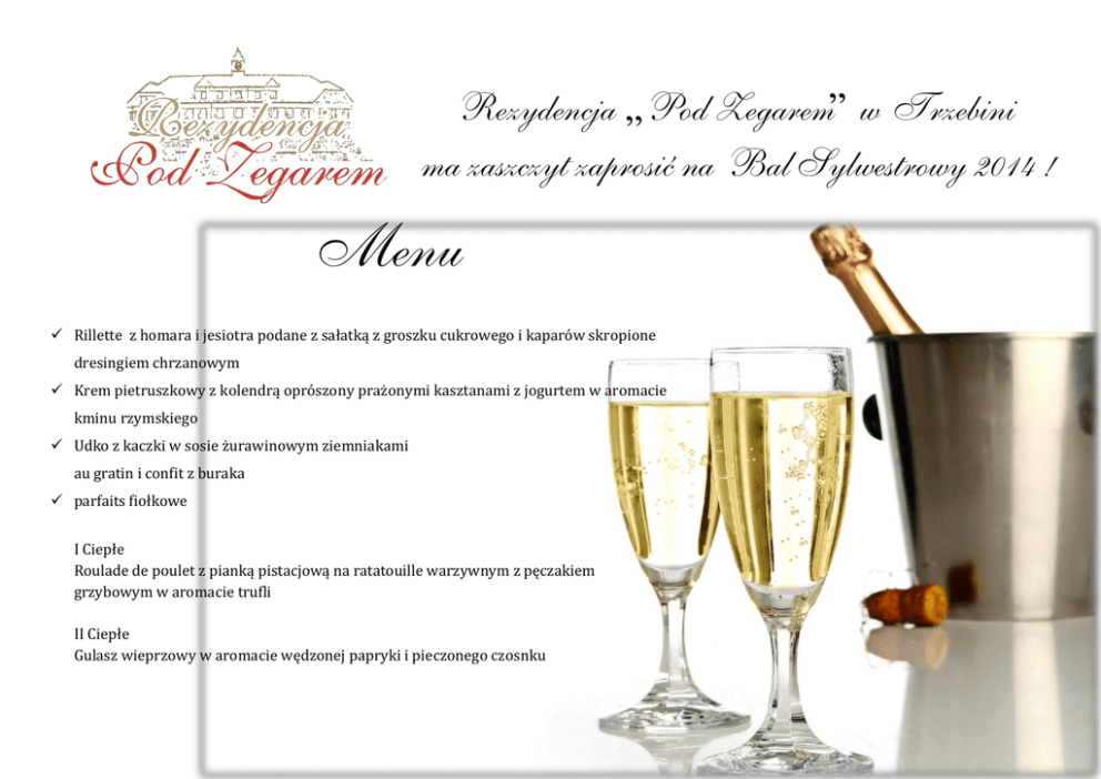 Rezydencja „Pod Zegarem” w Trzebini ma zaszczyt zaprosić na Bal Sylwestrowy 2014 ! Menu Rillette z homara i jesiotra podane z sałatką z groszku cukrowego i kaparów skropione dresingiem chrzanowym Krem pietruszkowy z kolendrą oprószony prażonymi kasztanami z jogurtem w aromacie kminu rzymskiego Udko z kaczki w sosie żurawinowym ziemniakami au gratin i confit z buraka parfaits fiołkowe I Ciepłe Roulade de poulet z pianką pistacjową na ratatouille warzywnym z pęczakiem grzybowym w aromacie trufli II Ciepłe Gulasz wieprzowy w aromacie wędzonej papryki i pieczonego czosnku Bufet słodki Bufet finger food Sałatka ogrodowa Sałatka polska Sałatka z wędzonym kurczakiem i winogronami quiche lorraine i au fromage tymbaliki drobiowe i wieprzowe karczek w czosnku i świeżych ziołach Indyk pieczony w papryce szynka wieprzowa w liściach laurowych boczek pieczony w gorczycy i miodzie Wybór serów francuskich z orzechami w miodzie i owocami śledzie w śmietanie, musztardzie i warzywach wybór wędlin i kiełbas polskich teryna z łososia i halibuta z galaretką Margarita pasztet z grzybami i orzechem włoskim ryby wędzone z kawiorem i bezą w aromacie martini sałatka z krewetek, mango i avocado sandacz z pianką chrzanowo-limonkową pikle sos chrzanowy, czosnkowy, cumberland i tysiąca wysp Owoce Babeczki malinowe, pomarańczowe z likierem cointrau, czekoladowa z likierem kahlua Biszkopt z musem z owoców lasu Mini bezy z musem advocaat Mini ptysie z nadzieniem waniliowym