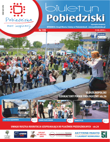 ISSN 1427-2792 L IULETYN Pobiedziski egzemplarz bezpłatny WYDAWCA: Urząd Miasta i Gminy w Pobiedziskach www.pobiedziska.pl Nr 195 11.06.2014 r. http://www.facebook.com/GminaPobiedziska VI OGÓLNOPOLSKI EDUKACYJNY PIKNIK EKOLOGICZNY str.26 STOP DLA CIĘŻARÓWEK str. 23 NOWE PLACE ZABAW str. 6 INWESTYCJE UWAGA! RUSZYŁA REKRUTACJA UZUPEŁNIAJĄCA DO PLACÓWEK PRZEDSZKOLNYCH - str.24 GRUNT NA MEDAL 2008 str. 5 INFORMACJE UMiG www.pobiedziska.pl Sprawozdanie Burmistrza Miasta i Gminy Pobiedziska w okresie od 24.04.2014 r. do 29.05.2014 r. Realizowane są umowy związane z : . .. . przebudową ulicy Gajowej w Pobiedziskach wraz z budową kanalizacji deszczowej, remontem świetlicy wiejskiej w Stęszewku, budową placów zabaw na terenie gminy Pobiedziska w m. Kołata, bieżącym utrzymaniem dróg. Zakończono prace związane z : . . przebudowa ul.Gajowej w Pobiedziskach budową kanalizacji odprowadzającej wody deszczowe z ul. Poznańskiej w Pobiedziskach, budową placów zabaw na terenie gminy Pobiedziska w m. Kociałkowa Górka, Tuczno oraz Gorzkie Pole. Przygotowywane są przetargi na: . rozbudowę Ośrodka Zdrowia przy ul.Jagiełły w Pobiedziskach - etap I fundamenty, remont świetlicy w Stęszewku Ogłoszono postępowania przetargowe na: . . . zakup materiałów budowlanych na cele remontu świetlicy wiejskiej w Stęszewku, świadczenie usług w zakresie przewozu dzieci niepełnosprawnych do szkół na terenie MiG Pobiedziska w roku szkolnym 2014/2015, świadczenie usług przewozu dzieci do placówek oświatowych na terenie MiG Pobiedziska w roku szkolnym 2014/2015 w formie zakupu biletów miesięcznych w przewozach regularnych, zaprojektowanie i wykonanie remontu pomieszczeń świetlicy wiejskiej w Stęszewku, gm Pobiedziska. . budowa placów zabaw w m. Kołata Trwają prace komisji dotyczące postępowania przetargowego na: . . zawarcie umowy ramowej na modernizację dróg na terenie Gminy Pobiedziska, zaprojektowanie i wykonanie remontu pomieszczeń świetlicy wiejskiej w Stęszewku, gm. Pobiedziska. bieżące utrzymanie dróg Rozstrzygnięto postępowania przetargowe na: . 2 budowę oświetlenia ulicznego w m. Biskupice ul. Żytnia, Zbożowa, Owsiana, Dożynkowa, Jęczmienna, Pszeniczna, Ziemniaczana. budowa kanalizacji - ul.Poznańska nr 195 * CZERWIEC 2014 INFORMACJE UMiG www.pobiedziska.pl Ponadto: . . . . . . . . .. . . . . . . odbyło się spotkanie z Sołtysami, podczas którego przedstawiono im aktualne informacje na temat wdrożenia programów współfinansowanych ze środków Unii Europejskiej oraz omówiono bieżące problemy sołectw, udzielano pomocy rolnikom w wypełnianiu wniosków o przyznanie płatności w ramach systemów wsparcia bezpośredniego, pomocy finansowej z tytułu wspierania gospodarowania na obszarach o niekorzystnych warunkach gospodarowania, udzielana jest pomoc rolnikom w wypełnianiu wniosków o przyznanie dopłaty z tytułu zużytego do siewu lub sadzenia materiału siewnego, z okazji uchwalenia Konstytucji 3 Maja w Kościele Farnym odprawiona została Msza św. w intencji Ojczyzny, po której pod pomnikami na rynku złożono kwiaty, Komisja Gminna konkursu p.n. "Najpiękniejsza zagroda Najpiękniejsza posesja" dokonała pierwszej lustracji zgłoszonych do Konkursu zagród i posesji, uczestniczono w pożegnaniu absolwentów Liceum Ogólnokształcącego przy Zespole Szkół w Pobiedziskach Letnisku, w Węglewie uczestniczono w spotkaniu na "Szlaku Kościołów Drewnianych" wokół Puszczy Zielonka, podczas którego w ramach "Nocy Kościołów Drewnianych" odbył się koncert Moniki Kuszyńskiej, 20 - lecie istnienia obchodziło Stowarzyszenie Dzieci i Młodzieży Niepełnosprawnej. Z tej okazji dla podopiecznych ufundowano sprzęt rehabilitacyjny, współorganizowano rajd turystyczny "Puszcza Wpuszcza", z okazji Dnia Bibliotekarza złożono życzenia pracownikom bibliotek - biblioteki głównej, oddziału dla dzieci oraz filii w Biskupicach, Letnisku i Pomarzanowicach, wzięto udział w uroczystym otwarciu placu zabaw w Borowo Młynie i jubileuszu 10 - lecia istnienia Sołectwa, uczestniczono w zebraniu sprawozdawczo - wyborczym Poznańskiej Lokalnej Organizacji Turystycznej, odbyło się posiedzenie Zarządu Związku Międzygminnego "Gospodarka Odpadami Aglomeracji Poznańskiej” z inicjatywy burmistrza w UMIG odbyło się spotkanie gmin członkowskich Związku Międzygminnego "Gospodarka Odpadami Aglomeracji Poznańskiej", mające na celu omówienie bieżących spraw i przyszłości związanej z gospodarowaniem odpadami komunalnymi, p o d c z a s p o s i e d ze n i a Z g ro m a d ze n i a Zw i ą z ku Międzygminnego "Gospodarka Odpadami Aglomeracji Poznańskiej"przedstawione zostało sprawozdanie z bieżącej działalności Związku oraz podjęto uchwały w sprawie wieloletniej prognozy finansowej Związku Międzygminnego "Gospodarka Odpadami Aglomeracji Poznańskiej" na lata 2014-2041, a także w sprawie zmiany uchwały dotyczącej uchwalenia budżetu Związku Międzygminnego "Gospodarka Odpadami Aglomeracji Poznańskiej" na 2014 r. , Polska Spółka Gazownictwa sp. z o.o. poinformowała o zaawansowaniu prac związanych z budową gazociągu obchody uchwalenia Konstytucji 3 Maja budowa placów zabaw „Noc Kościołów Drewnianych” 20-lecie istnienia Stowarzyszenia Dzieci i Młodzieży Niepełnosprawnej rajd turystyczny „Puszcza Wpuszcza” nr 195 * CZERWIEC 2014 3 INFORMACJE UMiG . . . www.pobiedziska.pl w miejscowościach Tuczno, Stęszewko, Stęszewice, Bednary, Wronczynek, Wronczyn, Złotniczki, Narożno, zorganizowano VI Ogólnopolski Edukacyjny Piknik Ekologiczny Pobiedziska 2014, który odbył na terenie kompleksu sportowo - edukacyjnego przy Zespole Szkół w Pobiedziskach , w Sali Ziemi Międzynarodowych Targów Poznańskich uczestniczono w gali podsumowującej wdrażanie WRPO zorganizowanej przez marszałka województwa wielkopolskiego, n a M i ę d z y n a ro d ow y m Fe s t i wa l u Fi l m ów Artystycznych i Turystycznych w Wa