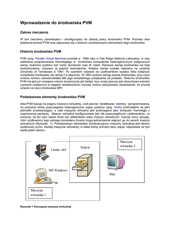 Wprowadzenie do środowiska PVM Zakres ćwiczenia W tym ćwiczeniu zainstalujesz i skonfigurujesz do dalszej pracy środowisko PVM. Poznasz dwa polecenia konsoli PVM oraz zapoznasz się z historią i podstawowymi elementami tego środowiska. Historia środowiska PVM PVM (ang. Parallel Virtual Machine) powstał w 1989 roku w Oak Ridge National Laboratory, w celu ułatwienia programowania równoległego w środowisku komputerów heterogenicznych połączonych siecią. Autorami systemu byli Vaidy Sunderam oraz Al. Geist. Pierwsza wersja środowiska nie była dystrybuowana, używano ją jedynie wewnętrznie. Kolejna wersja została napisana na uczelnie University of Tennessee w 1991. Po szerokim odzewie od użytkowników wydano kilka kolejnych modyfikacji środowisko (do wersji 2.4 włącznie). W 1993 wydano wersję trzecią środowiska, przy czym zmiana numeru odzwierciedlała fakt jego kompletnego przepisania od podstaw. Obecnie środowisko PVM nie jest już rozwijane równie dynamicznie jak kiedyś, lecz wciąż jeszcze jest stosunkowo szeroko używane (zwłaszcza w kręgach akademickich) chociaż można zaryzykować stwierdzenie, że prymat utraciło na rzecz środowiska MPI. Podstawowe elementy środowiska PVM Idea PVM bazuje na pojęciu maszyny wirtualnej, czyli pewnej dodatkowej warstwy oprogramowania, na poziomie której poszczególne heterogeniczne węzły systemu (ang. hosts) postrzegane są jako jednostki przetwarzające, a cała maszyna wirtualna jest postrzegana jako komputer równoległy z rozproszoną pamięcią. Maszyn wirtualna konfigurowana jest dla poszczególnych użytkowników, co oznacza, że ten sam węzeł może być składnikiem wielu maszyn wirtualnych. Inaczej rzecz ujmując, różni użytkownicy tego samego komputera (hosta) mogą jednocześnie włączyć go do swoich maszyn wirtualnych (Rysunek 1). Podstawowym elementem konstrukcyjnym maszyny wirtualnej jest demon systemowy pvmd. Każdej maszynie wirtualnej, w skład której wchodzi dany węzeł, odpowiada na tym węźle jeden demon. Linuks x64 Maszyna wirtualna 2 Solaris MS Windows Mac Maszyna wirtualna 1 Rysunek 1 Koncepcja maszyny wirtualnej Przetwarzanie w środowisku PVM polega na wykonywaniu programów tworzących aplikację równoległą na poszczególnych węzłach maszyny wirtualnej. Na poziomie maszyny wirtualnej elementarną jednostką reprezentującą wykonywany program jest zadanie (ang. task). Każde zadanie jest też procesem w lokalnym systemie operacyjnym węzła, a jego praca jako zadania PVM jest kontrolowana przez lokalny demon w tym węźle. Ponieważ lokalny demon również jest zadaniem PVM, zadania realizujące program aplikacji będą nazywane zadaniami użytkowymi. Podstawową funkcją środowiska PVM jest ułatwianie uruchamiania zadań na poszczególnych węzłach maszyny wirtualnej oraz dostarczanie mechanizmów do komunikacji, synchronizacji i identyfikacji tych zadań niezależnie od ich fizycznej lokalizacji na poszczególnych węzłach. Ponadto, PVM umożliwia dynamiczną zmianę konfiguracji maszyny wirtualnej oraz udostępnia mechanizm dynamicznych grup procesów, ułatwiających implementację algorytmów równoległych. Skorzystanie z funkcjonalności PVM wymaga użycia w programach zadań funkcji PVM, których implementacja jest dołączana na etapie konsolidacji w postaci biblioteki libpvm3.a i libgpvm3.a dla programów w języku C lub libfpvm3.a dla programów w języku Fortran Wybrane elementy konstrukcji środowiska PVM Większość decyzji projektowych podjętych przez twórców środowiska PVM wynikała z założenia, że powinno być ono dostępne na możliwie dużej liczbie platform sprzętowych i systemowych. Podstawowym systemem operacyjnym, na którym działał PVM był UNIX w niemal wszystkich jego odmianach. Z czasem pojawiły się realizacja na VMS oraz Microsoft Windows. Pewne rozwiązania przyjęto zatem z względu na popularność i szeroką dostępność wykorzystanych mechanizmów, często koszem efektywności. Kluczowym elementem w systemie rozproszonym jest komunikacja pomiędzy zadaniami, która wymaga z kolei mechanizmu jednoznacznej identyfikacji zadań oraz ich fizycznej lokalizacji w systemie. W PVM zadania identyfikowane są przez 32-bitową wartość liczbową, zwaną TID (ang. task identifier), nadawaną przez lokalny demon. Wartość tego identyfikatora składa się z czterech pól, zawierających odpowiednio: numer węzła, na którym działa zadanie, numer zadania na tym węźle, bit identyfikujący zadanie-demon i bit określający adres rozgłoszeniowy (ang. multicast address). Format identyfikator przedstawia Rysunek 2. 31 24 23 Numer węzła 1615 8 7 0 Lokalny numer zadania 1 = adres rozgłoszeniowy 1 = demon Rysunek 2 Identyfikator zadania W środowisku PVM w ogólności przyjmuje się, że zadania nie mają możliwości współdzielenia jakiegokolwiek obszaru pamięci, zatem kooperacja między nimi odbywa się tylko poprzez przekazywanie komunikatów (ang. message passing). Komunikat identyfikowany jest przez TID nadawcy i przez etykietę, tj. 16-bitową liczbę całkowitą. Model komunikacyjny przyjęty w PVM zakłada, że każde zadanie może wysyłać komunikaty do każdego innego, oraz że nie istnieją ograniczenia na rozmiar i ilość komunikatów. Jedynym ograniczeniem jest fizyczny rozmiar pamięci na poszczególnych węzłach maszyny wirtualnej. PVM zapewnia komunikację asynchroniczną, co oznacza, że po wysłaniu komunikatu zadanienadawca nie czeka, aż komunikat dotrze do odbiorcy, tylko natychmiast kontynuuje swoje przetwarzanie. Odpowiedzialność za przekazanie komunikatu przejmują odpowiednie demony. Maszyna wirtualna gwarantuje jedynie zachowanie lokalnego porządku (porządku FIFO), tzn. jeśli jedno zadanie wysyła dwa komunikatu do innego zadania, to komunikaty zostaną doręczone w kolejności, w jakiej zostały nadane. Adresatem komunikatu może być pojedynczy proces identyfikowany przez konkretny TID, może to by