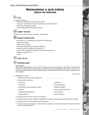 221 Oprac. Monika Malinowska-Wrona Macierzyństwo w życiu kobiety (zajęcia dla dziewcząt) CELE Po zajęciach uczennica: – akceptuje swoją płodność i dar jakim jest dziecko, – rozumie, iż macierzyństwo może być największym powołaniem kobiety, – zna problem niepłodności u kobiet, – rozumie wagę odpowiedzialnego rodzicielstwa. FORMY I METODY ŚRODKI DYDAKTYCZNE – kartki papieru A3 z niedokończonym zdaniem dla każdej grupy, – duże arkusze papieru, – mazaki, masa mocująca, – List kobiety spodziewającej się dziecka (załącznik 1), – fragmenty tekstów z pamiętników (załącznik 2), – dwa komplety rozsypanki (w kopertach; koszyczkach) (załącznik 3), – foliogramy (załączniki 4 i 5), – rzutnik. CZAS: 45 min. PRZEBIEG ZAJĘĆ 1. Wprowadzenie Wiele kobiet popełnia błędy w różnych okresach swego życia, a głównie dlatego, że nie wiedzą o wielu istotnych rzeczach i nie zdają sobie do końca sprawy z konsekwencji swego postępowania. Wiele można w swoim życiu zmienić dzięki pełnej świadomości swej kobiecej natury i powołania, jakie może nieść ze sobą to, że jesteśmy właśnie kobietami. (2 min.) 2. Niedokończone zdanie Pojawienie się dziecka w życiu kobiety jest ……………………………………………. Przypuszczalne odpowiedzi: – szczęściem, – powołaniem, – wyzwaniem, – utratą atrakcyjności, – zamknięciem drogi dla edukacji, kariery, – brakiem perspektyw, – tragedią, – owocem miłości małżonków, – najpiękniejszym przeżyciem, – darem od Boga, – macierzyństwem, – dużym przeżyciem. a) Nauczyciel dzieli uczennice na grupy trzyosobowe. b) Uczennice otrzymują arkusz papieru z niedokończonym zdaniem. Każda grupa wpisuje minimum 7 skojarzeń. c) Krótka prezentacja swoich określeń przez każdą grupę. d) Podział i wypisanie na osobnych, umieszczonych w widocznym miejscu dużych arkuszach papieru, określeń pozytywnych i negatywnych. WYGRAJMY MŁODOŚĆ – SCENARIUSZE ZAJĘĆ V. PRZEKAZYWANIE ŻYCIA I DZIAŁANIA PRZECIWKO ŻYCIU niedokończone zdanie, refleksja, rozsypanka, „burza odczuć” 222 Macierzyństwo w życiu kobiety... Oprac. Monika Malinowska-Wrona e) Wspólna analiza, większe skupienie się na skojarzeniach o negatywnym zabarwieniu (o ile się takie pojawią), zastanowienie się, czy w ogóle muszą się pojawić i w jakich sytuacjach to ma miejsce; podkreślenie przez nauczyciela roli świadomej decyzji pary małżonków o poczęciu dziecka i rodzicielstwie. f) Na zakończenie – jedna z uczennic odczytuje list kobiety spodziewającej się dziecka (załącznik 1). (15 min.) 3. Kartki z pamiętnika (załącznik 2) a) Trzy wybrane uczennice odczytują przygotowane przez nauczyciela fragmenty tekstów – wypowiedzi kobiet mających trudności z zajściem w ciążę. b) Po przeczytaniu – omówienie i podzielenie się własnymi refleksjami. V. PRZEKAZYWANIE ŻYCIA I DZIAŁANIA PRZECIWKO ŻYCIU (15 min.) 4. Rozsypanka Niepłodność (załącznik 3) a) Prowadzący dzieli uczennice na dwie grupy. Każda z grup dostaje rozsypankę (paski papieru z tekstem), z której mają powstać dwie kolumny. Pierwsza kolumna ma nagłówek Czynniki ryzyka niepłodności u kobiet, druga natomiast Co płodności pomaga? Dziewczęta układają karteczki pod odpowiednimi nagłówkami. b) Odczytanie, pytania uczennic, wyjaśnienia nauczyciela. (5 min.) 5. Podsumowanie. a) „Burza odczuć” nad treścią foliogramu (załącznik 4), wypowiedzi uczniów z uzasadnieniem. b) Nauczyciel prowadzi dyskusję do wniosku, że DZIECKO POWINNO BYĆ PRZYWITANE. Stwierdza, iż najlepiej jest, gdy dziecko jest chciane i przywitane. Umożliwia mu to szczęśliwy rozwój w okresie prenatalnym oraz „miękkie lądowanie” po urodzeniu. Jednakże zdarzają się takie sytuacje, iż dziecko jest niechciane (w sensie nie planowane), bądź jest inne niż sobie wymarzyliśmy (przeciwna płeć, wada rozwojowa) – dlatego tak ważne jest „przywitanie tego dziecka” i otoczenie miłością, miłością bezwarunkową. Odnieść to też można do problemu niepłodności i adopcji. Małżonkowie, którzy nie mogą być rodzicami na drodze swojej płodności, mogą „przywitać” dziecko poprzez adopcję. c) Sentencja na zakończenie zajęć (załącznik 5) (8 min.) Załącznik 4 – foliogram – Prawo dziecka do życia Dziecko powinno być chciane. Dziecko powinno być przywitane. Załącznik 5 – foliogram – Dar macierzyństwa Może dziś nie myślisz jeszcze o macierzyństwie, ale przyjdzie taki czas, że tego zapragniesz. Warto o tym pamiętać i żyć tak, by sobie nie szkodzić, aby w przyszłości cieszyć się z daru macierzyństwa, który może stać się największym powołaniem kobiety, Twoim powołaniem… WYGRAJMY MŁODOŚĆ – SCENARIUSZE ZAJĘĆ Oprac. Monika Malinowska-Wrona Macierzyństwo w życiu kobiety... 223 Załącznik 1 „Ptasie gniazdko” Laura (30 lat, dziennikarka z Warszawy) Załącznik 2 – Kartki z pamiętnika Kaśka, lat 23 (kosmetyczka) W drugiej klasie ogólniaka zaczęłam się odchudzać. Nie jadłam nic prócz wody przegotowanej (bo mineralna też tuczyła) i jednego jabłka dziennie. Wylądowałam w szpitalu. Anoreksja. Kroplówki, terapie... Gdy wróciłam do siebie, znowu nie akceptowałam swego ciała, po kryjomu zaczęłam wyrzucać jedzenie i prowadzić głodówkę. Przez trzy lata nie miałam okresu, a zaburzenia hormonalne trwają do dziś. Jestem znów gruba, ale to mi nie przeszkadza, to jest nieistotne. Zrozumiałam, jaka byłam głupia. Od roku jestem mężatką, a Bartek akceptuje mnie taką, jaką jestem. Jednak nie wiem, co dalej z nami będzie, tak bardzo chcemy mieć dziecko, ale nie wiem, czy to będzie możliwe… Zniszczyłam swój organizm, zniszczyłam sobie życie, tyle bym dała, by być znowu zdrową, płodną kobietą. Andżelika, lat 39 (menedżer ds. marketingu) Od czterech lat staramy się z mężem o dziecko. Bezskutecznie. Na