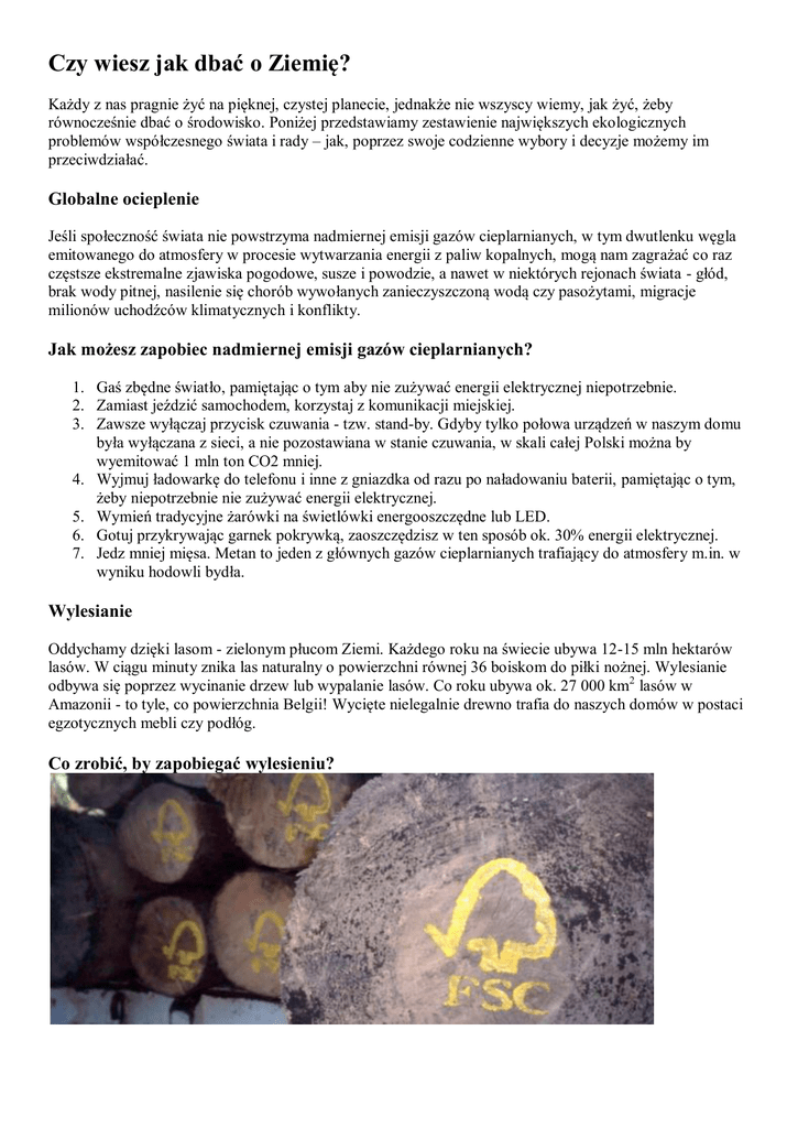 Czy wiesz jak dbać o Ziemię? Każdy z nas pragnie żyć na pięknej, czystej planecie, jednakże nie wszyscy wiemy, jak żyć, żeby równocześnie dbać o środowisko. Poniżej przedstawiamy zestawienie największych ekologicznych problemów współczesnego świata i rady – jak, poprzez swoje codzienne wybory i decyzje możemy im przeciwdziałać. Globalne ocieplenie Jeśli społeczność świata nie powstrzyma nadmiernej emisji gazów cieplarnianych, w tym dwutlenku węgla emitowanego do atmosfery w procesie wytwarzania energii z paliw kopalnych, mogą nam zagrażać co raz częstsze ekstremalne zjawiska pogodowe, susze i powodzie, a nawet w niektórych rejonach świata - głód, brak wody pitnej, nasilenie się chorób wywołanych zanieczyszczoną wodą czy pasożytami, migracje milionów uchodźców klimatycznych i konflikty. Jak możesz zapobiec nadmiernej emisji gazów cieplarnianych? 1. Gaś zbędne światło, pamiętając o tym aby nie zużywać energii elektrycznej niepotrzebnie. 2. Zamiast jeździć samochodem, korzystaj z komunikacji miejskiej. 3. Zawsze wyłączaj przycisk czuwania - tzw. stand-by. Gdyby tylko połowa urządzeń w naszym domu była wyłączana z sieci, a nie pozostawiana w stanie czuwania, w skali całej Polski można by wyemitować 1 mln ton CO2 mniej. 4. Wyjmuj ładowarkę do telefonu i inne z gniazdka od razu po naładowaniu baterii, pamiętając o tym, żeby niepotrzebnie nie zużywać energii elektrycznej. 5. Wymień tradycyjne żarówki na świetlówki energooszczędne lub LED. 6. Gotuj przykrywając garnek pokrywką, zaoszczędzisz w ten sposób ok. 30% energii elektrycznej. 7. Jedz mniej mięsa. Metan to jeden z głównych gazów cieplarnianych trafiający do atmosfery m.in. w wyniku hodowli bydła. Wylesianie Oddychamy dzięki lasom - zielonym płucom Ziemi. Każdego roku na świecie ubywa 12-15 mln hektarów lasów. W ciągu minuty znika las naturalny o powierzchni równej 36 boiskom do piłki nożnej. Wylesianie odbywa się poprzez wycinanie drzew lub wypalanie lasów. Co roku ubywa ok. 27 000 km2 lasów w Amazonii - to tyle, co powierzchnia Belgii! Wycięte nielegalnie drewno trafia do naszych domów w postaci egzotycznych mebli czy podłóg. Co zrobić, by zapobiegać wylesieniu? 1. Drukuj dwustronnie. Ustaw drukowanie domyślne w drukarce na dwustronne. Zużyjesz dzięki temu 50% mniej papieru. 2. Czytaj e-wydania gazet i magazynów. Ogranicz kupowanie prasy drukowanej na białym, błyszczącym papierze. 3. Drukuj i kseruj tylko absolutnie niezbędne dokumenty. 4. Pytaj sprzedawców o drewniane produkty z certyfikatem gwarantującym, że drewno pochodzi z legalnej wycinki prowadzonej w sposób zrównoważony. 5. Segreguj makulaturę, pamiętając, że powinien to być niezabrudzony papier. Obliczono, że ponowny przerób sterty makulatury np. gazet o wysokości 1,25 metra pozwala na uratowanie 6-metrowej sosny. 6. Kupuj papier toaletowy, chusteczki higieniczne i ręczniki papierowe oraz artykuły papiernicze (np. zeszyty) wykonane z papieru z makulatury. Nadmierna ilość odpadów Foliowa torebka służy nam przeciętnie 12 minut - tyle trwa średnio droga ze sklepu do domu. Potem torebka ląduje w koszu. Wiele wyrzucanych codziennie na świecie foliówek trafia do oceanów. Żółwie morskie mylą je z meduzami, połykają i giną w męczarniach. Problem ten dotyczy również wielu innych gatunków. Według ONZ co roku przez śmieci w oceanach ginie około 1 miliona morskich zwierząt. Od naszych codziennych decyzji zależy także ich los. Jak walczyć z nadmierną ilością odpadów? 1. Na zakupy zabieraj torbę wielokrotnego użytku. Nie używaj jednorazowych torebek foliowych. Mieszkaniec UE zużywa średnio aż 500 foliówek! 2. Kupuj produkty opakowane w papier z makulatury (np. maliny w tekturowych pojemnikach zamiast w plastiku). 3. Wybieraj produkty w opakowaniach szklanych zamiast plastikowych. 4. Używaj produktów wielorazowego użytku. Nie kupuj ani nie korzystaj z jednorazowych kubków, sztućców, ani też nie kupuj produktów słabej jakości, które zaraz będzie trzeba zastąpić nowymi. 5. Reperuj przedmioty zamiast kupować nowe. 6. Segreguj wszystkie surowce wtórne, pamiętając że nie wszystkie odpady nadają się do ponownego przetworzenia. Zagrożone gatunki Co czwarty gatunek ssaków, co ósmy ptaków i aż co trzeci płazów może wkrótce zniknąć z powierzchni Ziemi. Nielegalny handel zagrożonymi gatunkami zwierząt to druga, po utracie siedlisk, przyczyna ich wymierania. Polscy celnicy zatrzymują co roku tysiące okazów chronionej fauny i flory. Popyt na egzotyczne pamiątki sprawia, że dzikie zwierzęta są wyłapywane i zabijane. Co możesz zrobić, by ratować zagrożone gatunki? 1. Zawsze sprawdzaj czy egzotyczne zwierzę, które chcesz kupić nie jest gatunkiem objętym Konwencją Waszyngtońską (CITES), a jeśli tak to czy ma dowód legalnego pochodzenia. 2. Nie kupuj ani nie zbieraj z plaży czy z rafy koralowców. 3. Nie kupuj ubrań i biżuterii wykonanych z elementów zwierząt jeśli znajdują się one na liście CITES. Gdy nie masz pewności, z jakiego gatunku jest dana torebka czy portfel, zrezygnuj z jego zakupu. 4. Nie kupuj medykamentów wykonanych z zagrożonych gatunków zwierząt i roślin. 5. Nie kupuj kawioru, co do którego nie masz przekonania, że jest z legalnego źródła. 6. Nie kupuj kosmetyków wykonanych z zagrożonych gatunków zwierząt i roślin. Brak wodyMyjąc zęby czy podlewając trawnik rzadko myślimy o tym, że woda pitna jest cennym surowcem. Tymczasem w XXI wieku jej deficyt może być najpoważniejszym problemem świata. Zasoby bezpiecznej do picia wody kurczą się błyskawicznie, podczas gdy na Ziemi jest coraz więcej ludzi, którzy mają coraz większe potrzeby. Jak walczyć z globalnym deficytem wody? 1. Zadbaj o szczelność kranów i spłuczek. Kran cieknący z prędkością 45 kropel na minutę marnuje nawet 1.000 litrów wody miesięcznie. 2. Wybierz ką