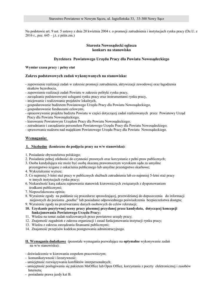 Starostwo Powiatowe w Nowym Sączu, ul. Jagiellońska 33, 33-300 Nowy Sącz Na podstawie art. 9 ust. 5 ustawy z dnia 20 kwietnia 2004 r. o promocji zatrudnienia i instytucjach rynku pracy (Dz.U. z 2016 r., poz. 645 – j.t. z późn.zm.) Starosta Nowosądecki ogłasza konkurs na stanowisko Dyrektora Powiatowego Urzędu Pracy dla Powiatu Nowosądeckiego Wymiar czasu pracy : pełny etat Zakres podstawowych zadań wykonywanych na stanowisku: - zapewnienie realizacji zadań w zakresie promocji zatrudnienia, aktywizacji zawodowej oraz łagodzenia skutków bezrobocia, - zapewnienie realizacji zadań Powiatu w zakresie polityki rynku pracy, - zarządzanie podstawowymi usługami rynku pracy oraz instrumentami rynku pracy, - inicjowanie i realizowanie projektów lokalnych, - gospodarowanie budżetem Powiatowego Urzędu Pracy dla Powiatu Nowosądeckiego, - gospodarowanie funduszami celowymi, - opracowywanie projektu budżetu Powiatu w części dotyczącej zadań realizowanych przez Powiatowy Urząd Pracy dla Powiatu Nowosądeckiego, - kierowanie Powiatowym Urzędem Pracy dla Powiatu Nowosądeckiego; - zatrudnianie i zarządzanie personelem Powiatowego Urzędu Pracy dla Powiatu Nowosądeckiego; - sprawowanie nadzoru nad majątkiem Powiatowego Urzędu Pracy dla Powiatu Nowosądeckiego. Wymagania: I. Niezbędne (konieczne do podjęcia pracy na w/w stanowisku): 1. Posiadanie obywatelstwa polskiego; 2. Posiadanie pełnej zdolności do czynności prawnych oraz korzystanie z pełni praw publicznych; 3. Osoba kandydująca nie może być osobą skazaną prawomocnym wyrokiem sądu za umyślne przestępstwo ścigane z oskarżenia publicznego lub umyślne przestępstwo skarbowe; 4. Wykształcenie wyższe; 5. Co najmniej 3-letni staż pracy w publicznych służbach zatrudnienia lub co najmniej 5-letni staż pracy w innych instytucjach rynku pracy; 6. Niekaralność karą zakazu zajmowania stanowisk kierowniczych związanych z dysponowaniem środkami publicznymi; 7. Nieposzlakowana opinia; 8. Wyrażenie zgody na poddanie się procedurze sprawdzającej, przewidzianej do dopuszczenia do informacji niejawnych do poziomu „poufne” lub posiadanie odpowiedniego poświadczenia bezpieczeństwa dostępu; 9. Wyrażenie zgody na przetwarzanie danych osobowych do celów rekrutacji; 10. Uzyskanie pozytywnej oceny pracy pisemnej przysłanej przez kandydata, dotyczącej koncepcji funkcjonowania Powiatowego Urzędu Pracy; 11. Wiedza na temat zadań realizowanych przez powiatowe urzędy pracy; 12. Znajomość zagadnień z zakresu organizacji i zasad funkcjonowania instytucji rynku pracy; 13. Wiedza z zakresu zarządzania finansami publicznymi; 14. Znajomość przepisów kodeksu postępowania administracyjnego. II. Wymagania dodatkowe (pozostałe wymagania pozwalające na optymalne wykonywanie zadań na w/w stanowisku): - doświadczenie w kierowaniu zespołem pracowniczym; - komunikatywność i kreatywność; - umiejętność rozwiązywania konfliktów interpersonalnych; - umiejętność posługiwania się pakietem MsOffice lub Open Office, korzystania z poczty elektronicznej i zasobów Internetu; - posiadanie prawa jazdy kat B. Warunki pracy i płacy: 1. Wymiar czasu pracy: pełny ustawowy wymiar czasu pracy (pełny etat); 2. Miejsce pracy: teren Powiatu Nowosądeckiego. 3. W przypadku osób podejmujących po raz pierwszy (w rozumieniu ustawy z dnia 21 listopada 2008 r. o pracownikach samorządowych) pracę na stanowisku urzędniczym, umowę o pracę zawiera się na czas określony, nie dłuższy niż 6 miesięcy. W czasie trwania tej umowy organizowana jest dla pracownika służba przygotowawcza trwająca nie dłużej niż 3 miesiące i kończąca się egzaminem. Pozytywny wynik egzaminu kończącego służbę przygotowawczą jest warunkiem niezbędnym dalszego zatrudnienia pracownika; 4. Wynagrodzenie ustalane jest na podstawie przepisów ustawy z dnia 21 listopada 2008 r. o pracownikach samorządowych Dz.U. z 2014 r., poz.1202 - j.t. z późn.zm.), kształtowane wg zasad przyjętych w Uchwale Nr 18/2010 Zarządu Powiatu Nowosądeckiego z dnia 16 grudnia 2010 r. w sprawie wymagań kwalifikacyjnych, ustalania wynagrodzenia miesięcznego oraz przyznawania nagród dla dyrektorów i kierowników niektórych powiatowych jednostek organizacyjnych oraz w Zarządzeniu Nr 57/2010 Starosty Nowosądeckiego z dnia 14 grudnia 2010 r. ( z późn.zm.) w sprawie maksymalnego miesięcznego wynagrodzenia dyrektorów i kierowników oraz zastępców dyrektorów i kierowników niektórych powiatowych jednostek organizacyjnych. 5. Warunki techniczne: stanowisko zorganizowane jest na I piętrze, w pomieszczeniu biurowym, wyposażone w komputer z monitorem ekranowym. Pomieszczenia zlokalizowane powyżej parteru nie są dostępne dla osób poruszających się na wózkach inwalidzkich. Osoby ubiegające się o stanowisko Dyrektora Powiatowego Urzędu Pracy dla Powiatu Nowosądeckiego proszone są o przedłożenie pracy pisemnej dotyczącej koncepcji funkcjonowania tego Urzędu, uwzględniającej działania w zakresie promocji zatrudnienia i aktywizacji lokalnego rynku pracy oraz propozycje wykorzystania środków z funduszy strukturalnych Unii Europejskiej, ze szczególnym uwzględnieniem Europejskiego Funduszu Społecznego. Wymagane dokumenty i oświadczenia: - Kwestionariusz osobowy (wzór proszę pobrać z Biuletynu Informacji Publicznej Starostwa, www.starostwo.nowy-sacz.pl, wzór zamieszczony został w zakładce „Praca w Starostwie – Wprowadzenie); Oświadczenie o posiadaniu pełnej zdolności do czynności prawnych; Oświadczenie o korzystaniu z pełni praw publicznych; Oświadczenie, że osoba ubiegająca się o zatrudnienie „ nie była skazana prawomocnym wyrokiem sądu za umyślne przestępstwo ścigane z oskarżenia publicznego lub umyślne przestępstwo skarbowe”. Złożenie oświadczenia o treści innej niż powyższa, wynikająca z wymagań ustawy z dnia 21 listopada 2008 r. o pracownikach samorządowych, będzie przyczyną odr
