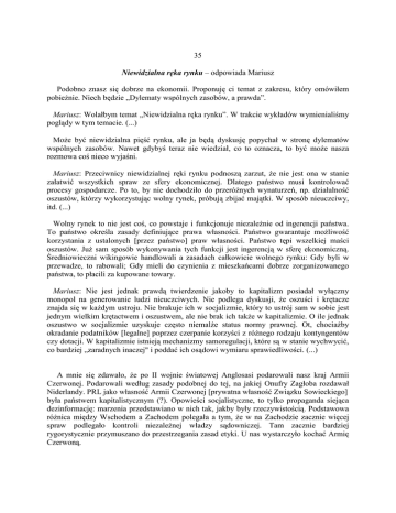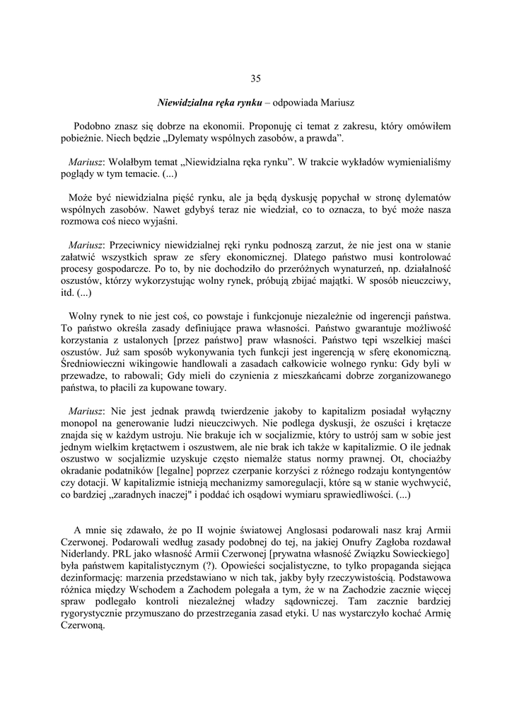 35 Niewidzialna ręka rynku – odpowiada Mariusz Podobno znasz się dobrze na ekonomii. Proponuję ci temat z zakresu, który omówiłem pobieŜnie. Niech będzie „Dylematy wspólnych zasobów, a prawda”. Mariusz: Wolałbym temat „Niewidzialna ręka rynku”. W trakcie wykładów wymienialiśmy poglądy w tym temacie. (...) MoŜe być niewidzialna pięść rynku, ale ja będą dyskusję popychał w stronę dylematów wspólnych zasobów. Nawet gdybyś teraz nie wiedział, co to oznacza, to być moŜe nasza rozmowa coś nieco wyjaśni. Mariusz: Przeciwnicy niewidzialnej ręki rynku podnoszą zarzut, Ŝe nie jest ona w stanie załatwić wszystkich spraw ze sfery ekonomicznej. Dlatego państwo musi kontrolować procesy gospodarcze. Po to, by nie dochodziło do przeróŜnych wynaturzeń, np. działalność oszustów, którzy wykorzystując wolny rynek, próbują zbijać majątki. W sposób nieuczciwy, itd. (...) Wolny rynek to nie jest coś, co powstaje i funkcjonuje niezaleŜnie od ingerencji państwa. To państwo określa zasady definiujące prawa własności. Państwo gwarantuje moŜliwość korzystania z ustalonych [przez państwo] praw własności. Państwo tępi wszelkiej maści oszustów. JuŜ sam sposób wykonywania tych funkcji jest ingerencją w sferę ekonomiczną. Średniowieczni wikingowie handlowali a zasadach całkowicie wolnego rynku: Gdy byli w przewadze, to rabowali; Gdy mieli do czynienia z mieszkańcami dobrze zorganizowanego państwa, to płacili za kupowane towary. Mariusz: Nie jest jednak prawdą twierdzenie jakoby to kapitalizm posiadał wyłączny monopol na generowanie ludzi nieuczciwych. Nie podlega dyskusji, Ŝe oszuści i krętacze znajda się w kaŜdym ustroju. Nie brakuje ich w socjalizmie, który to ustrój sam w sobie jest jednym wielkim krętactwem i oszustwem, ale nie brak ich takŜe w kapitalizmie. O ile jednak oszustwo w socjalizmie uzyskuje często niemalŜe status normy prawnej. Ot, chociaŜby okradanie podatników [legalne] poprzez czerpanie korzyści z róŜnego rodzaju kontyngentów czy dotacji. W kapitalizmie istnieją mechanizmy samoregulacji, które są w stanie wychwycić, co bardziej „zaradnych inaczej" i poddać ich osądowi wymiaru sprawiedliwości. (...) A mnie się zdawało, Ŝe po II wojnie światowej Anglosasi podarowali nasz kraj Armii Czerwonej. Podarowali według zasady podobnej do tej, na jakiej Onufry Zagłoba rozdawał Niderlandy. PRL jako własność Armii Czerwonej [prywatna własność Związku Sowieckiego] była państwem kapitalistycznym (?). Opowieści socjalistyczne, to tylko propaganda siejąca dezinformację: marzenia przedstawiano w nich tak, jakby były rzeczywistością. Podstawowa róŜnica między Wschodem a Zachodem polegała a tym, Ŝe w na Zachodzie zacznie więcej spraw podlegało kontroli niezaleŜnej władzy sądowniczej. Tam zacznie bardziej rygorystycznie przymuszano do przestrzegania zasad etyki. U nas wystarczyło kochać Armię Czerwoną. Mariusz: PrzecieŜ ja powiedziałem, Ŝe na Zachodzie mieli mechanizmy samoregulacji.(...) Przyjmijmy, Ŝe niewidzialna ręka rynku, to realnie istniejące i funkcjonujące mechanizmy konkurencji. Przy tym załoŜeniu słowo niewidzialna wprowadza denerwującą dysharmonię. Są tacy, co kpią ze skuteczności czegoś, czego nie moŜna dotknąć lub zobaczyć. Mariusz: Ustrój, w którym obecnie Ŝyjemy moŜna by określić jako mieszaninę róŜnych wpływów. Coś pomiędzy socjalizmem a kapitalizmem. (...) Ale mnie jest do śmiechu z tego, Ŝe róŜnice między tymi ustrojami traktujesz powaŜnie. Jakoś brak mi wiary w to, Ŝe były to rzeczywiste róŜnice. Znam wielu podróŜników, którzy po powrocie do Kraju szczerze mówili, Ŝe socjalizm [mieli na myśli to, co socjaliści obiecywali] jest np. w Ameryce, Australii lub Kanadzie. Zaś u nas jest swoboda i dziki kapitalizm. Mariusz: I choć zbyt długie trwanie w takim rozkroku siłą rzeczy zaprowadzić musi nasz kraj na manowce socjalizmu, to jednak [póki, co] mechanizmy samoregulacji gdzie niegdzie jeszcze funkcjonują. Dostarczają one dowodów na to, Ŝe niewidzialna ręka rynku czuwa i Ŝe daje ona o sobie znać. Wbrew temu, co twierdza etatystyczni malkontenci. (...) Język w jakim wypowiadasz swoją opinię jest jakiś drwętny. Nie ma sposobu na wypracowanie oceny tego jak twoja opinia odnosi się do rzeczywistości. UŜywasz języka propagandystów. Języka, który posługiwał się prymitywnymi trikami niezbędnymi w uzasadnianiu rywalizacji między Wschodem a Zachodem. Co nasze, to jest dobre. Co przeciwka, to złe. Nie moŜesz pozostawać z boku, bo to oznacza, Ŝe pomagasz przeciwnikowi. Jakiś przykład by się przydał. Mariusz: OtóŜ pisano jakiś czas temu o wykryciu przez policję osób zajmujących się pewnym procederem. Sprawę określono jako „afera proszkowa". „Przedsiębiorcy" postanowili dorobić się wsypując do opakowań po znanym zagranicznym proszku do prania produkty gorszej jakości. Interesującym wydaje mi się wątek, w jaki sposób sprawa wyszła na jaw. Dzięki czemu dopatrzono się oszustwa. Firma, która zajmowała się nieuczciwym procederem posiadała [od renomowanego producenta proszku do prania] licencje na jego pakowanie oraz dystrybucje. Jak juŜ wspomniałem, w oryginalne opakowania wsypywano jakiś chłam. To trwało wiele miesięcy. Na trop szajki policja wpadła dzięki, donosowi od polskiemu przedstawicielowi producenta proszku. Z raportów na temat sprzedaŜy towaru w poszczególnych regionach polski zaczęło wynikać, Ŝe w niektórych regionach proszek sprzedaje się coraz gorzej. Przedstawiciel firmy postanowił dociec przyczyny takiego stanu rzeczy. (...) AleŜ, to jest przykład na właściwą ingerencję państwa w sprawy gospodarcze. Mariusz: Z punktu widzenia niniejszej analizy, jest w całej tej sprawie coś waŜniejszego. Po prostu, w wyŜej opisanym przypadku, zadziałała niewidzialna ręka rynku. To, Ŝe konsumenci zaniechali kupowania p