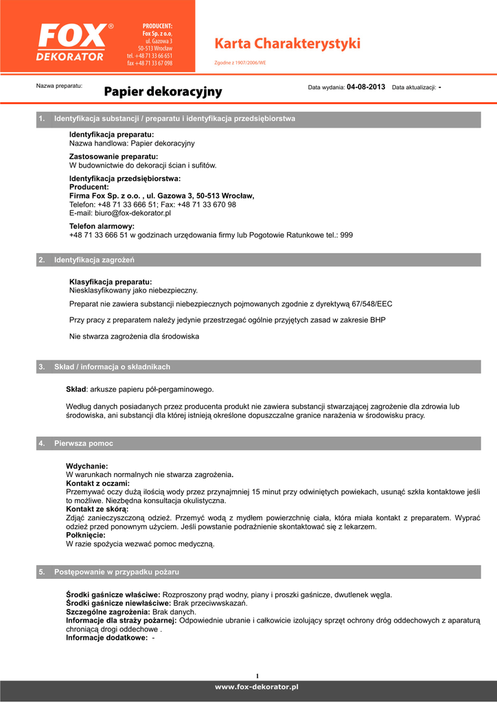 Nazwa preparatu: 1. Papier dekoracyjny Data wydania: 04-08-2013 Data aktualizacji: - Identyfikacja substancji / preparatu i identyfikacja przedsiębiorstwa Identyfikacja preparatu: Nazwa handlowa: Papier dekoracyjny Zastosowanie preparatu: W budownictwie do dekoracji ścian i sufitów. Identyfikacja przedsiębiorstwa: Producent: Firma Fox Sp. z o.o. , ul. Gazowa 3, 50-513 Wrocław, Telefon: +48 71 33 666 51; Fax: +48 71 33 670 98 E-mail: [email protected] Telefon alarmowy: +48 71 33 666 51 w godzinach urzędowania firmy lub Pogotowie Ratunkowe tel.: 999 2. Identyfikacja zagrożeń Klasyfikacja preparatu: Niesklasyfikowany jako niebezpieczny. Preparat nie zawiera substancji niebezpiecznych pojmowanych zgodnie z dyrektywą 67/548/EEC Przy pracy z preparatem należy jedynie przestrzegać ogólnie przyjętych zasad w zakresie BHP Nie stwarza zagrożenia dla środowiska 3. Skład / informacja o składnikach Skład: arkusze papieru pół-pergaminowego. Według danych posiadanych przez producenta produkt nie zawiera substancji stwarzającej zagrożenie dla zdrowia lub środowiska, ani substancji dla której istnieją określone dopuszczalne granice narażenia w środowisku pracy. 4. Pierwsza pomoc Wdychanie: W warunkach normalnych nie stwarza zagrożenia. Kontakt z oczami: Przemywać oczy dużą ilością wody przez przynajmniej 15 minut przy odwiniętych powiekach, usunąć szkła kontaktowe jeśli to możliwe. Niezbędna konsultacja okulistyczna. Kontakt ze skórą: Zdjąć zanieczyszczoną odzież. Przemyć wodą z mydłem powierzchnię ciała, która miała kontakt z preparatem. Wyprać odzież przed ponownym użyciem. Jeśli powstanie podrażnienie skontaktować się z lekarzem. Połknięcie: W razie spożycia wezwać pomoc medyczną. 5. Postępowanie w przypadku pożaru Środki gaśnicze właściwe: Rozproszony prąd wodny, piany i proszki gaśnicze, dwutlenek węgla. Środki gaśnicze niewłaściwe: Brak przeciwwskazań. Szczególne zagrożenia: Brak danych. Informacje dla straży pożarnej: Odpowiednie ubranie i całkowicie izolujący sprzęt ochrony dróg oddechowych z aparaturą chroniącą drogi oddechowe . Informacje dodatkowe: - 1 6. Postępowanie w przypadku niezamierzonego uwolnienia do środowiska Indywidualne środki ostrożności: Środki ostrożności w zakresie ochrony środowiska: W trakcie akcji ratowniczej używać ubrania ochronnego, rękawic i okularów ochronnych. Metody oczyszczania/usuwania: Zebrać do odpowiednich pojemników w celu utylizacji lub powtórnego przetworzenia (patrz punkt 13). Zanieczyszczone przedmioty i powierzchnie umyć natychmiast ciepłą wodą. 7. Postępowanie z substancją / preparatem oraz jej magazynowanie Postępowanie z preparatem: Postępować zgodnie z ogólnie przyjętymi zasadami bezpieczeństwa i higieny pracy. Unikać bezpośredniego kontaktu, stosować sprzęt ochrony osobistej. Magazynowanie: Przechowywać w zamkniętych opakowaniach, w pomieszczeniach chroniących przed wpływami atmosferycznymi, najlepiej w temperaturze +5 do +20ºC. Chronić przed mrozem i ekspozycją na wysokie temperatury (powyżej +40 ºC). Zapewnić dobrą wentylację. Specyficzne zastosowania: Nie dotyczy. 8. Kontrola narażenia / środki ochrony indywidualnej Produkt nie zawiera składników, dla których określona została konieczność monitorowania ich najwyższych dopuszczalnych stężeń w środowisku pracy. Zgodnie z Rozporządzenia Ministra Pracy i Polityki Społecznej z dnia 29 listopada 2002 w sprawie najwyższych dopuszczalnych stężeń i natężeń czynników szkodliwych dla zdrowa w środowisku pracy (Dz.U.02.217.1833, wraz ze zmianami). Kontrola narażenia: Ogólne zasady bezpieczeństwa i higieny pracy: Postępować zgodnie z zasadami higieny pracy stosując odpowiednie środki ochrony indywidualnej takie jak rękawice, fartuch. Nie jeść, nie palić podczas pracy z produktem. Myć ręce i twarz po zakończeniu pracy z produktem. Kontrola narażenia w miejscu pracy: Wentylacja: wentylacja ogólna pomieszczenia. Ochrona dróg oddechowych: nie jest wymagana w normalnych warunkach ruchowych. Ochrona rąk: wymagana - rękawice gumowe lub z tworzywa sztucznego. Ochrona oczu: wymagana - szczelne okulary ochronne w przypadku możliwości bezpośredniego kontaktu. Ochrona ciała: wymagana - ubranie ochronne ze zwartej tkaniny, fartuch ochronny. Kontrola narażenia środowiska: Zabezpieczyć przed dostaniem się do miejskiego systemu wodno-kanalizacyjnego i cieków wodnych. Inne informacje punkt 12 karty. 2 9. Właściwości fizyczne i chemiczne Postać Arkusz Zapach Nie dotyczy Kolor Nie dotyczy pH Nie dotyczy Gęstość Nie dotyczy Temperatura wrzenia Brak danych Temperatura topnienia Brak danych Temperatura zapłonu Brak danych Temperatura samozapłonu Brak danych Rozpuszczalność w wodzie Nie dotyczy Rozpuszczalność w innych rozpuszczalnikach Brak danych Właściwości wybuchowe Brak danych 10. Stabilność i reaktywność W normalnych warunkach preparat stabilny. Ulega zmianom przy dostępie powietrza. Warunki, których należy unikać: W czasie magazynowania unikać temperatur poniżej +5ºC i powyżej +40 ºC. Czynniki, których należy unikać: Brak danych. Niebezpieczne produkty rozkładu: W przypadku pożaru suchej pozostałości: tlenek węgla i organiczne produkty częściowego rozkładu. Inne informacje: - 11. Informacje toksykologiczne Składniki produktu nie znajdują się w wykazie substancji niebezpiecznych. Toksyczność ostra: Wdychanie: nie dotyczy Połknięcie: nie dotyczy Skóra: nie dotyczy Oczy: Kontakt substancji z okiem może powodować zaczerwienienie, ból, niewyraźne widzenie. Toksyczność przewlekła: Działanie drażniące: brak danych Działanie rakotwórcze: brak danych. Działanie mutagenne: brak danych. Działanie na rozrodczość: brak danych. 12. Informacje ekologiczne Ekotoksyczność: należy stosować produkt zgodnie z przeznaczeniem. Mobilność: brak danych. Trwałość i zdolność do rozkładu: brak 