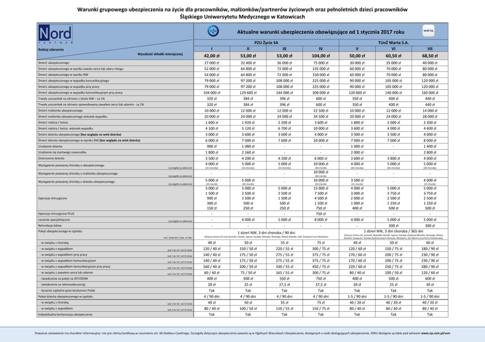 Warunki grupowego ubezpieczenia na życie dla pracowników, małżonków/partnerów życiowych oraz pełnoletnich dzieci pracowników Śląskiego Uniwersytetu Medycznego w Katowicach Aktualne warunki ubezpieczenia obowiązujące od 1 stycznia 2017 roku PZU Życie SA Rodzaj zdarzenia Wysokość składki miesięcznej Śmierć ubezpieczonego Śmierć ubezpieczonego w wyniku zawału serca lub udaru mózgu Śmierć ubezpieczonego w wyniku NW Śmierć ubezpieczonego w wypadku komunikacyjnego Śmierć ubezpieczonego w wypadku przy pracy Śmierć ubezpieczonego w wypadku komunikacyjnym przy pracy Trwały uszczerbek na zdrowiu z tytułu NW – za 1% Trwały uszczerbek na zdrowiu spowodowany zawałem serca lub udarem - za 1% Śmierć małżonka ubezpieczonego Śmierć małżonka ubezpieczonego wskutek wypadku Śmierć rodzica / teścia Śmierć rodzica / teścia wskutek wypadku Śmierć dziecka ubezpieczonego (bez względu na wiek dziecka) Śmierć dziecka ubezpieczonego w wyniku NW (bez względu na wiek dziecka) Urodzenie dziecka Urodzenie się martwego noworodka Osierocenie dziecka Wystąpienie poważnej choroby u ubezpieczonego Wystąpienie poważnej choroby u małżonka ubezpieczonego Wystąpienie poważnej choroby u dziecka ubezpieczonego (szczegóły na odwrocie) (szczegóły na odwrocie) (szczegóły na odwrocie) Operacje chirurgiczne Operacje chirurgiczne PLUS Leczenie specjalistyczne (szczegóły na odwrocie) Refundacja leków I II III IV V TUnŻ Warta S.A. VI VII 42,00 zł 53,00 zł 53,00 zł 104,00 zł 50,00 zł 60,50 zł 68,50 zł 27 000 zł 52 000 zł 54 000 zł 79 000 zł 79 000 zł 104 000 zł 320 zł 320 zł 10 000 zł 20 000 zł 1 600 zł 4 100 zł 3 000 zł 6 000 zł 900 zł 1 800 zł 3 500 zł 4 000 zł 32 400 zł 64 800 zł 64 800 zł 97 200 zł 97 200 zł 129 600 zł 384 zł 384 zł 12 000 zł 24 000 zł 1 920 zł 5 120 zł 3 600 zł 7 000 zł 1 080 zł 2 160 zł 4 200 zł 5 000 zł 36 000 zł 72 000 zł 72 000 zł 108 000 zł 108 000 zł 144 000 zł 396 zł 396 zł 12 000 zł 24 000 zł 2 200 zł 6 700 zł 3 600 zł 7 600 zł 4 200 zł 5 000 zł 75 000 zł 135 000 zł 150 000 zł 225 000 zł 225 000 zł 300 000 zł 600 zł 600 zł 22 500 zł 34 500 zł 3 600 zł 10 000 zł 4 000 zł 10 000 zł 6 000 zł 10 000 zł 30 000 zł 60 000 zł 60 000 zł 90 000 zł 90 000 zł 120 000 zł 350 zł 350 zł 10 000 zł 20 000 zł 1 800 zł 3 600 zł 3 500 zł 7 000 zł 1 000 zł 2 000 zł 3 600 zł 4 000 zł 35 000 zł 70 000 zł 70 000 zł 105 000 zł 105 000 zł 140 000 zł 400 zł 400 zł 12 000 zł 24 000 zł 2 000 zł 4 000 zł 3 500 zł 7 000 zł 3 800 zł 5 000 zł 40 000 zł 80 000 zł 80 000 zł 120 000 zł 120 000 zł 160 000 zł 440 zł 440 zł 14 000 zł 28 000 zł 2 200 zł 4 400 zł 4 000 zł 8 000 zł 1 400 zł 2 800 zł 4 000 zł 5 000 zł (22 choroby) (22 choroby) (22 choroby) (36 chorób) (44 choroby) (44 choroby) (44 choroby) - - - - 4 000 zł - - - 10 000 zł 5 000 zł 5 000 zł 3 500 zł (20 chorób) - 10 000 zł (20 chorób) (20 chorób) (21 chorób) 3 000 zł 1 500 zł 900 zł 300 zł 150 zł - 5 000 zł 2 500 zł 1 500 zł 500 zł 250 zł 4 000 zł - 5 000 zł 2 500 zł 1 500 zł 500 zł 250 zł 5 000 zł - 15 000 zł 7 500 zł 4 500 zł 1 500 zł 750 zł 750 zł 8 000 zł - 4 000 zł 3 000 zł 2 000 zł 1 000 zł 400 zł 4 000 zł - Pobyt ubezpieczonego w szpitalu: 1 dzień NW, 3 dni choroba / 90 dni min. liczba dni / max. w roku - w związku z chorobą - w związku z wypadkiem (od 1 do 14 / od 15 dnia) - w związku z wypadkiem przy pracy (od 1 do 14 / od 15 dnia) - w związku z wypadkiem komunikacyjnym (od 1 do 14 / od 15 dnia) - w związku z wypadkiem komunikacyjnym przy pracy (od 1 do 14 / od 15 dnia) - w związku z zawałem serca lub udarem (od 1 do 14 / od 15 dnia) - świadczenie za pobyt na OIT/OIOM - świadczenie za rekonwalescencję - leczenie szpitalne poza terytorium Polski Pobyt dziecka ubezpieczonego w szpitalu: - w związku z chorobą (od 1 do 14 / od 15 dnia) - w związku z wypadkiem (od 1 do 14 / od 15 dnia) Indywidualna kontynuacja ubezpieczenia (36 chorób) Dotyczy terenu UE oraz Australii, Islandii, Japonii, Kanady, Monako, Norwegii, Nowej Zelandii, USA, Szwajcarii oraz Watykanu. 40 zł 120 / 40 zł 140 / 40 zł 140 / 40 zł 160 / 40 zł 60 / 40 zł 400 zł 20 zł Tak 4 / 90 dni 40 zł 80 / 40 zł Tak 50 zł 150 / 50 zł 175 / 50 zł 175 / 50 zł 200 / 50 zł 75 / 50 zł 500 zł 25 zł Tak 4 / 90 dni 50 zł 100 / 50 zł Tak 55 zł 220 / 55 zł 275 / 55 zł 275 / 55 zł 330 / 55 zł 165 / 55 zł 550 zł 27,5 zł Tak 4 / 90 dni 55 zł 110 / 55 zł Tak 75 zł 300 / 75 zł 375 / 75 zł 375 / 75 zł 450 / 75 zł 300 / 75 zł 750 zł 37,5 zł Tak 4 / 90 dni 75 zł 150 / 75 zł Tak (21 chorób) 5 000 zł 5 000 zł 3 750 zł 3 750 zł 2 500 zł 2 500 zł 1 250 zł 1 250 zł 500 zł 500 zł 5 000 zł 5 000 zł 300 zł 300 zł 1 dzień NW, 3 dni choroba / 365 dni Dotyczy terenu UE, Australii, Republiki Islandii, Japonii, Kanady, Księstwa Monako, Norwegii, Nowej Zelandii, Szwajcarii, Stanów Zjednoczonych Ameryki, Watykanu, San Marino oraz Korei Południowej. 40 zł 120 / 60 zł 170 / 60 zł 170 / 60 zł 220 / 60 zł 80 / 40 zł 400 zł 20 zł Tak 1-5 / 90 dni 40 / 20 zł 80 / 40 zł Tak 50 zł 150 / 75 zł 200 / 75 zł 200 / 75 zł 250 / 75 zł 100 / 50 zł 500 zł 25 zł Tak 1-5 / 90 dni 40 / 20 zł 80 / 40 zł Tak 60 zł 180 / 90 zł 230 / 90 zł 230 / 90 zł 280 / 90 zł 120 / 60 zł 600 zł 30 zł Tak 1-5 / 90 dni 40 / 20 zł 80 / 40 zł Tak Powyższe zestawienie ma charakter informacyjny i nie jest ofertą handlową w rozumieniu art. 66 Kodeksu Cywilnego. Szczegóły dotyczące ubezpieczenia zawarte są w Ogólnych Warunkach Ubezpieczenia, dostępnych u osób obsługujących ubezpieczenie, OWU dostępne są także pod adresem www.np.com.pl/sum Oferta PZU Życie SA Oferta TUnŻ Warta S.A. Do oferty mogą przystąpić pracownicy, którzy nie ukończyli 80 lat, a członkowie rodziny jeśli nie ukończyli 69 roku życia. Do ubezpieczenia mogą przystąpi