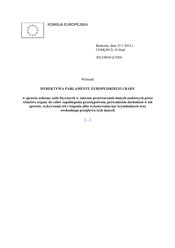 KOMISJA EUROPEJSKA Bruksela, dnia 25.1.2012 r. COM(2012) 10 final 2012/0010 (COD) Wniosek DYREKTYWA PARLAMENTU EUROPEJSKIEGO I RADY w sprawie ochrony osób fizycznych w zakresie przetwarzania danych osobowych przez właściwe organy do celów zapobiegania przestępstwom, prowadzenia dochodzeń w ich sprawie, wykrywania ich i ścigania albo wykonywania kar kryminalnych oraz swobodnego przepływu tych danych […] UZASADNIENIE 1. KONTEKST WNIOSKU Niniejsze uzasadnienie zawiera dalsze szczegóły na temat podejścia do nowych ram prawnych ochrony danych osobowych w UE przedstawionego w komunikacie COM (2012) 9 wersja ostateczna. Na ramy prawne składają się dwa wnioski ustawodawcze: – wniosku dotyczącego rozporządzenia Parlamentu Europejskiego i Rady w sprawie ochrony osób fizycznych w zakresie przetwarzania danych osobowych i swobodnego przepływu tych danych (ogólne rozporządzenie o ochronie danych), oraz – wniosku dotyczącego dyrektywy Parlamentu Europejskiego i Rady w sprawie ochrony osób fizycznych w związku z przetwarzaniem danych osobowych przez właściwe organy na potrzeby zapobiegania przestępstwom, prowadzenia dochodzeń w ich sprawie, wykrywania ich i ścigania lub wykonywania kar kryminalnych oraz swobodnego przepływu takich danych Niniejsze uzasadnienie dotyczy tego drugiego wniosku. Podstawowy dokument ustanawiający obowiązujące unijne przepisy o ochronie danych, dyrektywa 95/46/WE1, został przyjęty w 1995 r. z myślą o realizacji dwóch celów: ochrony podstawowego prawa do ochrony danych oraz zagwarantowania swobodnego przepływu danych między państwami członkowskimi Została ona uzupełniona przez szereg instrumentów przewidujących przepisy szczególne o ochronie danych w obszarze współpracy policyjnej i współpracy wymiarów sprawiedliwości w sprawach karnych2 (były trzeci filar), w tym decyzję ramową 2008/977/WSiSW3. Rada Europejska wezwała Komisję do oceny funkcjonowania unijnych instrumentów o ochronie danych oraz przedstawienia, w razie potrzeby, dalszych inicjatyw ustawodawczych lub o charakterze nieustawodawczym4. W rezolucji w sprawie programu sztokholmskiego5 Parlament Europejski poparł koncepcję kompleksowego systemu ochrony danych w UE, wzywając między innymi do rewizji decyzji ramowej. Komisja podkreśliła w swoim planie działania służącym realizacji programu sztokholmskiego6 potrzebę zagwarantowania konsekwentnego stosowania podstawowego prawa do ochrony danych osobowych w kontekście wszystkich polityk UE. W planie działania podkreślono, że „w społeczeństwie globalnym charakteryzującym się szybkimi zmianami technologicznymi i nieograniczonym przepływem informacji szczególne znaczenie ma zachowanie ochrony prywatności. Unia musi zagwarantować spójne wykonywanie prawa do ochrony danych, będącego jednym z 1 2 3 4 5 6 PL Dyrektywa 95/46/WE Parlamentu Europejskiego i Rady z dnia 24 października 1995 r. w sprawie ochrony osób fizycznych w zakresie przetwarzania danych osobowych i swobodnego przepływu tych danych, Dz.U. L 281 z 23.11.1995, s. 31. Zob. pełny wykaz w załączniku 3 do oceny skutków (SEC(2012)72).. Decyzja ramowa Rady 2008/977/WSiSW z dnia 27 listopada 2008 r. w sprawie ochrony danych osobowych przetwarzanych w ramach współpracy policyjnej i sądowej w sprawach karnych, Dz.U. L 350 z 30.12.2008, s. 60. W programie sztokholmskim - Dz. U. C 115 z 4.5.2010, s. 1 Zob. rezolucję Parlamentu Europejskiego w sprawie programu sztokholmskiego przyjętą w dniu 25 listopada 2009 r. COM (2010) 171 wersja ostateczna. 2 PL praw podstawowych. Należy wzmocnić stanowisko UE dotyczące ochrony danych osobowych w kontekście wszystkich obszarów polityki UE, w tym w dziedzinie egzekwowania prawa i zapobiegania przestępstwom, a także w dziedzinie stosunków międzynarodowych”. W komunikacie w sprawie „Całościowego podejścia do kwestii ochrony danych osobowych w Unii Europejskiej”7 Komisja stwierdziła, że UE potrzebuje bardziej całościowej i spójnej polityki w zakresie podstawowego prawa do ochrony danych osobowych. Decyzja ramowa 2008/977/WSiSW ma ograniczony zakres zastosowania, ponieważ dotyczy wyłącznie transgranicznego przetwarzania danych, ale nie obejmuje ich przetwarzania przez organy policyjne i sądowe na szczeblu czysto krajowym. Może to powodować trudności dla policji i innych właściwych organów w obszarze współpracy wymiarów sprawiedliwości w sprawach karnych i współpracy policyjnej. Nie zawsze są w stanie łatwo rozróżnić między przetwarzaniem mającym charakter czysto wewnętrzny i transgraniczny czy też przewidzieć, czy określone dane staną się na późniejszym etapie przedmiotem transgranicznej wymiany (zob. pkt 2 poniżej). Ponadto ze względu na swój charakter i treść decyzja ramowa pozostawia państwom członkowskim dużą swobodę manewru, jeżeli chodzi o krajowe przepisy wdrażające przepisy decyzji. Poza tym nie zawiera ona żadnych mechanizmów ani nie przewiduje grupy doradczej podobnej do Grupy Roboczej Art. 29, które służyłyby promowaniu wspólnej wykładni przepisów decyzji ani też nie przewiduje żadnych uprawnień wykonawczych dla Komisji, aby zagwarantować wspólne podejście we wdrażaniu decyzji. Artykuł 16 ust. 1 Traktatu o funkcjonowaniu Unii Europejskiej (TFUE) ustanawia zasadę, że każdy ma prawo do ochrony danych osobowych. Ponadto w art. 16 ust. 2 TFUE traktat lizboński wprowadza szczególną podstawę prawną dla przyjmowania norm dotyczących ochrony danych osobowych, która znajduje zastosowanie także do współpracy wymiarów sprawiedliwości w sprawach karnych oraz współpracy policyjnej. W art. 8 Karty praw podstawowych UE zapisano ochronę danych osobowych jako jedno z praw podstawowych. Artykuł 16 TFUE nakłada na prawodawcę obowiązek ustanowienia przepisów dotyczących ochrony osób fizycznych w zakresie przetwarzania danych także w obszarze współpracy policyjnej i współpracy wymiarów s