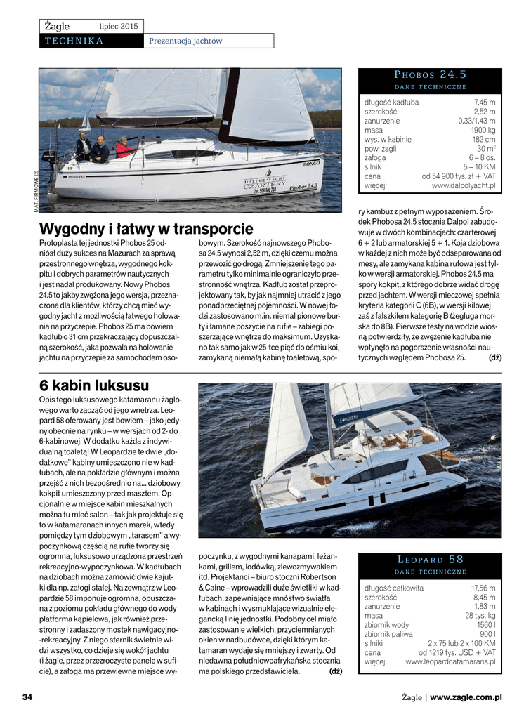 Żagle lipiec 2015 TECHNIK A Prezentacja jachtów P h o b o s 24.5 da n e t ec h n ic z n e MAT. FIRMOWE (2) długość kadłuba 7,45 m szerokość 2,52 m zanurzenie 0,33/1,43 m masa 1900 kg wys. w kabinie 182 cm pow. żagli 30 m2 załoga 6 – 8 os. silnik 5 – 10 KM cena od 54 900 tys. zł + VAT więcej: www.dalpolyacht.pl Wygodny i łatwy w transporcie Protoplasta tej jednostki Phobos 25 odniósł duży sukces na Mazurach za sprawą przestronnego wnętrza, wygodnego kokpitu i dobrych parametrów nautycznych i jest nadal produkowany. Nowy Phobos 24.5 to jakby zwężona jego wersja, przeznaczona dla klientów, którzy chcą mieć wygodny jacht z możliwością łatwego holowania na przyczepie. Phobos 25 ma bowiem kadłub o 31 cm przekraczający dopuszczalną szerokość, jaka pozwala na holowanie jachtu na przyczepie za samochodem oso- bowym. Szerokość najnowszego Phobosa 24.5 wynosi 2,52 m, dzięki czemu można przewozić go drogą. Zmniejszenie tego parametru tylko minimalnie ograniczyło przestronność wnętrza. Kadłub został przeprojektowany tak, by jak najmniej utracić z jego ponadprzeciętnej pojemności. W nowej łodzi zastosowano m.in. niemal pionowe burty i łamane poszycie na rufie – zabiegi poszerzające wnętrze do maksimum. Uzyskano tak samo jak w 25-tce pięć do ośmiu koi, zamykaną niemałą kabinę toaletową, spo- ry kambuz z pełnym wyposażeniem. Środek Phobosa 24.5 stocznia Dalpol zabudowuje w dwóch kombinacjach: czarterowej 6 + 2 lub armatorskiej 5 + 1. Koja dziobowa w każdej z nich może być odseparowana od mesy, ale zamykana kabina rufowa jest tylko w wersji armatorskiej. Phobos 24.5 ma spory kokpit, z którego dobrze widać drogę przed jachtem. W wersji mieczowej spełnia kryteria kategorii C (6B), w wersji kilowej zaś z falszkilem kategorię B (żegluga morska do 8B). Pierwsze testy na wodzie wiosną potwierdziły, że zwężenie kadłuba nie wpłynęło na pogorszenie własności nautycznych względem Phobosa 25. (dż) 6 kabin luksusu Opis tego luksusowego katamaranu żaglowego warto zacząć od jego wnętrza. Leopard 58 oferowany jest bowiem – jako jedyny obecnie na rynku – w wersjach od 2- do 6-kabinowej. W dodatku każda z indywidualną toaletą! W Leopardzie te dwie „dodatkowe” kabiny umieszczono nie w kadłubach, ale na pokładzie głównym i można przejść z nich bezpośrednio na... dziobowy kokpit umieszczony przed masztem. Opcjonalnie w miejsce kabin mieszkalnych można tu mieć salon – tak jak projektuje się to w katamaranach innych marek, wtedy pomiędzy tym dziobowym „tarasem” a wypoczynkową częścią na rufie tworzy się ogromna, luksusowo urządzona przestrzeń rekreacyjno-wypoczynkowa. W kadłubach na dziobach można zamówić dwie kajutki dla np. załogi stałej. Na zewnątrz w Leopardzie 58 imponuje ogromna, opuszczana z poziomu pokładu głównego do wody platforma kąpielowa, jak również przestronny i zadaszony mostek nawigacyjno-rekreacyjny. Z niego sternik świetnie widzi wszystko, co dzieje się wokół jachtu (i żagle, przez przezroczyste panele w suficie), a załoga ma przewiewne miejsce wy- 34 poczynku, z wygodnymi kanapami, leżankami, grillem, lodówką, zlewozmywakiem itd. Projektanci – biuro stoczni Robertson & Caine – wprowadzili duże świetliki w kadłubach, zapewniające mnóstwo światła w kabinach i wysmuklające wizualnie elegancką linię jednostki. Podobny cel miało zastosowanie wielkich, przyciemnianych okien w nadbudówce, dzięki którym katamaran wydaje się mniejszy i zwarty. Od niedawna południowoafrykańska stocznia ma polskiego przedstawiciela. (dż) L e o pa r d 58 da n e t ec h n ic z n e długość całkowita 17,56 m szerokość 8,45 m zanurzenie 1,83 m masa 28 tys. kg zbiornik wody 1560 l zbiornik paliwa 900 l silniki 2 x 75 lub 2 x 100 KM cena od 1219 tys. USD + VAT więcej: www.leopardcatamarans.pl Żagle | www.zagle.com.pl