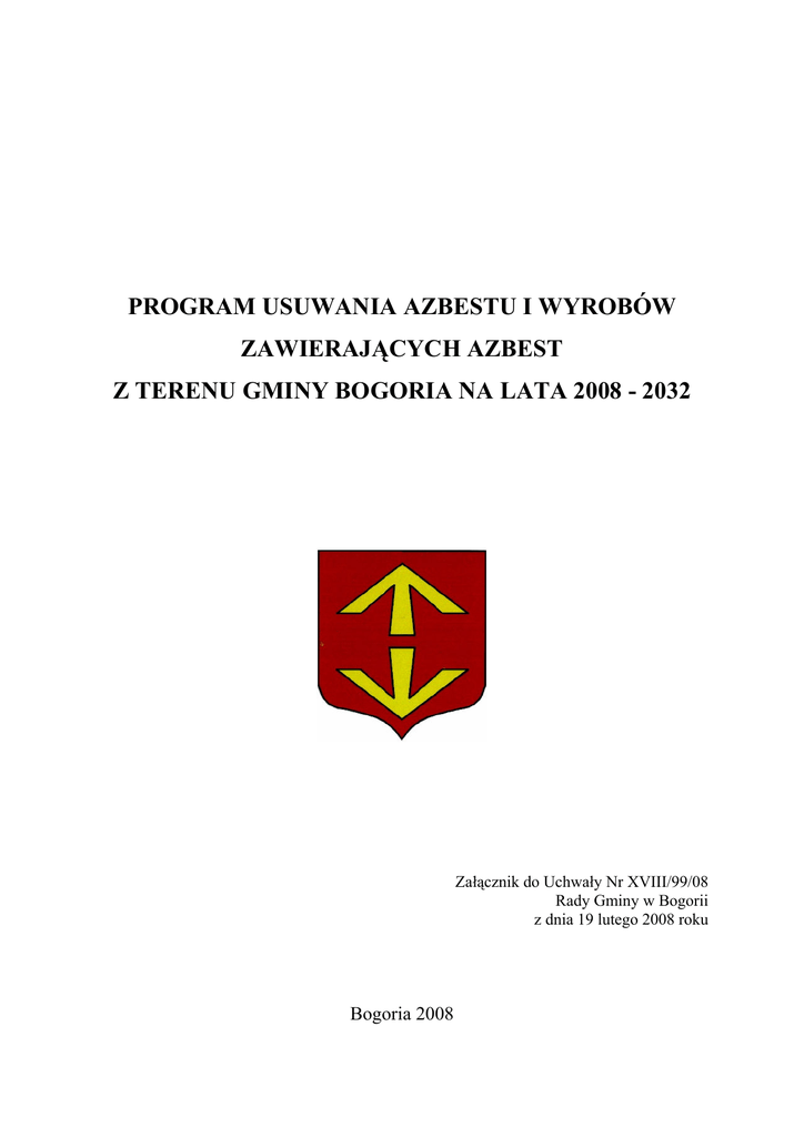 PROGRAM USUWANIA AZBESTU I WYROBÓW ZAWIERAJĄCYCH AZBEST Z TERENU GMINY BOGORIA NA LATA 2008 - 2032 Załącznik do Uchwały Nr XVIII/99/08 Rady Gminy w Bogorii z dnia 19 lutego 2008 roku Bogoria 2008 Program usuwania azbestu i wyrobów zawierających azbest z terenu Gminy Bogoria na lata 2008 - 2032 Spis treści WPROWADZENIE ........................................................................................................ 3 CEL I ZADANIA PROGRAMU ................................................................................... 5 SZKODLIWOŚĆ AZBESTU......................................................................................... 6 POSTĘPOWANIE Z WYROBAMI ZAWIERAJĄCYMI AZBEST ........................ 7 STAN FAKTYCZNY W 2006 ROKU ORAZ WSTĘPNE KOSZTY USUNIĘCIA WYROBÓW ZAWIERAJĄCYCH AZBEST ............................................................ 10 VI. ZAŁOŻENIA PROGRAMU........................................................................................ 13 1. Utworzenie i aktualizacja wykazów danych o lokalizacji wyrobów zawierających azbest............................................................................................... 13 2. Uczestnicy Programu .............................................................................................. 13 3. Edukacja mieszkańców w zakresie szkodliwości azbestu, obowiązków dotyczących postępowania z wyrobami zawierającymi azbest oraz sposobie bezpiecznego ich usuwania i unieszkodliwiania ................................................... 14 4. Mobilizowanie właścicieli budynków i obiektów przemysłowych do usunięcia wyrobów zawierających azbest poprzez system pomocy edukacyjnej i finansowej .............................................................................................................. 14 5. Pomoc w odbiorze i unieszkodliwianiu odpadów azbestowych z nieruchomości osób fizycznych (w późniejszym terminie w miarę możliwości finansowych również z nieruchomości wspólnot mieszkaniowych, jednostek budżetowych, zakładów budżetowych i innych) ........................................................................... 15 6. Podjęcie działań w kierunku pozyskania funduszy ze źródeł zewnętrznych na realizację Programu........................................................................................... 16 7. Przeznaczenie środków finansowych z Gminnego Funduszu Ochrony Środowiska (GFOŚ), zwanego dalej Gminnym Funduszem oraz ze źródeł zewnętrznych ........................................................................................................... 16 8. Usunięcie wyrobów zawierających azbest z obiektów użyteczności publicznej i innych będących własnością Gminy Bogoria...................................................... 16 9. Eliminację możliwości powstawania „dzikich” wysypisk z odpadami zawierającymi azbest .............................................................................................. 17 10. Bieżący monitoring realizacji Programu i okresowe raportowanie jego realizacji władzom samorządowym i mieszkańcom............................................. 17 11. Okresowa weryfikacja i aktualizacja Programu.................................................. 18 VII. HARMONOGRAM REALIZACJI „PROGRAMU USUWANIA AZBESTU I WYROBÓW ZAWIERAJĄCYCH AZBEST Z TERENU GMINY BOGORIA NA LATA 2008 – 2032” ................................................................................................ 18 VIII. OBOWIĄZUJĄCE W POLSCE PRZEPISY PRAWNE DOTYCZĄCE AZBESTU ORAZ OCHRONY PRZED JEGO SZKODLIWOŚCIĄ ......................................... 19 1. Ustawy ........................................................................................................................ 19 2. Rozporządzenia ......................................................................................................... 21 3. Programy.................................................................................................................... 24 I. II. III. IV. V. Strona 2 z 24 Program usuwania azbestu i wyrobów zawierających azbest z terenu Gminy Bogoria na lata 2008 - 2032 I. WPROWADZENIE Gmina Bogoria począwszy od 2008 roku przystępuje przy pomocy niniejszego Programu usuwania azbestu i wyrobów zawierających azbest z terenu Gminy Bogoria na lata 2008 – 2032, zwanego dalej Programem, do realizacji zadań wynikających z „Programu usuwania azbestu i wyrobów zawierających azbest stosowanych na terytorium Polski” przyjętego przez Radę Ministrów Rzeczypospolitej Polskiej 14 maja 2002 roku. Program ten zakłada do 2032 roku oczyszczenie i usunięcie z terytorium Polski stosowanych od wielu lat wyrobów zawierających azbest. W związku z tym wynikła konieczność opracowania programu usuwania azbestu i wyrobów zawierających azbest z terenu Gminy Bogoria. W/w zadanie zostało również ujęte w Planie Gospodarki Odpadami dla Ekologicznego Związku Gmin Dorzecza Koprzywianki, jak również w Aktualizacji w/w Planu. Do obowiązków samorządu gminy wynikających z „Programu…” należy: 1. Uwzględnienie usuwania azbestu i wyrobów zawierających azbest w gminnych planach gospodarki odpadami. 2. Współpraca z lokalnymi mediami celem rozpowszechniania informacji dotyczących zagrożeń powodowanych przez azbest oraz wyroby z azbestem. 3. Przygotowanie wykazów obiektów zawierających azbest oraz rejonów występującego narażenia na ekspozycję azbestu. 4. Przygotowanie rocznych sprawozdań finansowych z realizacji zadań „Programu…” Azbest znany jest od kilkuset lat. Szerokie jego zastosowanie nastąpiło w wyniku rewolucji przemysłowej w okresie ostatnich 100 lat. Stosowany był w produkcji około 3000 wyrobów przemysłowych, przede wszystkim do produkcji wyrobów budowlanych, szczególnie płyt dachowych i elewacyjnych, a także rur. Z uwagi na swoje niewątpliwe zalety, jak odporność na wysokie tempe